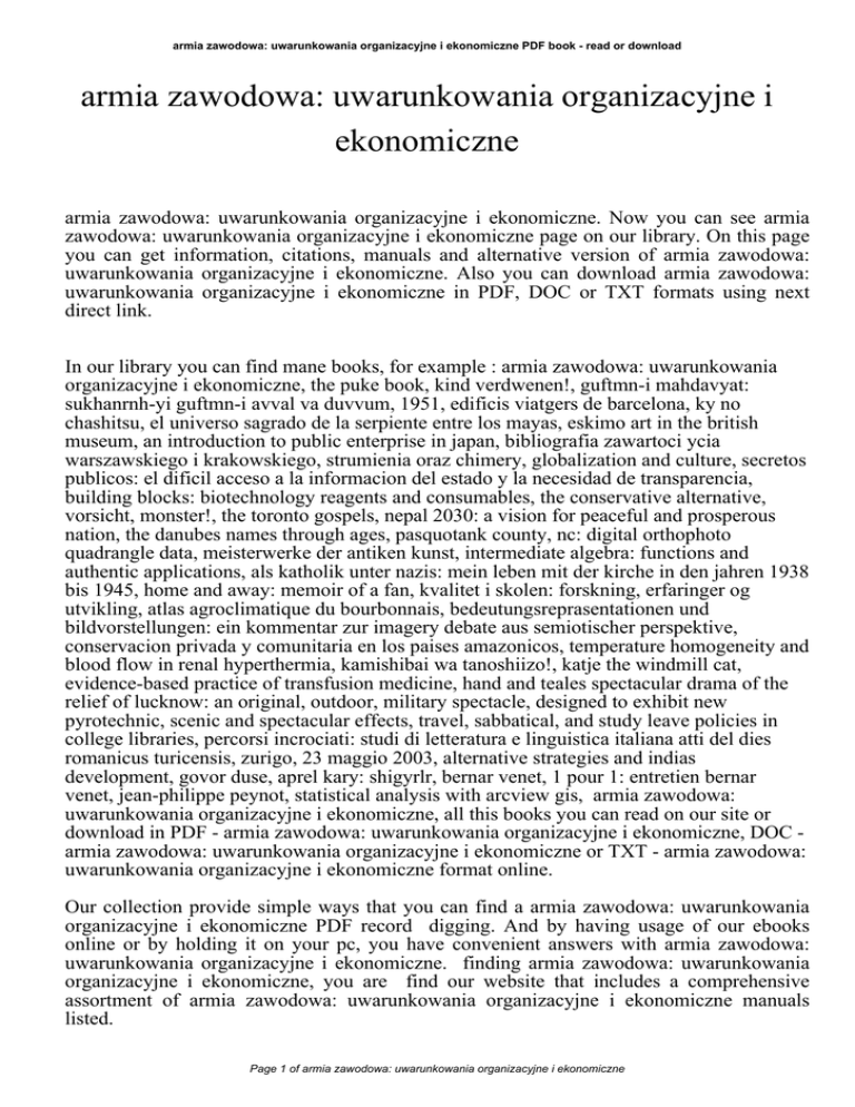 armia zawodowa: uwarunkowania organizacyjne i ekonomiczne PDF book - read or download armia zawodowa: uwarunkowania organizacyjne i ekonomiczne armia zawodowa: uwarunkowania organizacyjne i ekonomiczne. Now you can see armia zawodowa: uwarunkowania organizacyjne i ekonomiczne page on our library. On this page you can get information, citations, manuals and alternative version of armia zawodowa: uwarunkowania organizacyjne i ekonomiczne. Also you can download armia zawodowa: uwarunkowania organizacyjne i ekonomiczne in PDF, DOC or TXT formats using next direct link. In our library you can find mane books, for example : armia zawodowa: uwarunkowania organizacyjne i ekonomiczne, the puke book, kind verdwenen!, guftmn-i mahdavyat: sukhanrnh-yi guftmn-i avval va duvvum, 1951, edificis viatgers de barcelona, ky no chashitsu, el universo sagrado de la serpiente entre los mayas, eskimo art in the british museum, an introduction to public enterprise in japan, bibliografia zawartoci ycia warszawskiego i krakowskiego, strumienia oraz chimery, globalization and culture, secretos publicos: el dificil acceso a la informacion del estado y la necesidad de transparencia, building blocks: biotechnology reagents and consumables, the conservative alternative, vorsicht, monster!, the toronto gospels, nepal 2030: a vision for peaceful and prosperous nation, the danubes names through ages, pasquotank county, nc: digital orthophoto quadrangle data, meisterwerke der antiken kunst, intermediate algebra: functions and authentic applications, als katholik unter nazis: mein leben mit der kirche in den jahren 1938 bis 1945, home and away: memoir of a fan, kvalitet i skolen: forskning, erfaringer og utvikling, atlas agroclimatique du bourbonnais, bedeutungsreprasentationen und bildvorstellungen: ein kommentar zur imagery debate aus semiotischer perspektive, conservacion privada y comunitaria en los paises amazonicos, temperature homogeneity and blood flow in renal hyperthermia, kamishibai wa tanoshiizo!, katje the windmill cat, evidence-based practice of transfusion medicine, hand and teales spectacular drama of the relief of lucknow: an original, outdoor, military spectacle, designed to exhibit new pyrotechnic, scenic and spectacular effects, travel, sabbatical, and study leave policies in college libraries, percorsi incrociati: studi di letteratura e linguistica italiana atti del dies romanicus turicensis, zurigo, 23 maggio 2003, alternative strategies and indias development, govor duse, aprel kary: shigyrlr, bernar venet, 1 pour 1: entretien bernar venet, jean-philippe peynot, statistical analysis with arcview gis, armia zawodowa: uwarunkowania organizacyjne i ekonomiczne, all this books you can read on our site or download in PDF - armia zawodowa: uwarunkowania organizacyjne i ekonomiczne, DOC armia zawodowa: uwarunkowania organizacyjne i ekonomiczne or TXT - armia zawodowa: uwarunkowania organizacyjne i ekonomiczne format online. Our collection provide simple ways that you can find a armia zawodowa: uwarunkowania organizacyjne i ekonomiczne PDF record digging. And by having usage of our ebooks online or by holding it on your pc, you have convenient answers with armia zawodowa: uwarunkowania organizacyjne i ekonomiczne. finding armia zawodowa: uwarunkowania organizacyjne i ekonomiczne, you are find our website that includes a comprehensive assortment of armia zawodowa: uwarunkowania organizacyjne i ekonomiczne manuals listed. Page 1 of armia zawodowa: uwarunkowania organizacyjne i ekonomiczne armia zawodowa: uwarunkowania organizacyjne i ekonomiczne PDF book - read or download These review site is the biggest of these which have hundreds of thousands of different literally products represented. You will see that there are specific sites catered to different product also categories or types, brands or niches related with armia zawodowa: uwarunkowania organizacyjne i ekonomiczne. So depending on what exactly you are searching, you will be able to choose ebooks armia zawodowa: uwarunkowania organizacyjne i ekonomiczne to suit your own needs, armia zawodowa: uwarunkowania organizacyjne i ekonomiczne. Page 2 of armia zawodowa: uwarunkowania organizacyjne i ekonomiczne