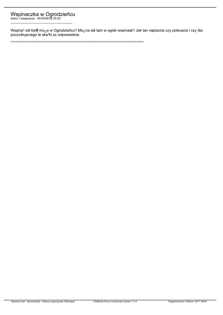 Wspinaczka w Ogrodzieñcu Autor: t.kasprzyca - 2010/04/29 20:33 _____________________________________ Wspina³ siê kto¶ mo¿e w Ogrodzieñcu? Mo¿na siê tam w ogóle wspinaæ? Jak tan napiszcie czy polecacie i czy dla pocz±tkuj±cego te ska³ki s± odpowiednie. ============================================================================ Sportowy Styl - SportowyStyl - Aktywny wypoczynek, Rekreacja FireBoard Forum Component version: 1.0.4 Wygenerowano: 8 March, 2017, 09:05