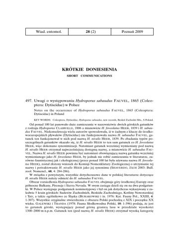 Wiad. entomol. 28 (2) Poznań 2009 KRÓTKIE DONIESIENIA SHORT COMMUNICATIONS 497. Uwagi o występowaniu Hydroporus sabaudus FAUVEL, 1865 (Coleoptera: Dytiscidae) w Polsce Notes on the occurrence of Hydroporus sabaudus F AUVEL , 1865 (Coleoptera: Dytiscidae) in Poland KEY WORDS: Coleoptera, Dytiscidae, Hydroporus sabaudus, new records, Beskid Zachodni Mts., S Poland. Od ponad 100 lat panowało duże zamieszanie w nazewnictwie dwóch górskich gatunków z rodzaju Hydroporus CLAIRVILLE, 1806 a mianowicie H. foveolatus HEER, 1839 i H. sabaudus FAUVEL. Niekonsekwecja wielu autorów spowodowała, iż w żadnym z kluczy do środkowoeuropejskich pływaków (Dytiscidae) nie funkcjonowała nazwa H. sabaudus FAUVEL, gatunek ten funkcjonował w nich pod nazwą H. nivalis HEER, 1839. Po zbadaniu typów poszczególnych gatunków okazało się, iż H. nivalis HEER to ten sam gatunek co H. foveolatus HEER, więc dokonano synonimizacji. Natomiast gatunek wcześniej wymieniany pod nazwą H. nivalis HEER otrzymał najwcześniejszą dostępną nazwę, a mianowicie H. sabaudus FAUVEL. Nazwa H. nivalis HEER powinna być natomiast obowiązującą nazwą gatunku wcześniej wymienianego jako H. foveolatus HEER, by jednak nie robić zamieszania w literaturze, zarówno faunistycznej jak i ekologicznej (przez ponad 100 lat była używana nazwa H. foveolatus HEER), został złożony wniosek do Komisji Nomenklatury Zoologicznej o utrzymanie tej nazwy i potraktowanie H. nivalis HEER jako jej synonimu (SHAVERDO, JÄCH 2003: Bull. zool. Nomencl., 60, 4: 284-286). W związku z powyższym, wszystkie dotychczasowe dane w polskiej literaturze dotyczące H. nivalis HEER należy odnieść do H. sabaudus FAUVEL. Obszar rozsiedlenia Hydroporus sabaudus FAUVEL obejmuje góry środkowej Europy oraz północne Bałkany, Pireneje i Sierra Nevada. W swym zasięgu dzieli się on na dwa podgatunki. W Polsce występuje podgatunek nominotypowy i był on jak dotychczas wykazywany z zaledwie 5 krain górskich: Sudetów Zachodnich, Beskidu Zachodniego, Kotliny Nowotarskiej i Tatr, a także ogólnikowo ze Śląska (BURAKOWSKI i in. 1976: Kat. Fauny Pol., XXIII, 4: 1-307). Wszystkie oryginalne stwierdzenia z obszaru Polski pochodzą z XIX i początku XX wieku. GALEWSKI i TRANDA (1978: Fauna Słodkowodna Polski, 10: 1-396) podają, że jest to gatunek górski, występujący ponad górną granicą lasu w przedziale wysokości 1300–2000 m n.p.m. Gatunek ten (pod nazwą H. nivalis HEER) otrzymał wysoką kategorię 132 KRÓTKIE DONIESIENIA zagrożenia EN na polskiej czerwonej liście zwierząt (PAWŁOWSKI i in. 2002: [W]: GŁOWACIŃSKI (red.): Czerwona lista zwierząt ginących i zagrożonych w Polsce. IOP PAN, Kraków: 88-110). W trakcie badań nad fauną chrząszczy wodnych Beskidu Śląskiego stwierdzono nowe stanowisko tego bardzo rzadko spotykanego w Polsce gatunku chrząszcza: – Beskid Zachodni: rezerwat „Barania Góra” (CV59), 14 VIII 2005 – 3 exx.; 15 VIII 2005 – 5 exx., 21 IX 2008 – 50 exx., młaka torfowiskowa w reglu górnym ok. 1150–1190 m n.p.m., leg. Cz. GREŃ. Wszystkie osobniki odłowione zostały w młakach torfowiskowych (Carici canescentisAgrostietum caninae oraz Sphagno fallacis-Eriophoretum vaginati) występujących w górnych partiach źródlisk Czarnej Wisełki na Baraniej Górze. Młaki zajmują powierzchnię od kilku do kilkudziesięciu m 2 w płaskich zagłębieniach terenu w obrębie górnoreglowego boru świerkowego (Plagiothecio-Piceetum). Wraz z H. sabaudus odłowiono H. nigrita (FABRICIUS, 1792), H. incognitus SHARP, 1869 i Agabus melanarius AUBÉ, 1837. Zarówno obecne stanowisko, jak i poprzednie z Beskidu Zachodniego (okolice Żywca i Krynicy) dowodzą, iż gatunek ten występuje nie tylko ponad górną granicą lasu, ale już w piętrze regla górnego, które w Beskidzie Śląskim rozpoczyna się od ok. 1000 m n.p.m. Jest to zarazem potwierdzenie występowania tego gatunku w Beskidzie Zachodnim po prawie 100 latach i jedyne współczesne stanowisko w Polsce Badania na terenie rezerwatu prowadzono na podstawie Decyzji Wojewody Śląskiego w Katowicach. Okazy dowodowe znajdują się w zbiorach pierwszego autora i Muzeum Górnośląskiego w Bytomiu. Czesław GREŃ, Ruda Śląska Marek PRZEWOŹNY, Wydział Biologii UAM, Zakł. Zool Syst., Poznań 498. Nowe dane o rozmieszczeniu kilkunastu rzadkich gatunków ryjkowców (Coleoptera: Curculionoidea) w Polsce New records of several rare weevil species (Coleoptera: Curculionoidea) from Poland KEY WORDS: Coleoptera, Attelabidae, Apionidae, Curculionidae, new records, Poland. Przedstawione niżej informacje dotyczą 12 gatunków z rodzin Attelabidae, Apionidae i Curculionidae, stwierdzonych w trakcie badań terenowych autora w latach 2003–2008. Są to pierwsze doniesienia z wymienionych krain (oznaczone gwiazdką; regionalizacja wg „Katalogu fauny Polski” – dalej w tekście KFP) lub kolejne stwierdzenia na stanowiskach leżących w pobliżu granicy zasięgu danego gatunku w Polsce. Po nazwach miejscowości podano w nawiasach odpowiednie kody siatki UTM 10×10 km. O ile nie zacytowano konkretnej pracy, dane o rozmieszczeniu pochodzą z odpowiednich tomów KFP (BURAKOWSKI i in. 1992, 1993, 1995, 1997, 2000: Kat. Fauny Pol., XXIII, 18, 19, 20, 21, 22: 1-324, 1-304, 1-310, 1-307, 1-252). WIAD. ENTOMOL., 28 (2): POZNAŃ 2009 133 Lasiorhynchites sericeus (HERBST, 1797) (Attelabidae) – *Nizina Wielkopolsko-Kujawska: Leszno Górne (WT40), 9 V 2008 – 1 ex. otrząśnięty ze starego dębu Quercus robur L. Bardzo rzadko spotykany, pasożytniczy gatunek tutkarza, w Polsce po II wojnie światowej złowiony tylko dwukrotnie. Omphalapion buddebergi (BEDEL, 1887) (Apionidae) – Pojezierze Mazurskie: Puszcza Romincka, Błąkały, dolina Błędzianki (FF01), 5 VIII 2005 – 2 exx.; przy drodze Błąkały – Stańczyki (FF01), 5 VIII 2005 – 1 ex. Wydaje się, że ten sporadycznie notowany w Polsce ryjkowiec, monofag szeroko rozmieszczonego rumianu żółtego 
