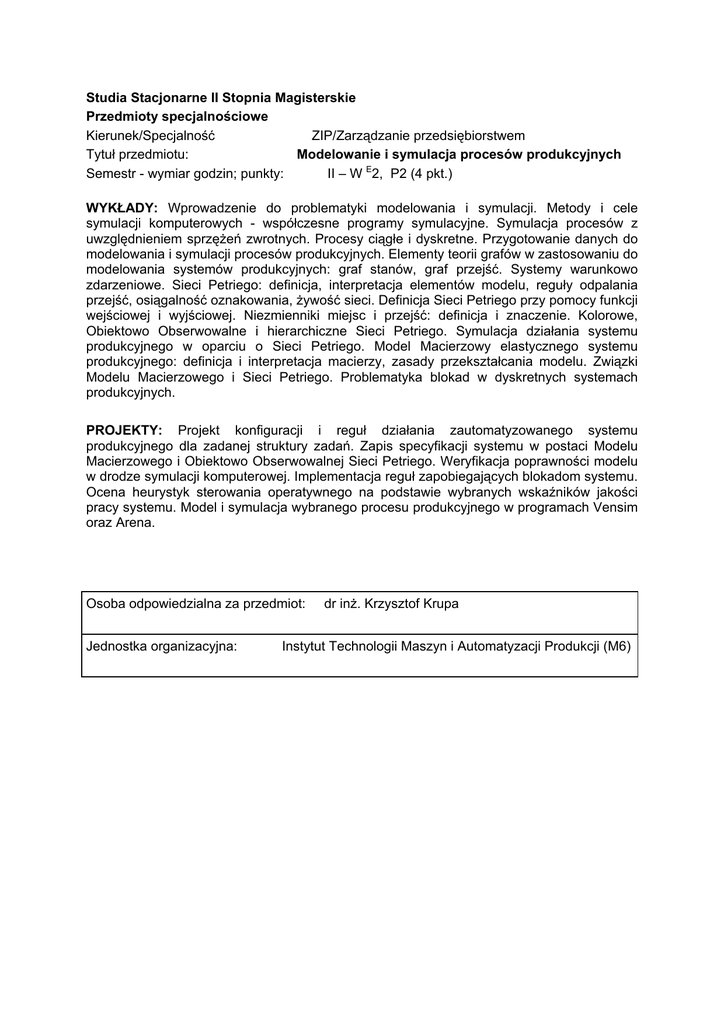 Studia Stacjonarne II Stopnia Magisterskie Przedmioty specjalnościowe Kierunek/Specjalność ZIP/Zarządzanie przedsiębiorstwem Tytuł przedmiotu: Modelowanie i symulacja procesów produkcyjnych Semestr - wymiar godzin; punkty: II – W E2, P2 (4 pkt.) WYKŁADY: Wprowadzenie do problematyki modelowania i symulacji. Metody i cele symulacji komputerowych - współczesne programy symulacyjne. Symulacja procesów z uwzględnieniem sprzężeń zwrotnych. Procesy ciągłe i dyskretne. Przygotowanie danych do modelowania i symulacji procesów produkcyjnych. Elementy teorii grafów w zastosowaniu do modelowania systemów produkcyjnych: graf stanów, graf przejść. Systemy warunkowo zdarzeniowe. Sieci Petriego: definicja, interpretacja elementów modelu, reguły odpalania przejść, osiągalność oznakowania, żywość sieci. Definicja Sieci Petriego przy pomocy funkcji wejściowej i wyjściowej. Niezmienniki miejsc i przejść: definicja i znaczenie. Kolorowe, Obiektowo Obserwowalne i hierarchiczne Sieci Petriego. Symulacja działania systemu produkcyjnego w oparciu o Sieci Petriego. Model Macierzowy elastycznego systemu produkcyjnego: definicja i interpretacja macierzy, zasady przekształcania modelu. Związki Modelu Macierzowego i Sieci Petriego. Problematyka blokad w dyskretnych systemach produkcyjnych. PROJEKTY: Projekt konfiguracji i reguł działania zautomatyzowanego systemu produkcyjnego dla zadanej struktury zadań. Zapis specyfikacji systemu w postaci Modelu Macierzowego i Obiektowo Obserwowalnej Sieci Petriego. Weryfikacja poprawności modelu w drodze symulacji komputerowej. Implementacja reguł zapobiegających blokadom systemu. Ocena heurystyk sterowania operatywnego na podstawie wybranych wskaźników jakości pracy systemu. Model i symulacja wybranego procesu produkcyjnego w programach Vensim oraz Arena. Osoba odpowiedzialna za przedmiot: Jednostka organizacyjna: dr inż. Krzysztof Krupa Instytut Technologii Maszyn i Automatyzacji Produkcji (M6)