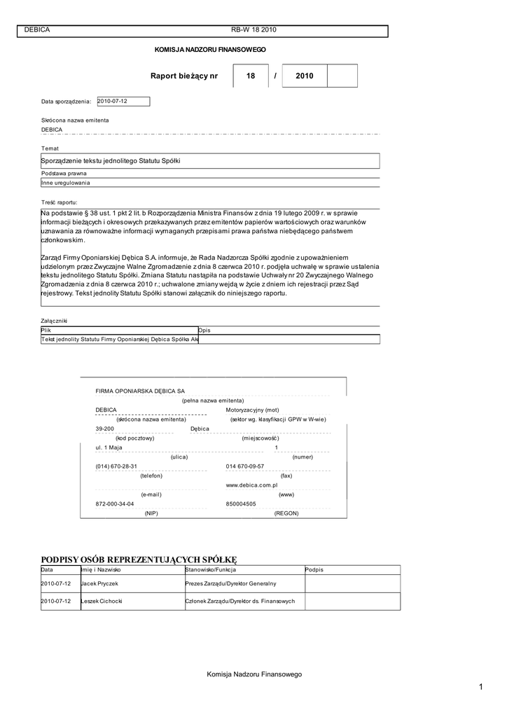 DEBICA RB-W 18 2010 KOMISJA NADZORU FINANSOWEGO 18 Raport bieŜący nr Data sporządzenia: 2010 / 2010-07-12 Skrócona nazwa emitenta DEBICA Temat Sporządzenie tekstu jednolitego Statutu Spółki Podstawa prawna Inne uregulowania Treść raportu: Na podstawie § 38 ust. 1 pkt 2 lit. b Rozporządzenia Ministra Finansów z dnia 19 lutego 2009 r. w sprawie informacji bieŜących i okresowych przekazywanych przez emitentów papierów wartościowych oraz warunków uznawania za równowaŜne informacji wymaganych przepisami prawa państwa niebędącego państwem członkowskim. Zarząd Firmy Oponiarskiej Dębica S.A. informuje, Ŝe Rada Nadzorcza Spółki zgodnie z upowaŜnieniem udzielonym przez Zwyczajne Walne Zgromadzenie z dnia 8 czerwca 2010 r. podjęła uchwałę w sprawie ustalenia tekstu jednolitego Statutu Spółki. Zmiana Statutu nastąpiła na podstawie Uchwały nr 20 Zwyczajnego Walnego Zgromadzenia z dnia 8 czerwca 2010 r.; uchwalone zmiany wejdą w Ŝycie z dniem ich rejestracji przez Sąd rejestrowy. Tekst jednolity Statutu Spółki stanowi załącznik do niniejszego raportu. Załączniki Opis Plik Tekst jednolity Statutu Firmy Oponiarskiej Dębic a Spółka Akc FIRMA OPONIARSKA DĘBICA SA (pełna nazwa emitenta) Motoryzac yjny (mot) DEBICA (sektor wg. klasyfikacji GPW w W-wie) (skrócona nazwa emitenta) Dębica 39-200 (miejscowość ) (kod poc ztowy) 1 ul. 1 Maja (numer) (ulic a) 014 670-09-57 (014) 670-28-31 (fax) (telefon) www.debica.c om.pl (www) (e-mail) 850004505 872-000-34-04 (REGON) (NIP) PODPISY OSÓB REPREZENTUJĄCYCH SPÓŁKĘ Data Imię i Nazwisko Stanowisko/Funkc ja 2010-07-12 Jacek Pryczek Prezes Zarządu/Dyrektor Generalny 2010-07-12 Leszek Cic hocki Członek Zarządu/Dyrektor ds. Finansowych Podpis Komisja Nadzoru Finansowego 1 Załącznik do uchwały nr 7/XVII/2010 Rady Nadzorczej Firmy Oponiarskiej Dębica S.A. Tekst jednolity Statutu Firmy Oponiarskiej Dębica Spółka Akcyjna. STATUT Firmy Oponiarskiej Dębica Spółka Akcyjna Tekst jednolity I. POSTANOWIENIA OGÓLNE §1 1. Firma Spółki brzmi: Firma Oponiarska Dębica Spółka Akcyjna. 2. Spółka moŜe uŜywać skrótów : T.C. Dębica S.A. lub Tyre Company Dębica S.A. §2 Siedzibą Spółki jest miasto Dębica. §3 1. Spółka działa na podstawie Kodeksu Spółek Handlowych oraz innych właściwych przepisów. 2. W braku postanowień Statutu stosuje się przepisy wymienione w ust.1 §4 1. Spółka działa na obszarze Rzeczpospolitej Polskiej i za granicą. 2. Czas trwania Spółki jest nie oznaczony. II. PRZEDMIOT DZIAŁALNOŚCI SPÓŁKI §5 Przedmiotem działalności Spółki jest: 1. Produkcja opon i dętek z gumy; bieŜnikowanie i regenerowanie opon z gumy 22.11.Z 2. Produkcja pozostałych wyrobów z gumy 22.19.Z 3. Produkcja maszyn do obróbki gumy lub tworzyw sztucznych oraz wytwarzania wyrobów z tych materiałów 28.96.Z 4. Naprawa i konserwacja maszyn 33.12.Z 5. Naprawa i konserwacja urządzeń elektronicznych i optycznych 33.13.Z 6. Naprawa i konserwacja urządzeń elektrycznych 33.14.Z 7. Instalowanie maszyn przemysłowych, sprzętu i wyposaŜenia 33.20.Z 8. Wytwarzanie energii elektrycznej 35.11.Z Załącznik do uchwały nr 7/XVII/2010 Rady Nadzorczej Firmy Oponiarskiej Dębica S.A. Tekst jednolity Statutu Firmy Oponiarskiej Dębica Spółka Akcyjna. 9. Przesyłanie energii elektrycznej 35.12.Z 10. Dystrybucja energii elektrycznej 35.13.Z 11. Wytwarzanie i zaopatrywanie w parę wodną, gorącą wodę i powietrze do układów klimatyzacyjnych 35.30.Z 12. Pobór, uzdatnianie i dostarczanie wody 36.00.Z 13. Konserwacja i naprawa pojazdów samochodowych, z wyłączeniem motocykli 45.20.Z 14. SprzedaŜ hurtowa części i akcesoriów do pojazdów samochodowych, z wyłączeniem motocykli 45.31.Z 15. SprzedaŜ detaliczna części i akcesoriów do pojazdów samochodowych, z wyłączeniem motocykli 45.32.Z 16. SprzedaŜ hurtowa wyrobów chemicznych 46.75.Z 17. Pozostała wyspecjalizowana sprzedaŜ hurtowa 46.7 18. Pozostała sprzedaŜ detaliczna prowadzona w niewyspecjalizowanych sklepach 47.19.Z 19. Obiekty noclegowe turystyczne i miejsca krótkotrwałego zakwaterowania 55.20.Z 20. Pozostała usługowa działalność gastronomiczna 56.29.Z 21. Pozostały transport lądowy pasaŜerski, gdzie indziej niesklasyfikowany 49.39.Z 22. Transport drogowy towarów 49.41.Z 23. Magazynowanie i przechowywanie pozostałych towarów 52.10.B 24. Działalność pozostałych agencji transportowych 52.29.C 25. Badania naukowe i prace rozwojowe w dziedzinie pozostałych nauk przyrodniczych i technicznych 72.19.Z 26. Pozostałe doradztwo w zakresie prowadzenia działalności gospodarczej i zarządzania 70.22.Z 27. Działalność w zakresie inŜynierii i związane z nią doradztwo techniczne 71.12.Z 28. Pozostała działalność profesjonalna, naukowa i techniczna, gdzie indziej niesklasyfikowana 74.90.Z. III. KAPITAŁ ZAKŁADOWY §6 Załącznik do uchwały nr 7/XVII/2010 Rady Nadzorczej Firmy Oponiarskiej Dębica S.A. Tekst jednolity Statutu Firmy Oponiarskiej Dębica Spółka Akcyjna. 1. Kapitał zakładowy Spółki dzieli się na 13.802.750 (słownie: trzynaście milionów osiemset dwa tysiące siedemset pięćdziesiąt ) akcji o wartości nominalnej 8,-złotych (słownie: osiem) kaŜda. 2. Kapitał zakładowy wynosi 110.422.000,00 zł (słownie złotych: sto dziesięć milionów czterysta dwadzieścia dwa tysiące ). §7 1. Wszystkie akcje Spółki są akcjami na okaziciela i nie podlegają zamianie na akcje imienne. 2. Akcjami Spółki są następujące akcje: - serii A o numerach od nr 000000001 do nr 008400000. - serii B o numerach od nr 008400001 do nr 010100000. - serii C o numerach od nr 010100001 do nr 013802750. §8 1. Akcje Spółki mogą być umarzane albo za zgoda akcjonariusza w drodze ich nabycia przez spółkę (umorzenie dobrowolne), albo bez zgody akcjonariusza (umorzenie przymusowe). Umorzenie akcji Spółki wymaga obniŜenia kapitału zakładowego. Uchwała o obniŜeniu kapitału zakładowego powinna b