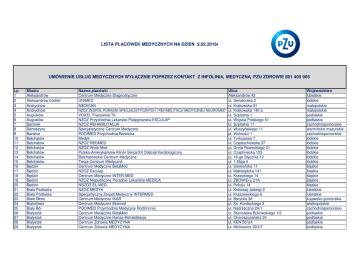 LISTA PLACÓWEK MEDYCZNYCH NA DZIEŃ 3.02.2016r UMÓWIENIE USŁUG MEDYCZNYCH WYŁĄCZNIE POPRZEZ KONTAKT Z INFOLINIĄ MEDYCZNĄ PZU ZDROWIE 801 405 905 Lp 1 2 3 4 5 6 7 8 9 10 11 12 13 14 15 16 17 18 19 20 21 22 23 24 25 26 27 28 29 Miasto Aleksandrów Aleksandrów Łódzki Andrychów Andrychów Augustów Augustów Barlinek Bartoszyce Barwice Bełchatów Bełchatów Bełchatów Bełchatów Bełchatów Bełchatów Będzin Będzin Będzin Będzin Będzin Biała Podlaska Biała Podlaska Białe Błota Białośliwie Biały Bór Białystok Białystok Białystok Białystok Nazwa placówki Centrum Medyczno-Diagnostyczne UNIMED MEDICAN Ulica Aleksandrów 43 ul. Senatorska 2 ul. Krakowska 91 NZOZ ZESPÓŁ PORADNI SPECJALISTYCZNYCH I REHABILITACJI MEDYCZNEJ NEUROMED ul. Krakowska 140 a VOXEL Pracownia TK ul. Szpitalna 1 NZOZ Przychodnia Lekarsko-Pielęgniarska ESCULAP ul. Wojska Polskiego 51 NZOZ REHABILITACJA ul. Szpitalna 11 Specjalistyczne Centrum Medyczne ul. Wyszyńskiego 11 PODIMED Przychodnia Barwicka pl. Wolności 1 Medyk ul. Turkusowa 7 NZOZ REDMED ul. Częstochowska 37 NZOZ Wola-Med ul. Grota Roweckiego 21 Polsko-Amerykańskie Kliniki Serca/XII Oddział Kardiologiczny ul. Czapliniecka 123 Bełchatowskie Centrum Medyczne ul. 19-go Stycznia 12 Twoje Centrum Medyczne ul. 1 Maja 4 Centrum Medyczne BetaMed ul. Siemońska 11 NZOZ Esculap ul. Małobądzka 141 Centrum Medyczne INTER-MED ul. Krasickiego 14 NZOZ Niepubliczne Poradnie Lekarskie MEDICA ul. ZBOWiD-u 21A NSZOZ EŁ-MED. ul. Pokoju 14 NZOZ MEDYK ul. Królowej Jadwigi 2 Specjalityczny Zespół Medyczny INTERMED ul. Kraszewskiego 6 Centrum Medyczne IKAR ul. Barycka 38 Centrum Medyczne Mutmed ul. Ks. Kordeckiego 3 PODIMED Przychodnia Medycyny Rodzinnnej ul. Nadrzeczna 2A/1 Centrum Medyczne BetaMed ul. Stanisława Bukowskiego 1/2 Centrum Medyczne Hansa-Rehabilitacja ul. Choroszczańska 24 Centrum Zdrowia MEDYCYNA ul. KEN 50/U4 Centrum Zdrowia MEDYCYNA ul. Mickiewicz 39/U7 Województwo lubelskie łódzkie małopolskie małopolskie podlaskie podlaskie zachodniopomorskie warmińsko-mazurskie zachodniopomorskie łódzkie łódzkie łódzkie łódzkie łódzkie łódzkie śląskie śląskie śląskie śląskie śląskie lubelskie lubelskie kujawsko-pomorskie wielkopolskie zachodniopomorskie podlaskie podlaskie podlaskie podlaskie 30 31 32 33 34 35 36 37 38 39 40 41 42 43 44 45 46 47 48 49 50 51 52 53 54 55 56 57 58 59 60 61 62 63 64 65 66 67 68 69 70 71 72 73 Białystok Białystok Białystok Białystok Białystok Białystok Białystok Białystok Bielawa Bielsko-Biała Bielsko-Biała Bielsko-Biała Bielsko-Biała Bielsko-Biała Bielsko-Biała Bielsko-Biała Bielsko-Biała Bielsko-Biała Bielsko-Biała Bielsko-Biała Bielsko-Biała Bielsko-Biała Biłgoraj Biłgoraj Biskupiec Błażowa Błonie Bochnia Bochnia Bogatynia Bogatynia Bogatynia Bogatynia Boguchwała Bolesławiec Bolesławiec Bożków Bralin Braniewo Brodnica Brudzowice Brzeg Brzeg Dolny Brzesko Lekarska Specjalistyczna Spółdzielnia Pracy Eskulap Lekarska Specjalistyczna Spółdzielnia Pracy Eskulap Lekarska Specjalistyczna Spółdzielnia Pracy Eskulap NZOZ Podlaskie Centrum Medyczne Specjalistyczny Niepubliczny Zakład Opieki Zdrowotnej LEGE ARTIS Centrum Zdrowia MEDYCYNA Humana Medica OMEDA IPL R. Bobrowski Przychodnia Lekarsko-Rehabilitacyjna ZDROVIT Centrum Medyczne BetaMed Biel-Med Danea CENTRUM MEDYCZNE Polsko-Amerykańskie Kliniki Serca/II Oddział Kardiologiczny Szpital Świętego Łukasza NZOZ Centrum Medyczne BIMED NZOZ Ultramedic Centrum Medyczne NZOZ Zdrowie i Rehabilitacja Zdrowie i Rehabilitacja Rehabilitacja Św. Łukasza Euroklinika Euroklinika Was-Med. Centrum Terapii Manualnej Rehabilitacji i Krioterapii Centrum Medyczne Luxmed Przychodnia Lekarska Twój Lekarz Samodzielny Publiczny Zakład Opieki Zdrowotnej Szpital Powiatowy Promedica Centrum Medyczne Credomed Medikarte Centrum Medyczne CenterMed SPZOZ Przychodnia Rejonowa Przychodnia Rejonowa Przychodnia Rejonowa Centrum Medyczne Medyk NZOZ Podstawowo-Specjalistyczna Przychodnia Lekarska CHUMED Przychodnia Lekarz Domowy SALUS Centrum Medyczne Zakład Podstawowej Opieki Zdrowotnej MEDICA Nasz Lekarz NZOZ Ars Medica NZOZ PROIMUS NZOZ ARS-MED Transport Sanitarny Dolnobrzeskie Specjalistyczne Centrum Medyczne CenterMed Brzeskie Centrum Medyczne ul. Malmeda 6 ul. Nowy Świat 11 c ul. Białówny 9/1 ul. Transportowa 4 ul. Młynowa 17 ul. Tysiąclecia P. P. 10 ul. Fabryczna 39 ul. KEN 5b ul. Jana III Sobieskiego 19a/2 ul. Prusa 61 ul. Szara 5 ul. Jaworzańska 40 ul. Armii Krajowej 101 ul. Bystarzańska 94 b ul. Krasińskiego 24/7B ul. Broniewskiego 48 ul. Karpacka 24 ul. Powstańców Śląskich 8 ul. Bystrzańska 94B ul. Żółkiewskiego 40 ul. Piotra Skargi 9 ul. Harcerska 7 ul. Kościuszki 18 ul. Dr. S. Pojaska 3 ul. Armii Krajowej 8 ul. Armii Krajowej 30 ul. Traugutta 14 ul. Proszowska 1 ul. Kazimierza Wielkiego 13 ul. Szpitalna 16 ul. Wyczółkowskiego 15 ul. Fabryczna 1 ul. Wyczółkowskiego 42a ul. Przemysłowa 2C al. Tysiąclecia 10 a/b ul. Zgorzelecka 12 Bożków 53 ul. 3-go Maja 9 ul. Żeromskiego 14A ul. Aleja Leśna 1 a ul. Szkolna 12 ul. Herberta 1 ul. Wilcza 6 ul. Browarna 5C podlaskie podlaskie podlaskie podlaskie podlaskie podlaskie podlaskie podlaskie dolnośląskie śląskie śląskie śląskie śląskie śląskie śląskie śląskie śląskie śląskie śląskie śląskie śląskie śląskie lubelskie lubelskie warmińsko-mazurskie podkarpackie mazowieckie małopolskie małopolskie dolnośląskie dolnośląskie dolnośląskie dolnośląskie podkarpackie dolnośląskie dolnośląskie dolnośląskie wielkopolskie warmińsko-mazurskie kujawsko-pomorskie śląskie opolskie dolnośląskie małopolskie 74 75 76 77 78 79 80 81 82 83 84 85 86 87 88 89 90 91 92 93 94 95 96 97 98 99 100 101 102 103 104 105 106 107 108 109 110 111 112 113 114 115 116 117 Brzeszcze Brzeszcze Brzeziny Brzozów Bukowno Busko-Zdrój Bydgoszcz Bydgoszcz Bydgoszcz Bydgoszcz Bydgoszcz Bydgoszcz Bydgoszcz Bydgoszcz Bydgoszcz Bydgoszcz Bydgos