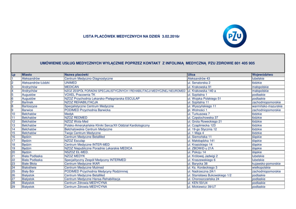 (lista plac\363wek medycznych PZU ZDROWIE 3_02_2016