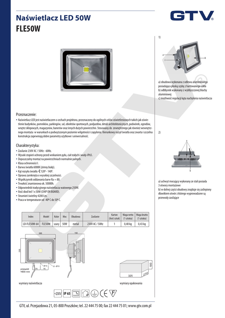 Naświetlacz LED 50W FLE50W 1) a b c a) obudowa wykonana z odlewu aluminiowego posiadająca płaską szybę z hartowanego szkła b) odbłysnik wykonany z wybłyszczonej blachy aluminiowej c) możliwość regulacji kąta nachylenia naświetlacza Przeznaczenie: • Naświetlacz LED jest naświetlaczem o cechach projektora, przeznaczony do ogólnych celów oświetleniowych takich jak oświe- tlenie budynków, pomników, parkingów, sal, obiektów sportowych, podjazdów, detali architektonicznych, podwórek, ogrodów, wnętrz sklepowych, magazynów, banerów oraz innych dużych powierzchni. Stosowany do zewnętrznego jak również wewnętrznego montażu w warunkach o podwyższonym poziomie wilgotności i zapylenia. Kierunkowy rozsył światła oraz zwarta i szczelna konstrukcja zapewniają dobre parametry użytkowe i uniwersalność. 2) a Charakterystyka: • Zasilanie 230V AC / 50Hz - 60Hz. • Wysoki stopień ochrony przed wnikaniem pyłu, ciał stałych i wody-IP65. • Dopuszczalny montaż na powierzchniach normalnie palnych. • Klasa ochronności I. • Barwa światła 6000K (zimny biały). • Kąt rozsyłu światła <(1200 - 1400. • Oprawa zamknięta o wysokiej szczelności. • Współczynnik oddawania barw Ra = 80. • Trwałość znamionowa ok. 50000h. • Odpowiednik tradycyjnego naświetlacza watowego 250W. • Ilość diod led 1 x 50W (CHIP ON BOARD). • Strumień świetlny 4200 Lm. • Praca w temperaturze od -400 C do 500 C. Model LD-FLE50W-64 FLE50W Kolor Moc szary 50W Obudowa Zasilanie metal 230V AC / 50Hz a) uchwyt mocujący wykonany ze stali posiada 3 otwory montażowe b) w dolnej części obudowy znajduje się zaślepiony dławikiem otwór z którego wyprowadzone są przewody zasilające Karton Waga netto Waga brutto (ilość sztuk) (1 sztuka) (1 sztuka) 1 0,40 kg 0,43 kg 180 Index b 325 wymiary naświetlacza 0 27 wymiary opakowania IP 65 GTV, ul. Przejazdowa 21, 05-800 Pruszków; tel. 22 444 75 00; fax 22 444 75 01; www.gtv.com.pl