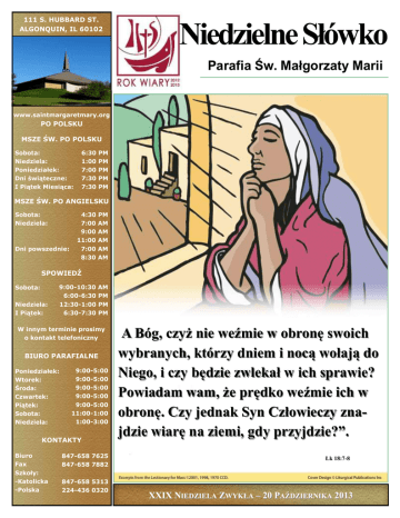 111 S. HUBBARD ST. ALGONQUIN, IL 60102 Niedzielne Słówko Parafia Św. Małgorzaty Marii www.saintmargaretmary.org PO POLSKU MSZE ŚW. PO POLSKU Sobota: Niedziela: Poniedziałek: Dni świąteczne: I Piątek Miesiąca: 6:30 1:00 7:00 7:30 7:30 PM PM PM PM PM MSZE ŚW. PO ANGIELSKU Sobota: Niedziela: Dni powszednie: 4:30 7:00 9:00 11:00 7:00 8:30 PM AM AM AM AM AM SPOWIEDŹ Sobota: Niedziela: I Piątek: 9:00-10:30 AM 6:00-6:30 PM 12:30-1:00 PM 6:30-7:30 PM W innym terminie prosimy o kontakt telefoniczny BIURO PARAFIALNE Poniedziałek: Wtorek: Środa: Czwartek: Piątek: Sobota: Niedziela: 9:00-5:00 9:00-5:00 9:00-5:00 9:00-5:00 9:00-5:00 11:00-1:00 1:00-3:00 KONTAKTY Biuro Fax Szkoły: -Katolicka -Polska 847-658 7625 847-658 7882 847-658 5313 224-436 0320 A Bóg, czyż nie weźmie w obronę swoich wybranych, którzy dniem i nocą wołają do Niego, i czy będzie zwlekał w ich sprawie? Powiadam wam, że prędko weźmie ich w obronę. Czy jednak Syn Człowieczy znajdzie wiarę na ziemi, gdy przyjdzie?”. Łk 18:7-8 XXIX NIEDZIELA ZWYKŁA – 20 PAŹDZIERNIKA 2013 Niedzielne Słówko Od Proboszcza „A Bóg czyż nie weźmie w obronę swoich wybranych, którzy dniem i nocą wołają do Niego, i czy będzie zwlekał w ich sprawie?” Drodzy Przyjaciele! W czasie wojny w Wietnamie, milioner z Texasu, Ross Perot, postanowił dać prezenty na Boże Narodzenie każdemu amerykańskiemu więźniowi w Wietnamie. Perot przygotował tysiące paczek do wysłania. Wynajął do tego celu samolot Boeing 707s, którym chciał przesłać prezenty do Wietnamu. Niestety wojna przybrała na sile i rząd wietnamski nie zgodził się współpracować w tym zakresie. Nie będzie żadnej pomocy podczas, gdy amerykańskie bombowce niszczą wietnamskie wioski. Bogaty Perot zaofiarował sie zatrudnić firmy budowlane, które by pomogły odbudować to co zostało zniszczone. Ale rząd się nie zgodził. Zbliżały się święta, a prezenty nie zostały wysłane. Perot nie poddawał się. Wyczarterował lot do Moskwy, skąd wysłał paczki z centralnej poczty, tego miasta. Wszystkie zostały dostarczone. Perot był bardzo wytrwały w realizacji swojego pomysłu, aby wysłać prezenty więźniom. Nie poddał się, ponieważ wiedział, że to co zamierzał było dobre i potrzebne. W dzisiejszej Ewangelii Jezus także mówi nam, że modlitwa jest rzeczą słuszną i nieodzowną. Chrystus zaprasza nas do modlitwy ciągłej i wytrwałej. Czasami słyszymy ludzi, którzy narzekają, że ich modlitwy nie zostały wysłuchane, albo sami mamy wiele pytań i wątpliwości na temat modlitwy. Jedna rzecz jest pewna, że nasza modlitwa do Boga zmienia nas na lepsze. Bóg jest niezmienny. On zawsze nas kocha, wie co jest dla nas najlepsze i pragnie naszego szczęścia. Właśnie dlatego nie zawsze otrzymujemy to, o co prosimy. Bóg wie lepiej od nas, co jest nam w danej chwili potrzebne. Ewangelia według św. Łukasza 18,1 - 8 Jezus opowiedział swoim uczniom przypowieść o tym, że zawsze powinni się modlić i nie ustawać: "W pewnym mieście żył sędzia, który Boga się nie bał i nie liczył się z ludźmi. W tym samym mieście żyła wdowa, która przychodziła do niego z prośbą: »Obroń mnie przed moim przeciwnikiem«. Przez pewien czas nie chciał; lecz potem rzekł do siebie: »Chociaż Boga się nie boję ani się z ludźmi nie liczę, to jednak ponieważ naprzykrza mi się ta wdowa, wezmę ją w obronę, żeby nie przychodziła bez końca i nie zadręczała mnie«”. I Pan dodał: "Słuchajcie, co ten niesprawiedliwy sędzia mówi. A Bóg, czyż nie weźmie w obronę swoich wybranych, którzy dniem i nocą wołają do Niego, i czy będzie zwlekał w ich sprawie? Powiadam wam, że prędko weźmie ich w obronę. Czy jednak Syn Człowieczy znajdzie wiarę na ziemi, gdy przyjdzie?”. Podczas letniego urlopu spotkałem się z moim szkolnym kolegą, którego 18- letnia córka zmarła na raka. Nasze spotkanie odbyło się dwa miesiące po jej pogrzebie. On, cała rodzina, przyjaciele i znajomi modlili się o łaskę uzdrowienia dla niej. Stało się inaczej. Ale czas choroby jego córki, był czasem, kiedy po raz pierwszy on sam i jego rodzina modlili się tak szczerze i intensywnie. Jak mi powiedział, ta modlitwa zmieniła ich życie. Przed chorobą swojej córki byli “ zbyt zajęci”, aby się modlić, czy znaleźć czas na niedzielną Mszę Świętą. Modlitwa, którą zaczęli praktykować nie przyniosła daru uzdrowienia ich córki, ale w zamian otrzymali dar głębokiej wiary i ufności w Bożą Opatrzność. Doświadczyli również umocnienia ich więzi małżeńskich i rodzinnych. Bóg wstąpił do ich życia w nowy i głębszy sposób. Bez modlitwy nasza wiara staje się słaba i zanika. Właśnie dlatego w ostatnim zdaniu w dzisiejszej Ewangelii Jezus wypowiada swoje obawy: “Czy jednak Syn Człowieczy znajdzie wiarę na ziemi, gdy przyjdzie?” Wielu ludzi traci wiarę, ponieważ się nie modlą. Niech nasze życie modlitwy będzie głębokie, wytrwałe i pełne ufności w Boga. O. Piotr Sarnicki OFM Conv Niedzielne Słówko Ogłoszenia W najbliższy poniedziałek 21-go października o 7 wieczorem zapraszamy na Mszę Świętą i nabożeństwo różańcowe W przyszła niedzielę 27-go października podczas Mszy Świętej o godzinie 1 P.M. odbędzie się poświęcenie różańców i rozdanie ich dzieciom, które w tym roku przystąpią do Pierwszej Komunii Świętej. W miesiącu listopadzie będziemy odprawiać wypominki. Czytelnie wypisane imiona waszych zmarłych wraz z ofiarą prosimy składać do skrzynki z napisem wypominki , która znajduje się w holu kościelnym. W niedzielę 3-go listopada po Mszy Świętej o godzinie 1 PM, zapraszamy na grochówkę z pajdą chleba, ze smalcem i kiełbasą. Bilety do nabycia już dzisiaj po Mszy Świętej. Służba Liturgiczna Ołtarza Ministranci Również w tym roku organizujemy Zabawę Andrzejkową, która odbędzie się w sobotę 30-go listopada. Bilety do na