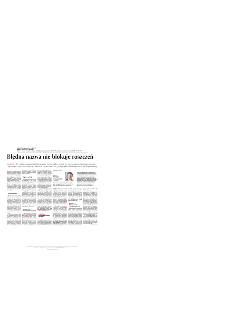 zródło: Rzeczpospolita | 19.2.2015 rubryka: Praca i ZUS | Strona: 5 Autor: —Maciej Pietrzycki | nakład: 67699 | rozpowszechniono: 60185 | Temat: Prawo podatkowe-Prasa | AVE: 24 792 PLN Błędna nazwa nie blokuje roszczeń NALEŻNOŚCI | Formułując wewnątrzzakładowe przepisy płacowe, należy uważać, aby świadczenia określane jako premie nie były w istocie nagrodami, a nagrody – premiami. Zwłaszcza ta druga sytuacja może mieć niekorzystne skutki dla pracodawcy. Mocny argument W obecnej sytuacji rynkowej często to nie pensja zasadnicza, ale właśnie dodatkowe świadczenia są czynnikiem decydującym o podjęciu zatrudnienia, zwłaszcza w przypadku pracowników bardziej wykwalifikowanych. Pełniąc rolę motywującą do wydajniejszej pracy, niosą jednocześnie wymierne korzyści dla samego pracodawcy (przez zwiększenie efektywności pracy można bowiem skutecznie konkurować na danym rynku). Polski ustawodawca zdaje się jednak nie zauważać tych zależności. Najlepszym tego dowodem jest fakt, że w przepisach prawa pracy brakuje nawet definicji tego rodzaju świadczeń, w tym także najpopularniejszych z nich, jak premie i nagrody. W praktyce stwarza to problemy z rozróż- nieniem tych dwóch dodatkowych składników wynagrodzenia o całkowicie odmiennym charakterze. Ogólna definicja Kodeks pracy ogranicza się do wskazania w art. 105, że pracownikom, którzy przez wzorowe wypełnianie swoich obowiązków, przejawianie inicjatywy w pracy i podnoszenie jej wydajności oraz jakości przyczyniają się szczególnie do wykonywania zadań zakładu mogą być przyznawane nagrody i wyróżnienia. Z konieczności ta – niewiele wyjaśniająca – regulacja jest zatem rozbudowywana przez liczne orzeczenia sądów powszechnych i Sądu Najwyższego oraz stanowiska doktryny prawniczej. Pozwala to wyodrębnić najistotniejsze różnice między premiami i nagrodami, a tym samym odpowiednio ukształtować zasady ich przyznawania w przepisach płacowych. RÓŻNICA 1. Charakter świadczenia Najważniejsza kwestia to ta, że o ile przyznanie pracownikowi nagrody (oraz określenie jej wysokości) zależy w zasadzie wyłącznie od swobodnego uznania pracodawcy, o tyle premia ma charakter roszczeniowy. Oznacza to, że jeśli zatrudniony spełni określone przesłanki przewidziane w wewnątrzzakładowych przepisach prawa pracy, premia mu się należy niezależnie od woli pracodawcy. Mechanizm ten działa również w drugą stronę. Gdy podwładny „spełni” warunek negatywny, nie ma do niej prawa, nawet jeśli jednocześnie spełni wszystkie wymogi pozytywne. Próby nazywania premii nagrodą lub premią uznaniową nie przyniosą skutku. To ostatnie jest zresztą w mojej ocenie pojęciem wewnętrznie sprzecznym, którego nie powinni stosować profesjonaliści. Jeżeli warunki premiowania są określone w sposób na tyle konkretny, aby mogły podlegać kontroli, to świadczenie ma charakter premii. W takim wypadku decyzja o jej przyznaniu nie zależy od swobodnego uznania pracodawcy, ale od wypełnienia tych warunków. Gdy zaś przyznanie premii pozostawione zostało swobodnemu uznaniu podmiotu zatrudniającego (przy braku sprawdzalnych i możliwych do kontroli kryteriów), to świadczenie ma charakter nagrody, choćby zostało nazwane premią. Wskazał na to m.in. Sąd Najwyższy w uchwale z 10 czerwca 1983 r. (III PZP 25/83). RÓŻNICA 2. Miejsce w przepisach płacowych Skoro przyznanie pracownikowi nagrody zależy wyłącznie od woli pracodawcy, to nie ma konieczności regulowania zasad jej wypłaty w firmowych przepisach. Jeżeli pracodawca >ZDANIEM AUTORA Maciej Pietrzycki prawnik w Kancelarii KSP Legal & Tax Advice w Katowicach MP Wynagrodzenie pracownika powinno być tak ustalone, aby odpowiadało w szczególności rodzajowi wykonywanej przez niego pracy i kwalifikacjom wymaganym przy jej wykonywaniu, a także uwzględniało ilość i jakość świadczonej pracy. Tak stanowi art. 78 § 1 kodeksu pracy. Szczegóły w tym zakresie ustala sam pracodawca w przepisach płacowych. Poza wynagrodzeniem zasadniczym reguluje w nich kwestie dotyczące dodatkowych składników wynagrodzenia, np. premii. Wymienione cechy charakterystyczne nagród i premii pociągają za sobą konieczność odpowiedniego sformułowania zapisów regulaminów chciałby jednak w ten sposób dodatkowo „zachęcić” załogę do podjęcia zatrudnienia, to w mojej ocenie właściwym rozwiązaniem jest ograniczenie się do powielenia zacytowanego wyżej art. 105 k.p. Jakiekolwiek dalej idące uszczegółowianie zapisów dotyczących nagród (w szczególności wskazywanie, w jakich przypadkach mogą zostać wypłacone) wiąże się z ryzykiem mimowolnego przekształcenia ww. świadczenia w premię. Z kolei premie powinny być szczegółowo uregulowane w umowie o pracę lub w obowiązujących w zakładzie regulaminach, przy czym z punktu widzenia pracodawcy korzystniejsze jest drugie z tych rozwiązań. Przepisy regulaminów nie mają bowiem zastosowania, jeżeli prawo do premii i jej wysokość zostały określone korzystniej w zawartej z pracownikiem umowie (zob. wyrok SN z 22 września 1999 r., I PKN 262/99). W takim wypadku zmiana zapisów regulaminu dotyczących premii – np. i innych aktów prawa pracy obowiązujących w zakładzie. Wobec braku stosownych regulacji ustawowych pomocne w tym zakresie może się okazać bogate orzecznictwo i wypracowany dorobek doktryny prawniczej. Aby uniknąć błędów związanych z nieprawidłowym określaniem świadczeń (a tym samym nie narażać się na obowiązek ich wypłaty pracownikom, mimo że miały one być zależne od swobodnej decyzji pracodawcy), warto też skonsultować treść opracowanych regulaminów z prawnikiem zajmującym się tematyką prawa pracy. ∑ ustalenie nowych reguł liczenia jej podstawy, wprowadzenie nowych przesłanek warunkujących nabycie do niej prawa lub określających jej wysokość – wymaga dodatkowo zastosowania wobec pracownika
