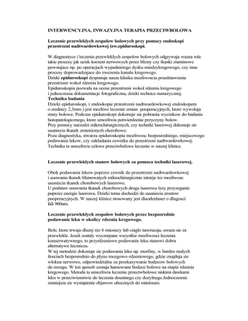 INTERWENCYJNA, INWAZYJNA TERAPIA PRZECIWBOLOWA Leczenie przewleklych zespolow bolowych przy pomocy endoskopi przestrzeni nadtwardowkowej tzw.epiduroskopi. W diagnostyce i leczeniu przewleklych zespolow bolowych odgrywaja wazna role takie procesy jak ucisk korzeni nerwowych przez blizny czy tkanki ziarninowe powstajace np. po operacjach wypadnietego dysku miedzykregowego, czy inne procesy doprowadzajace do zwezenia kanalu kregowego. Dzieki epiduroskopi dysponuje nasza klinika mozliwoscia przedstawienia przestrzeni wokol rdzenia kregowego. Epiduroskopia pozwala na ocene przestrzeni wokol rdzenia kregowego i jednoczesna dokumentacje fotograficzna, dzieki technice numerycznej. Technika badania Dzieki epiduroskopi, ( endoskopie przestrzeni nadtwardowkowej endoskopem o srednicy 2,3mm ) jest mozliwe leczenie zmian pooperacyjnych, ktore wywoluja stany bolowe. Podczas epiduroskopi dokonuje sie pobrania wycinkow do badania histopatologicznego, ktore umozliwia potwierdzenie przyczyny bolow. Przy pomocy narzedzi mikrochirurgicznych, czy techniki laserowej dokonuje sie usuniecia tkanek zmienionych chorobowo. Poza diagnostyka, stwarza epiduroskopia mozliwosc bezposredniego, miejscowego podawania lekow, czy zakladania cewnika do przestrzeni nadtwardowkowej. Technika ta umozliwia celowe przeciwbolowe leczenie w naszej klinice. Leczenie przewleklych stanow bolowych za pomoca techniki laserowej. Obok podawania lekow poprzez cewnik do przestrzeni nadtwardowkowej i usuwania tkanek bliznowatych mikrochirurgicznie istnieje tez mozliwosc usuniecia tkanek chorobowych laserowo. U podstaw usuwania tkanek chorobowych droga laserowa lezy przyzeganie poprzez energie laserowa. Dzieki temu dochodzi do usuniecia zrostow pooperacyjnych. W naszej klinice stosowany jest diaodenlaser o dlugosci fali 960nm. Leczenie przewleklych zespolow bolowych przez bezposrednie podawanie leku w okolicy rdzenia kregowego. Bole, ktore trwaja dluzej niz 6 miesiecy lub ciagle nawracaja, uwaza sie za przewlekle. Jezeli zostaly wyczerpane wszystkie mozliwosci leczenia konserwatywnego, to przyrdzeniowe podawanie leku stanowi dobra alternatywe lecznicza. W tej metodzie dokonuje sie podawania leku np. morfiny, w bardzo malych ilosciach bezposrednio do plynu mozgowo-rdzeniowego, gdzie znajduja sie wlokna nerwowe, odpowiedzialne za przekazywanie bodzcow bolowych do mozgu. W ten sposob zostaja hamowane bodzce bolowe na etapie rdzenia kregowego. Metoda ta umozliwia leczenie przeciwbolowe niskimi dawkami leku w przeciwienstwie do leczenia doustnego czy dozylnego.Jednoczesnie zmniejsza sie wystapienie objawow ubocznych do minimum. Jaki pacient profituje z tego typu leczenia? Chorzy z przewleklymi, rozleglymi bolami, u ktorych nie osiagnieto redukcji dolegliwosci bolowych podczas leczenia doustnego czy pozajelitowego lub u ktorych wystapily znaczne objawy ubuczne.Wsrod pacjentow, ktorzy zakwalifikuja sie do tego typu leczenia, przeprowadza sie najpierw faze testawa, podczas ktorej ocenia sie stopien przeciwbolowego dzialania leku podawanego do plynu mozgowo-rdzeniowego.O sposobie prowadzenia tego testu decyduje lekarz. Po udanym tescie dokonuje sie wstrzepienia pacjentowi odpowiedniego systemu. System do przyrdzeniowego podawania leku sklada sie z cwenika i pompy. Cwenik doprowadza lek bezposrednio w okolice rdzenia kregowego do plynu mozgowo-rdzeniowego. Pompa dozuje odpowiednia dawke leku. Pompa ta znajduje sie w 2,5cm grubej metalowej obudowie i ma przekatna 7,5cm. Wstrzepiana jest w powloki brzuszne, w okolicy podbrzusza. Cewnik wprowadza sie do przestrzeni gdzie znajduje sie plyn mozgowordzeniowy. Koncowka cewnika zostaje podskornie polaczona z pompa. Pompe napelnia sie lekiem np. morfina wedlug zalecen lekarza. Kolejne napelnianie pompy odbywa sie w okolo miesiecznych odstepach czasu przy uzyciu specialnej igly. Leczenie przewleklego zespolu bolowego przez stymulacje rdzenia kregowego ( Spinal Cord Stimulation ). Bole, ktore trwaja dluzej niz 6 miesiecy lub ciagle nawracaja sa uwazane za przewlekle. W przypadku wyczerpania konserwatywnych metod leczenia jest stymulacia rdzenia kregowego dobra alternatywa terapie przeciwbolowej. Metoda ta zostala wprowadzona w latach 70 i tysiacom pacientow na calym swiecie pomogla zredukowac dolegliwosci bolowe. Ten typ leczenia nie jest leczeniem przyczynowym i nie kazdy pacient moze sie poddac tego typu leczeniu. W tej metodzie leczenia wstrzepia sie elektrode w okolice rdzenia kregowego. Elektroda ta wysyla slabe impulsy elektryczne, ktore prowadza do przerwania przesylania badzcow bolowych z rdzenia kregowego do mozgu. Zamiast bolu odczuwaja pacienci przyjemne mrowienie w okolicy gdzie dotychczas wystepowal bol. System do stymulacji rdzenia kregowego sklada sie z 3 skladnikow: elektrody, ktora stanowi cienki kabel z biegunami elektrycznymi wysylajacymi impulsy do rdzenia kregowego. W zaleznosci od obrazu chorobowego jest mozliwe wstrzepienie jednej lub kilku elektrod. przedluzacz kabel przedluzajacy, laczacy elektrode z generatorem impulsow. generator impulsow podobnie jak w rozruszniku serca wysyla generator odpowiednio zaprogramowane impulsy do elektrody. Generator sklada sie z czesci wytwarzajacej impulsy i zrodla energii ( bateria ).Programowania generatora dokonuje lekarz. Pacjent otrzymuje dodatkowe urzadzenie, ktore umozliwia mu samodzielne sterowanie generatora ( zmiana sily impulsow ) w zaleznosci od nasilenia bolu w zakresie ustalonym przes lekarza. Technika implantacji Implantacja elektrody Bardzo wazne jest umiejscowienie elektrody, dlatego wymaga ono scislej wspolpracy pacjenta z lekarzem.Zabieg ten dokonywany jest w znieczuleniu miejscowym pod kontrola promieni rentgenowskich.Podczas zabiegu dokonuje sie stymulacji poprzez elektrode, az do momentu w ktorym pacjent odczuje przyjemne mrowienie w obszarze dotknietym bolem. Test stymulacyjny Po wstrzepieniu elektrody przeprowadza sie kilkudniowa faze testowa, podczas ktorej dokonuje sie oceny skutecznosci dzialania elektrody w warunkach zycia cadzie