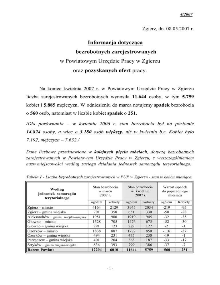 4/2007 Zgierz, dn. 08.05.2007 r. Informacja dotycząca bezrobotnych zarejestrowanych w Powiatowym Urzędzie Pracy w Zgierzu oraz pozyskanych ofert pracy. Na koniec kwietnia 2007 r. w Powiatowym Urzędzie Pracy w Zgierzu liczba zarejestrowanych bezrobotnych wynosiła 11.644 osoby, w tym 5.759 kobiet i 5.885 mężczyzn. W odniesieniu do marca notujemy spadek bezrobocia o 560 osób, natomiast w liczbie kobiet spadek o 251. /Dla porównania – w kwietniu 2006 r. stan bezrobocia był na poziomie 14.824 osoby, a więc o 3.180 osób większy. niż w kwietniu b.r. Kobiet było 7.192, mężczyzn – 7.632./ Dane liczbowe przedstawione w kolejnych pięciu tabelach, dotyczą bezrobotnych zarejestrowanych w Powiatowym Urzędzie Pracy w Zgierzu, z wyszczególnieniem nazw miejscowości według zasięgu działania jednostek samorządu terytorialnego. Tabela 1 - Liczba bezrobotnych zarejestrowanych w PUP w Zgierzu - stan w końcu miesiąca. Według jednostek samorządu terytorialnego Zgierz – miasto Zgierz – gmina wiejska Aleksandrów – gmina miejsko-wiejska Głowno – miasto Głowno – gmina wiejska Ozorków – miasto Ozorków – gmina wiejska Parzęczew – gmina wiejska Stryków – gmina miejsko-wiejska Razem Powiat: Stan bezrobocia w marcu 2007 r. Stan bezrobocia w kwietniu 2007 r. Wzrost /spadek do poprzedniego miesiąca ogółem kobiety ogółem kobiety ogółem Kobiety 4164 701 1951 1528 291 1838 494 401 836 12204 2129 358 980 705 123 887 231 204 393 6010 3945 651 1919 1476 289 1722 475 368 799 11644 2034 330 945 675 122 850 230 187 386 5759 -219 -50 -32 -52 -2 -116 -19 -33 -37 -560 -95 -28 -35 -30 -1 -37 -1 -17 -7 -251 -1- 4/2007 Prawo do zasiłku posiadało 2.458 osób, co stanowiło 21,1% ogółu zarejestrowanych, a więc zdecydowana większość była bez prawa do zasiłku – 78,9%, tj. 9.186 osób. W odniesieniu do marca, liczba osób z prawem do zasiłku, w kwietniu zmniejszyła się o 44 osoby. /W kwietniu 2006 roku odnotowano 3.137 osób z prawem do zasiłku, a więc o 679 więcej niż w kwietniu b.r./ Tabela 2 - Liczba bezrobotnych z prawem do zasiłku zarejestrowanych w PUP w Zgierzu. Według jednostek samorządu terytorialnego Zgierz – miasto Zgierz – gmina wiejska Aleksandrów – gmina miejsko-wiejska Głowno – miasto Głowno – gmina wiejska Ozorków – miasto Ozorków – gmina wiejska Parzęczew – gmina wiejska Stryków – gmina miejsko-wiejska Razem Powiat: Stan bezrobocia w marcu 2007 r. Stan bezrobocia w kwietniu 2007 r. Wzrost /spadek do poprzedniego miesiąca z prawem do zasiłku z prawem do zasiłku z prawem do zasiłku 894 171 368 310 48 350 78 83 200 2502 865 168 379 323 45 316 80 73 209 2458 -29 -3 11 13 -3 -34 2 -10 9 -44 W kwietniu 2007 r. zarejestrowano 1.031 osób bezrobotnych, w tym 457 kobiet. W odniesieniu do marca liczba nowych rejestracji zwiększyła się o 199 osób. Większość nowych rejestracji to osoby poprzednio pracujące – 80,1% – było ich 826. /W kwietniu 2006 roku zarejestrowano 740 osób, a więc o 291 mniej niż w kwietniu b.r./ Tabela 3 - Liczba bezrobotnych zarejestrowanych w miesiącu w PUP w Zgierzu. Według jednostek samorządu terytorialnego Zgierz – miasto Zgierz – gmina wiejska Aleksandrów – gmina miejsko-wiejska Głowno – miasto Głowno – gmina wiejska Ozorków – miasto Ozorków – gmina wiejska Parzęczew – gmina wiejska Stryków – gmina miejsko-wiejska Razem Powiat: Bezrobotni zarejestrowani w marcu 2007 r. ogółem Bezrobotni zarejestrowani w kwietniu 2007 r. ogółem Wzrost /spadek do poprzedniego miesiąca ogółem 354 54 109 90 22 102 18 29 54 832 362 71 145 129 32 143 24 34 91 1031 8 17 36 39 10 41 6 5 37 199 -2- 4/2007 W kwietniu bieżącego roku z ewidencji bezrobotnych zdjęto 1.591 osób, w tym 708 kobiet. W porównaniu do marca notujemy wzrost osób wyrejestrowanych o 116. /W kwietniu 2006 roku wyłączono z ewidencji bezrobotnych 1.352 osoby, a więc o 239 mniej niż w kwietniu b.r./ Tabela 4 – Liczba bezrobotnych skreślonych z ewidencji PUP w Zgierzu. Według jednostek samorządu terytorialnego Bezrobotni wyrejestrowani w marcu 2007 r. ogółem Bezrobotni wyrejestrowani w kwietniu 2007 r. ogółem Wzrost /spadek do poprzedniego miesiąca ogółem Zgierz – miasto Zgierz – gmina wiejska Aleksandrów – gmina miejsko-wiejska Głowno – miasto Głowno – gmina wiejska Ozorków – miasto Ozorków – gmina wiejska Parzęczew – gmina wiejska Stryków – gmina miejsko-wiejska Razem Powiat: 482 104 238 207 36 203 50 55 100 1475 581 121 177 181 34 259 43 67 128 1591 99 17 -61 -26 -2 56 -7 12 28 116 Przyczyną wyłączenia z ewidencji 723 bezrobotnych było podjęcie pracy, co stanowiło 45,4% ogółu wyrejestrowanych. Jednakże grupa 283 osób, które nie zgłosiły się do Urzędu w wyznaczonym terminie, celem poświadczenia gotowości do podjęcia pracy, stanowiła 17,8%. W odniesieniu do marca, w podjęciach pracy notujemy wzrost o 55 natomiast liczba skreślonych z braku gotowości zwiększyła się o 38. /W kwietniu 2006 r. pracę podjęło 830 osób, a 218 osób nie świadczyło gotowości do jej podjęcia, a więc więcej niż w kwietniu b.r. o 107 i mniej o 65./ Tabela 5 - Liczba bezrobotnych skreślonych z ewidencji PUP w Zgierzu, z powodu podjęcia pracy i braku gotowości do jej podjęcia. 4 Według jednostek samorządu terytorialnego Zgierz – miasto Zgierz – gmina wiejska Aleksandrów – gmina miejsko-wiejska Głowno – miasto Głowno – gmina wiejska Ozorków – miasto Ozorków – gmina wiejska Parzęczew – gmina wiejska Stryków – gmina miejsko-wiejska Razem Powiat: Bezrobotni wyrejestrowani w marcu 2007 r. z powodu Bezrobotni wyrejestrowani w kwietniu 2007 r. z powodu Wzrost /spadek do poprzedniego miesiąca podjęcia pracy braku gotowości podjęcia pracy braku gotowości podjęcia pracy braku gotowości 238 27 93 93 17 98 26 17 59 668 82 9 55 24 3 40 7 2 23 245 241 52 85 67 15 147 18 35 63 723 118 19 28 44 6 40 8 6 14 283 3 25 -8 -26 -2 49 -8 18 
