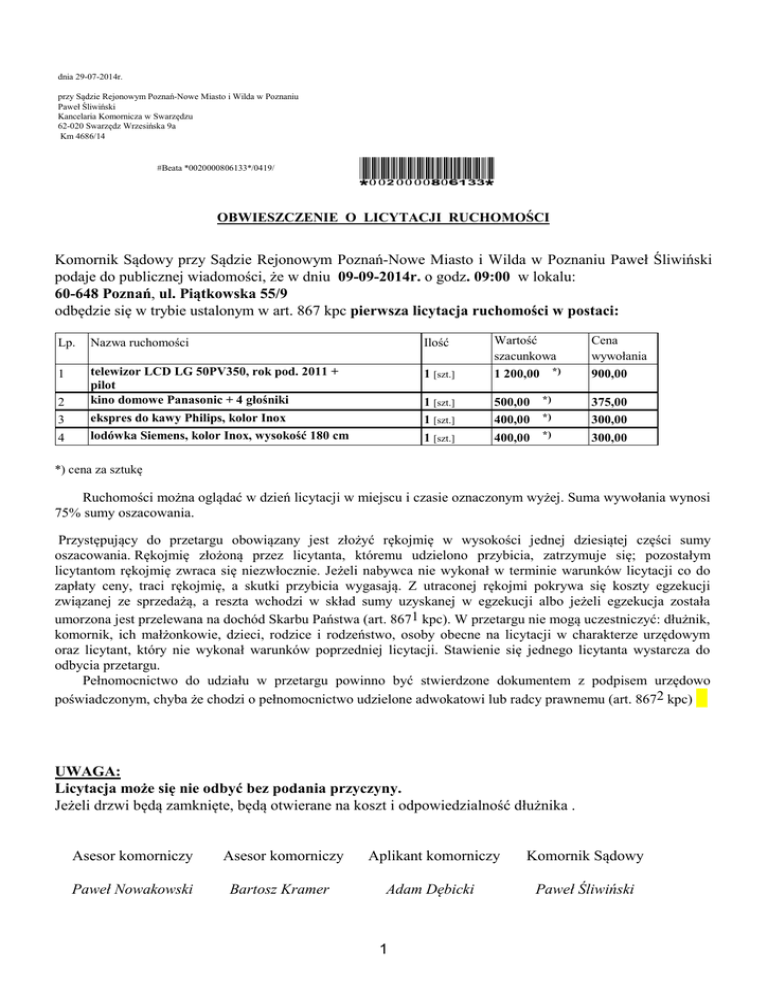 dnia 29-07-2014r. przy Sądzie Rejonowym Poznań-Nowe Miasto i Wilda w Poznaniu Paweł Śliwiński Kancelaria Komornicza w Swarzędzu 62-020 Swarzędz Wrzesińska 9a Km 4686/14 #Beata *0020000806133*/0419/ *0020000806133* OBWIESZCZENIE O LICYTACJI RUCHOMOŚCI Komornik Sądowy przy Sądzie Rejonowym Poznań-Nowe Miasto i Wilda w Poznaniu Paweł Śliwiński podaje do publicznej wiadomości, że w dniu 09-09-2014r. o godz. 09:00 w lokalu: 60-648 Poznań, ul. Piątkowska 55/9 odbędzie się w trybie ustalonym w art. 867 kpc pierwsza licytacja ruchomości w postaci: Lp. Nazwa ruchomości Ilość 1 telewizor LCD LG 50PV350, rok pod. 2011 + pilot kino domowe Panasonic + 4 głośniki ekspres do kawy Philips, kolor Inox lodówka Siemens, kolor Inox, wysokość 180 cm 1 [szt.] Wartość szacunkowa 1 200,00 *) 1 [szt.] 1 [szt.] 1 [szt.] 500,00 400,00 400,00 2 3 4 *) *) *) Cena wywołania 900,00 375,00 300,00 300,00 *) cena za sztukę Ruchomości można oglądać w dzień licytacji w miejscu i czasie oznaczonym wyżej. Suma wywołania wynosi 75% sumy oszacowania. Przystępujący do przetargu obowiązany jest złożyć rękojmię w wysokości jednej dziesiątej części sumy oszacowania. Rękojmię złożoną przez licytanta, któremu udzielono przybicia, zatrzymuje się; pozostałym licytantom rękojmię zwraca się niezwłocznie. Jeżeli nabywca nie wykonał w terminie warunków licytacji co do zapłaty ceny, traci rękojmię, a skutki przybicia wygasają. Z utraconej rękojmi pokrywa się koszty egzekucji związanej ze sprzedażą, a reszta wchodzi w skład sumy uzyskanej w egzekucji albo jeżeli egzekucja została umorzona jest przelewana na dochód Skarbu Państwa (art. 8671 kpc). W przetargu nie mogą uczestniczyć: dłużnik, komornik, ich małżonkowie, dzieci, rodzice i rodzeństwo, osoby obecne na licytacji w charakterze urzędowym oraz licytant, który nie wykonał warunków poprzedniej licytacji. Stawienie się jednego licytanta wystarcza do odbycia przetargu. Pełnomocnictwo do udziału w przetargu powinno być stwierdzone dokumentem z podpisem urzędowo poświadczonym, chyba że chodzi o pełnomocnictwo udzielone adwokatowi lub radcy prawnemu (art. 8672 kpc) UWAGA: Licytacja może się nie odbyć bez podania przyczyny. Jeżeli drzwi będą zamknięte, będą otwierane na koszt i odpowiedzialność dłużnika . Asesor komorniczy Asesor komorniczy Aplikant komorniczy Komornik Sądowy Paweł Nowakowski Bartosz Kramer Adam Dębicki Paweł Śliwiński 1