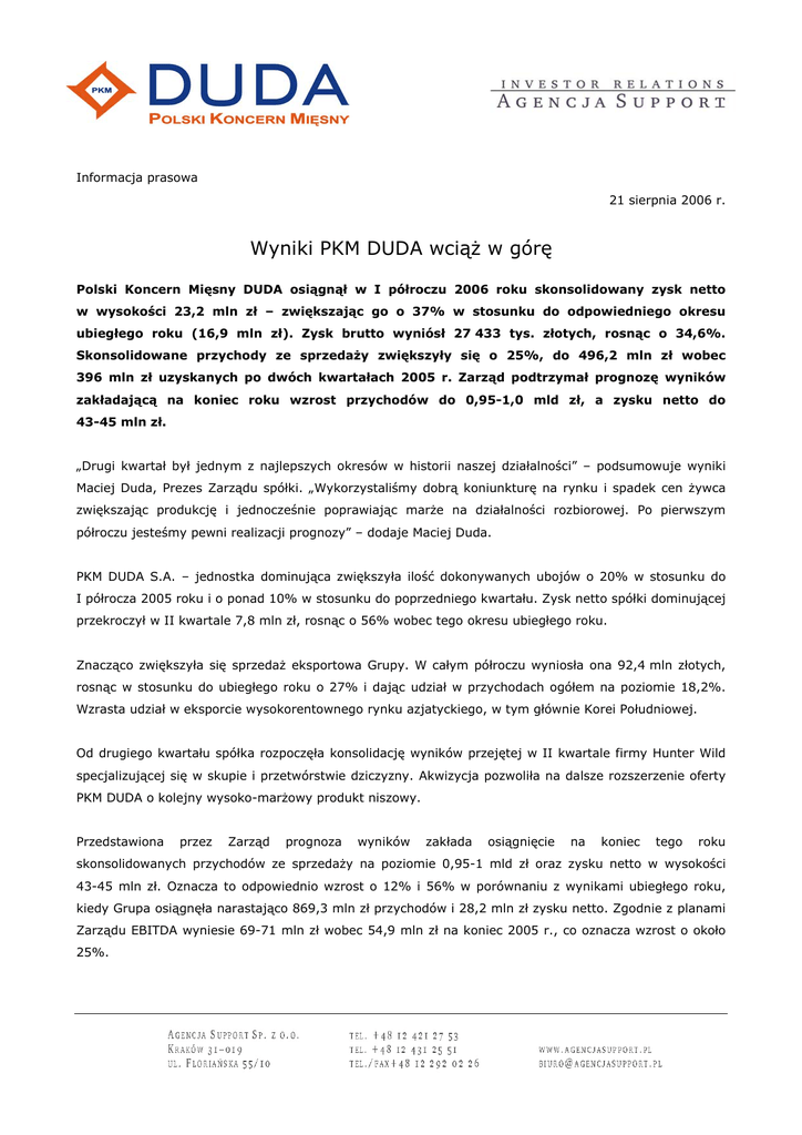 Informacja prasowa 21 sierpnia 2006 r. Wyniki PKM DUDA wciąż w górę Polski Koncern Mięsny DUDA osiągnął w I półroczu 2006 roku skonsolidowany zysk netto w wysokości 23,2 mln zł – zwiększając go o 37% w stosunku do odpowiedniego okresu ubiegłego roku (16,9 mln zł). Zysk brutto wyniósł 27 433 tys. złotych, rosnąc o 34,6%. Skonsolidowane przychody ze sprzedaży zwiększyły się o 25%, do 496,2 mln zł wobec 396 mln zł uzyskanych po dwóch kwartałach 2005 r. Zarząd podtrzymał prognozę wyników zakładającą na koniec roku wzrost przychodów do 0,95-1,0 mld zł, a zysku netto do 43-45 mln zł. „Drugi kwartał był jednym z najlepszych okresów w historii naszej działalności” – podsumowuje wyniki Maciej Duda, Prezes Zarządu spółki. „Wykorzystaliśmy dobrą koniunkturę na rynku i spadek cen żywca zwiększając produkcję i jednocześnie poprawiając marże na działalności rozbiorowej. Po pierwszym półroczu jesteśmy pewni realizacji prognozy” – dodaje Maciej Duda. PKM DUDA S.A. – jednostka dominująca zwiększyła ilość dokonywanych ubojów o 20% w stosunku do I półrocza 2005 roku i o ponad 10% w stosunku do poprzedniego kwartału. Zysk netto spółki dominującej przekroczył w II kwartale 7,8 mln zł, rosnąc o 56% wobec tego okresu ubiegłego roku. Znacząco zwiększyła się sprzedaż eksportowa Grupy. W całym półroczu wyniosła ona 92,4 mln złotych, rosnąc w stosunku do ubiegłego roku o 27% i dając udział w przychodach ogółem na poziomie 18,2%. Wzrasta udział w eksporcie wysokorentownego rynku azjatyckiego, w tym głównie Korei Południowej. Od drugiego kwartału spółka rozpoczęła konsolidację wyników przejętej w II kwartale firmy Hunter Wild specjalizującej się w skupie i przetwórstwie dziczyzny. Akwizycja pozwoliła na dalsze rozszerzenie oferty PKM DUDA o kolejny wysoko-marżowy produkt niszowy. Przedstawiona przez Zarząd prognoza wyników zakłada osiągnięcie na koniec tego roku skonsolidowanych przychodów ze sprzedaży na poziomie 0,95-1 mld zł oraz zysku netto w wysokości 43-45 mln zł. Oznacza to odpowiednio wzrost o 12% i 56% w porównaniu z wynikami ubiegłego roku, kiedy Grupa osiągnęła narastająco 869,3 mln zł przychodów i 28,2 mln zł zysku netto. Zgodnie z planami Zarządu EBITDA wyniesie 69-71 mln zł wobec 54,9 mln zł na koniec 2005 r., co oznacza wzrost o około 25%. Wyniki I półrocza wskazują, iż prognoza ta jest niezagrożona, gdyż we wszystkich prognozowanych wynikach osiągnięto już ponad 50% planowych wielkości. Po zrealizowaniu prognoz zysk netto na jedną akcję wyniesie 0,91 złotych, a wartość księgowa 5,36 zł na jedną akcję. Przy obecnych poziomach ceny giełdowej (11,85 zł) daje to wartość wskaźnika C/Z - 13,0 a wskaźnika C/Wk - 2,2. Kontakt: Brygida Rowińska Polski Koncern Mięsny DUDA S.A. Grąbkowo 73, 63-930 Jutrosin tel. +48 65 547-21-19, fax +48 65 547-21-26 e-mail: [email protected] www.pkmduda.pl --------------------------------------------------Polski Koncern Mięsny DUDA jest grupą powiązanych kapitałowo firm sektora rolno - spożywczego z terenu całej Polski. Liderem Grupy, która zatrudnia obecnie ok. 1300 osób, jest Polski Koncern Mięsny DUDA S.A. z siedzibą w Warszawie - od 2002 roku spółka giełdowa. W skład grupy kapitałowej wchodzą firmy: PKM DUDA S.A., Polska Wołowina, Hunter Wild, Makton, Eurosmak, Fedrus, NetBrokers, EURO DUDA, PZZ Dystrybucja, AGRO DUDA, Wizental,, Bioenergia, Agroprof i Rolpol. Od lutego 2006 r. Polski Koncern Mięsny DUDA S.A. jest większościowym udziałowcem ukraińskiej firmy BORYS z siedzibą w Nowowołyńsku, zajmującej się ubojem i rozbiorem mięsa. Struktura Polskiego Koncernu Mięsnego DUDA obejmuje obecnie trzy podstawowe segmenty: produkcyjny (ubój, rozbiór i konfekcja mięsa czerwonego), handlowo-usługowy (dystrybucja wyrobów mięsnych i wędliniarskich, pośrednictwo w zakresie handlu oraz wyspecjalizowane usługi rozbioru) oraz rolny (zaplecze surowcowe - hodowla trzody, uprawa, przetwórstwo i magazynowanie zbóż). Wszystkie zakłady produkcyjne Polskiego Koncernu Mięsnego DUDA posiadają uprawnienia unijne oraz wdrożony system HACCP. Grupa eksportuje swoje produkty m.in. do większości krajów Unii Europejskiej, a także na Ukrainę, do Białorusi, Korei Płd i Japonii.
