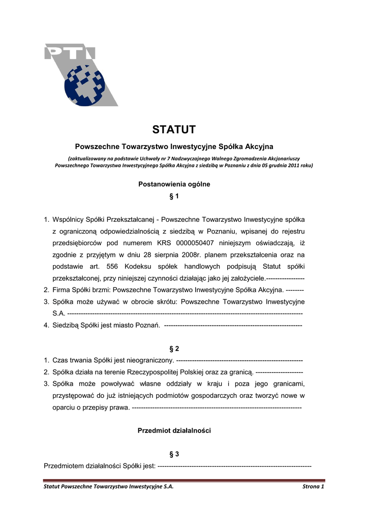 STATUT Powszechne Towarzystwo Inwestycyjne Spółka Akcyjna (zaktualizowany na podstawie Uchwały nr 7 Nadzwyczajnego Walnego Zgromadzenia Akcjonariuszy Powszechnego Towarzystwa Inwestycyjnego Spółka Akcyjna z siedzibą w Poznaniu z dnia 05 grudnia 2011 roku) Postanowienia ogólne §1 1. Wspólnicy Spółki Przekształcanej - Powszechne Towarzystwo Inwestycyjne spółka z ograniczoną odpowiedzialnością z siedzibą w Poznaniu, wpisanej do rejestru przedsiębiorców pod numerem KRS 0000050407 niniejszym oświadczają, iż zgodnie z przyjętym w dniu 28 sierpnia 2008r. planem przekształcenia oraz na podstawie art. 556 Kodeksu spółek handlowych podpisują Statut spółki przekształconej, przy niniejszej czynności działając jako jej założyciele.----------------2. Firma Spółki brzmi: Powszechne Towarzystwo Inwestycyjne Spółka Akcyjna. -------3. Spółka może używać w obrocie skrótu: Powszechne Towarzystwo Inwestycyjne S.A. -------------------------------------------------------------------------------------------------------4. Siedzibą Spółki jest miasto Poznań. ------------------------------------------------------------§2 1. Czas trwania Spółki jest nieograniczony. -------------------------------------------------------2. Spółka działa na terenie Rzeczypospolitej Polskiej oraz za granicą. --------------------3. Spółka może powoływać własne oddziały w kraju i poza jego granicami, przystępować do już istniejących podmiotów gospodarczych oraz tworzyć nowe w oparciu o przepisy prawa. --------------------------------------------------------------------------Przedmiot działalności §3 Przedmiotem działalności Spółki jest: -------------------------------------------------------------------Statut Powszechne Towarzystwo Inwestycyjne S.A. Strona 1 1. 64.20.Z - Działalność holdingów finansowych, ----------------------------------------------- 2. 64.30.Z - Działalność trustów, funduszów i podobnych instytucji, ----------------------- 3. 64.92.Z - Pozostałe formy udzielania kredytów, --------------------------------------------- 4. 64.99.Z - Pozostała finansowa działalność usługowa, gdzie indziej niesklasyfikowana, z wyłączeniem ubezpieczeń i funduszów emerytalnych, ------------------------------------------------5. 66.11.Z - Zarządzanie rynkami finansowymi, ------------------------------------------------------ 6. 66.12.Z - Działalność maklerska związana z rynkiem papierów wartościowych i towarów giełdowych, ----------------------------------------------------------------------------------------------7. 66.19.Z - Pozostała działalność wspomagająca usługi finansowe, z wyłączeniem ubezpieczeń i funduszów emerytalnych, --------------------------------------------------------------------8. 66.30.Z - Działalność związana z zarządzaniem funduszami, -------------------------------- 9. 68.10.Z - Kupno i sprzedaż nieruchomości na własny rachunek, ------------------------ 10. 68.20.Z - Wynajem i zarządzanie nieruchomościami własnymi lub dzierżawionymi, 11. 68.31.Z - Pośrednictwo w obrocie nieruchomościami, ------------------------------------- 12. 70.10.Z - Działalność firm centralnych (head offices) i holdingów, z wyłączeniem holdingów finansowych, -------------------------------------------------------------------------------------13. 70.22.Z - Pozostałe doradztwo w zakresie prowadzenia działalności gospodarczej i zarządzania. ---------------------------------------------------------------------------------------------------- §4 Istotna zmiana przedmiotu działalności Spółki jest dopuszczalna bez konieczności wykupu akcji tych akcjonariuszy, którzy nie zgadzają się na zmianę, o ile uchwała Walnego Zgromadzenia w tej sprawie zostanie podjęta większością 2/3 (dwóch trzecich) oddanych głosów przy obecności osób przedstawiających co najmniej połowę kapitału zakładowego. -------------------------------------------------------------------------- Kapitał zakładowy i akcje §5 1. Kapitał zakładowy wynosi 13.000.000,00 zł (trzynaście milionów złotych). ------------2. Kapitał zakładowy spółki dzieli się na: a. 11.000.000 (jedenaście milionów) akcji na okaziciela serii A o wartości nominalnej 1,00 (jeden) złoty każda o numerach od 00000001 do 11000000; - b. 1.000.000 (jeden milion) akcji na okaziciela serii B o wartości nominalnej 1,00 (jeden) złoty każda, o numerach od 0000001 do 1000000. ------------------------- c. 1.000.000 (jeden milion) akcji na okaziciela serii C o wartości nominalnej 1,00 Statut Powszechne Towarzystwo Inwestycyjne S.A. Strona 2 (jeden) złoty każda, o numerach od 0000001 do 1000000. ------------------------3. Akcje serii A wydane zostały w zamian za udziały w spółce Powszechne Towarzystwo Inwestycyjne spółka z ograniczoną odpowiedzialnością, która to spółka została przekształcona w spółkę akcyjną zgodnie z przepisami Kodeksu spółek handlowych i pokryte zostały majątkiem Spółki Przekształcanej, wobec czego kwota wpłacona na pokrycie kapitału zakładowego, który wynosi 11.000.000,00 zł (jedenaście milionów złotych) wpłacona została w całości. ---------4. Kapitał zakładowy może być podwyższony w drodze emisji nowych akcji. ------------5. Podwyższenie kapitału zakładowego może nastąpić przez przeniesienie do niego z kapitału zapasowego kwoty określonej przez Walne Zgromadzenie i nieodpłatne wydanie akcji dotychczasowym akcjonariuszom, proporcjonalnie do liczby posiadanych przez nich akcji. ----------------------------------------------------------------------6. Akcje są emitowane w seriach oznaczonych kolejnymi literami alfabetu. –-----------§ 5a 1. Określa się wartość nominalną warunkowego podwyższenia kapitału zakładowego Spółki na kwotę nie mniejszą niż 1.000.000 zł (jeden milion złotych) i nie większą niż 2.000.000 zł (dwa miliony złotych). ------------------------