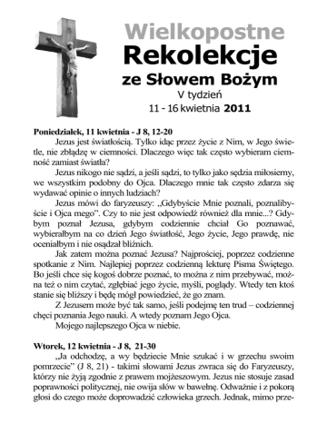 Wielkopostne Rekolekcje ze Słowem Bożym V tydzień 11 - 16 kwietnia 2011 Poniedziałek, 11 kwietnia - J 8, 12-20 Jezus jest światłością. Tylko idąc przez życie z Nim, w Jego świetle, nie zbłądzę w ciemności. Dlaczego więc tak często wybieram ciemność zamiast światła? Jezus nikogo nie sądzi, a jeśli sądzi, to tylko jako sędzia miłosierny, we wszystkim podobny do Ojca. Dlaczego mnie tak często zdarza się wydawać opinie o innych ludziach? Jezus mówi do faryzeuszy: „Gdybyście Mnie poznali, poznalibyście i Ojca mego”. Czy to nie jest odpowiedź również dla mnie...? Gdybym poznał Jezusa, gdybym codziennie chciał Go poznawać, wybierałbym na co dzień Jego światłość, Jego życie, Jego prawdę, nie oceniałbym i nie osądzał bliźnich. Jak zatem można poznać Jezusa? Najprościej, poprzez codzienne spotkanie z Nim. Najlepiej poprzez codzienną lekturę Pisma Świętego. Bo jeśli chce się kogoś dobrze poznać, to można z nim przebywać, można też o nim czytać, zgłębiać jego życie, myśli, poglądy. Wtedy ten ktoś stanie się bliższy i będę mógł powiedzieć, że go znam. Z Jezusem może być tak samo, jeśli podejmę ten trud – codziennej chęci poznania Jego nauki. A wtedy poznam Jego Ojca. Mojego najlepszego Ojca w niebie. Wtorek, 12 kwietnia - J 8, 21-30 „Ja odchodzę, a wy będziecie Mnie szukać i w grzechu swoim pomrzecie” (J 8, 21) - takimi słowami Jezus zwraca się do Faryzeuszy, którzy nie żyją zgodnie z prawem mojżeszowym. Jezus nie stosuje zasad poprawności politycznej, nie owija słów w bawełnę. Odważnie i z pokorą głosi do czego może doprowadzić człowieka grzech. Jednak, mimo prze- WIELKOPOSTNE REKOLEKCJE ZE SŁOWEM BOŻYM 2011 strogi, Chrystus pokazuje drogę wyjścia i źródło głoszonych słów: „Gdy wywyższycie Syna Człowieczego, wtedy poznacie, że JA JESTEM i że Ja nic od siebie nie czynię, ale że to mówię, czego Mnie Ojciec nauczył.” (J 8, 28). Zawarty w tym fragmencie Ewangelii dialog Jezusa z Faryzeuszami opisuje dwa obozy - jeden należący do szatana, drugi do Boga. To ja wybieram, do którego obozu chcę należeć. Czy chcę podążać drogą złego – prowadzącą do śmierci, czy wybieram drogę, którą prowadzi mnie Chrystus – prawdy, miłości i życia wiecznego? Wystarczy, że zaproszę Boga do swojego życia. Czy jestem gotów powiedzieć dziś Bogu TAK? Środa, 13 kwietnia - J 8, 31-42 Spójrzmy na dzisiejszą Ewangelię okiem przypadkowego przechodnia odwiedzającego Jerozolimę. Przechodzień napotyka rozpalonych kłótnią Żydów. Co robi wobec tego? Najprawdopodobniej oddala się czym prędzej. Być może jednak naszego przechodnia zaciekawiłoby to, kto okaże się zwycięzcą w obserwowanym sporze, i być może pozostałby przez chwilę na miejscu. Czego by się wtedy dowiedział? Ano okazałoby się, że w sporze Chrystusa z faryzeuszami nie ma wygranych ani pokonanych. Jezus odchodzi w swoją stronę, a faryzeusze w swoją... Gdzie jednak podziało się nasze głębokie przekonanie o słuszności słów Jezusa oraz o pokrętności słów faryzeuszy? Przecież nasze przekonanie o błędzie faryzeuszy powinno być równie silne, jak przekonanie Szadraka, Meszaka i Abed-nego o błędzie Nabuchodonozora, który kazał im składać ofiary bożkom (por. Dn 3,14-20.91-92.95). Czy gdyby owi trzej młodzieńcy z księgi Daniela byli świadkami kłótni Jezusa z faryzeuszami, to i oni czuliby to, co my? Czy i oni mieliby ledwie niejasne poglądy na temat tego, kto tu przegrywa i dlaczego? Trzej młodzieńcy z księgi Daniela nie mieli w sobie nic z postawy obserwatora lub widza. Ich serca były siedmiokroć gorętsze niż rozpalony piec, do którego Nabuchodonozor wrzucił ich za wiarę w niewidzialnego Boga. Trzej młodzieńcy przeszli cudownie i bez szwanku przez ten rozpalony piec. To, co im pomogło, to wielkie zaangażowanie, wiara i gorąca modlitwa. Nasz snujący się po Jerozolimie turysta najprawdopo- Parafia św. Jadwigi Śląskiej w Chorzowie www.jadwiga.info dobniej nigdy nie sprzeciwił się swemu przełożonemu, pracodawcy, zwierzchnikowi (takiemu jak Nabuchodonozor), nigdy też nie musiał położyć na szalę swego własnego życia (jak Szadrak, Meszak i Abed-ne). A my? Nie jesteśmy sami na drodze wiary! Wspólnota modlących się ludzi i Anioł Boży towarzyszą także nam. Czwartek, 14 kwietnia – J 8, 51-59 Jezus - Syn Boży, Pan czasu i przestrzeni. Ten, który JEST, choć Abraham dopiero się narodzi. Ten, który JEST, gdy Jego Matka staje twarzą w twarz z Bożym posłańcem, by za chwilę zgodzić się na niepojęte. Ten, który JEST, nawet wtedy, kiedy bliscy składają Jego ciało w grobie. Ten, który JEST, w każdej chwili, także tutaj, teraz, tuż obok. Który składa obietnicę wyzwolenia spod panowania czasu i przestrzeni, przywiązania do "tu" i "teraz", "wczoraj", "dziś" i "jutro". I oni - porażeni mocą paradoksu. Tak gorliwi w swej wierze, że aż zdolni do "ostatecznego rozwiązania" kwestii Nauczyciela z Nazaretu. Jakże dalecy od uwierzenia, że rozmawiają z Panem wszystkiego i że to On jest Tym, Który Ma Moc. Ślepi i głusi, choć przecież widzą i słyszą. Zamykający usta Temu, który sam jest Słowem i który wszystkim słowom nadaje sens. Oni? To przecież my. Tak samo oburzeni na tę jedyną Obietnicę, choć słyszymy ją ciągle na nowo. Tak samo niewidzący, mimo iż zanurzeni w Świetle. Chwytający kamienie - wyrzutu, obelgi, oszczerstwa – i miotający nimi wokoło. Tak samo porażeni mocą paradoksu. Próbujący to, co niepojęte, dopasować do znanych sobie pojęć i reguł. Sfrustrowani i pełni zwątpienia, gdy się to nie udaje. Ale On i tak JEST. Niezbyt na szczęście przejmuje się naszym oburzeniem, nie na tyle w każdym razie, aby zniknąć z horyzontu naszego świata. Pan czasu i przestrzeni. Pan świata, Pan wszystkiego, co było i będzie. Pan naszego zwątpienia i naszego zaufania. Pan. Ten kt