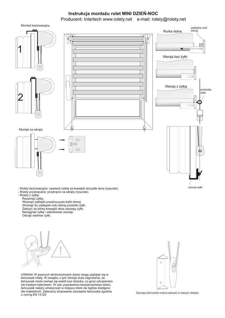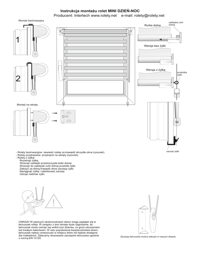 Instrukcja montażu rolet MINI DZIEŃ-NOC Producent: Intertech www.rolety.net e-mail: [email protected] Montaż bezinwazyjny Rurka dolna zaślepka rurki dolnej 1 Wersja bez żyłki Wersja z żyłką przelotka żyłki 2 Montaż na wkręty - Rolety bezinwazyjne: zawiesić roletę za krawędź skrzydła okna (rysunek). - Rolety przykręcane: przykręcić na wkręty (rysunek). - Rolety z żyłką: Rozwinąć żyłkę. Wcisnąć zaślepki przeźroczyste belki dolnej Wcisnąć do zaślepek rurki dolnej przelotki żyłki. Założyć za dolną krawędź okna zaczepy żyłki. Naciągnąć żyłkę i zablokować zaczep. Odciąć nadmiar żyłki. zaczep żyłki ! UWAGA! W pewnych okolicznościach dzieci mogą zaplątać się w łańcuszek rolety. W związku z tym istnieje duże zagrożenie, że łańcuszek może owinąć się wokół szyi dziecka, co grozi uduszeniem lub trwałym kalectwem. W celu poprawienia bezpieczeństwa dzieci, łańcuszek należy umieszczać w miejscu które nie będzie dostępne dla małoletnich. Zalecamy stosowanie zaczepów łańcuszka zgodnie z normą EN 13120 Zaczepy łańcuszka można zakupić w naszym sklepie.