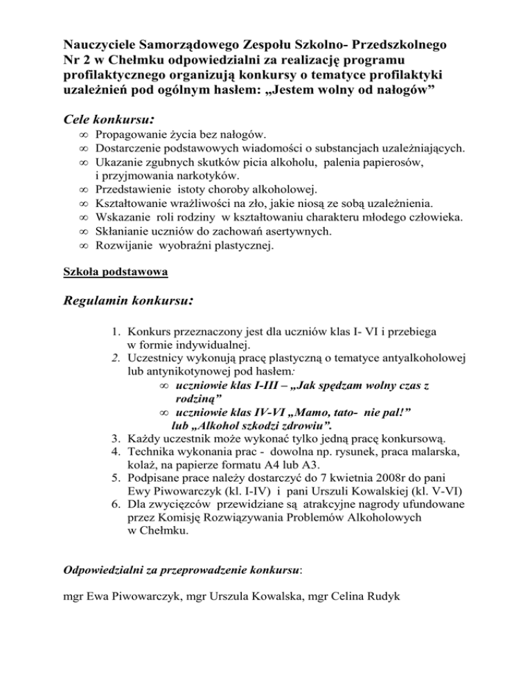Nauczyciele Samorządowego Zespołu Szkolno- Przedszkolnego Nr 2 w Chełmku odpowiedzialni za realizację programu profilaktycznego organizują konkursy o tematyce profilaktyki uzaleŜnień pod ogólnym hasłem: „Jestem wolny od nałogów” Cele konkursu: • Propagowanie Ŝycia bez nałogów. • Dostarczenie podstawowych wiadomości o substancjach uzaleŜniających. • Ukazanie zgubnych skutków picia alkoholu, palenia papierosów, i przyjmowania narkotyków. • Przedstawienie istoty choroby alkoholowej. • Kształtowanie wraŜliwości na zło, jakie niosą ze sobą uzaleŜnienia. • Wskazanie roli rodziny w kształtowaniu charakteru młodego człowieka. • Skłanianie uczniów do zachowań asertywnych. • Rozwijanie wyobraźni plastycznej. Szkoła podstawowa Regulamin konkursu: 1. Konkurs przeznaczony jest dla uczniów klas I- VI i przebiega w formie indywidualnej. 2. Uczestnicy wykonują pracę plastyczną o tematyce antyalkoholowej lub antynikotynowej pod hasłem: • uczniowie klas I-III – „Jak spędzam wolny czas z rodziną” • uczniowie klas IV-VI „Mamo, tato- nie pal!” lub „Alkohol szkodzi zdrowiu”. 3. KaŜdy uczestnik moŜe wykonać tylko jedną pracę konkursową. 4. Technika wykonania prac - dowolna np. rysunek, praca malarska, kolaŜ, na papierze formatu A4 lub A3. 5. Podpisane prace naleŜy dostarczyć do 7 kwietnia 2008r do pani Ewy Piwowarczyk (kl. I-IV) i pani Urszuli Kowalskiej (kl. V-VI) 6. Dla zwycięzców przewidziane są atrakcyjne nagrody ufundowane przez Komisję Rozwiązywania Problemów Alkoholowych w Chełmku. Odpowiedzialni za przeprowadzenie konkursu: mgr Ewa Piwowarczyk, mgr Urszula Kowalska, mgr Celina Rudyk Gimnazjum Regulamin konkursu: 1. Konkurs przeznaczony jest dla uczniów klas I-III i przebiega w formie indywidualnej i grupowej. 2. KaŜda klasa wybiera trzyosobową reprezentację. 3. Uczestnicy indywidualnie rozwiązują test, składający się z pytań zamkniętych i otwartych dotyczący podstawowej wiedzy o środkach uzaleŜniających: alkoholu, nikotynie i narkotykach. 4. Literatura do konkursu znajduje się w bibliotece , w artykule zamieszczonym w gazetce szkolnej :„Alkoholizm- choroba całego człowieka”, w podręcznikach do biologii i chemii. 5. Prace testowe ocenia Komisja Konkursowa, maksymalna ilość punktów uzyskanych w teście to 30p. 6. Po napisaniu testu uczniowie w zespołach trzyosobowych wykonują plakat pod hasłem: ”Jestem wolny od nałogów”. 7. KaŜda grupa prezentuje wykonaną przez siebie pracę. Komisja Konkursowa ocenia prezentację w skali od 1 do 10 punktów, a wykonanie plakatu od 1 do 20 punktów. 8. ZwycięŜa zespół, który zdobył największą liczbę punktów – jest to suma punktów za rozwiązanie testu, prezentację i wykonanie plakatu. 9. Cztery najlepiej pracujące zespoły klasowe zostaną nagrodzone. 10.Dla zwycięzców przewidziane są atrakcyjne nagrody ufundowane przez Komisję Rozwiązywania Problemów Alkoholowych w Chełmku. 11. Termin konkursu : 10 kwietnia 2008 r . Odpowiedzialni za przeprowadzenie konkursu: mgr Ewa Jeleń mgr Urszula Kowalska mgr Anna Grochal mgr Celina Rudyk