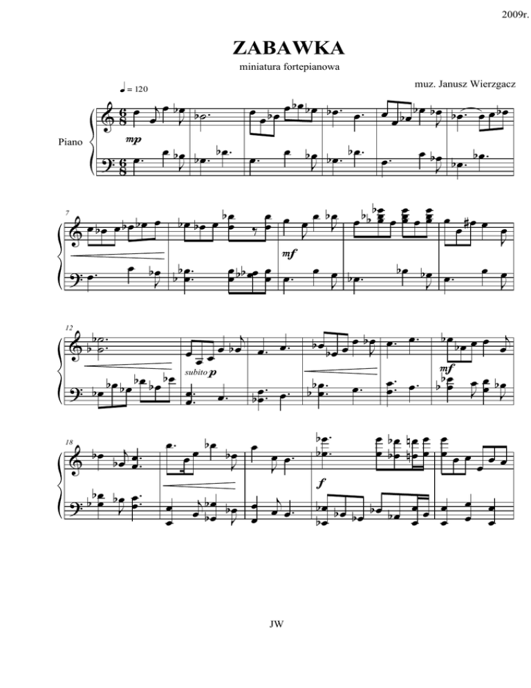 2009r. ZABAWKA miniatura fortepianowa muz. Janusz Wierzgacz q = 120 Piano 7 œ bœ bœ bœ. . œ bœ jœ bœ b˙. 6 œ œ b œ œ &8 œ J œ œ bœ P œ bœ bœ bœ. œ œ bœ bœ bœ. œ . . . . ? 6 œ. œ J J 8 bœ œ œ œ œ b œ b œ œ œ b œ b œ œ œ œ œ b œ ‰ & J F œ bœ bœ. œœ b b œœ œœ œ œ ? œ. . J b œ. bœ bœ. œ œ bœ J bœ bœ. bœ. J b œ œ b b b œœœ œ œœœ œ œœœ œ # œ J œ œ œ J œ bœ. J b˙. & b ˙. bœ bœ œ J . j œ bœ œ. œ. bœ bœ œ b œ œ . œ b œ œ J œ . œ œ bœ œ F subito p b œ b œ . œ . œ . b b œœ œ b œ b œ . b œ b œ œ . . ? bœ œ œ . œ . b œœ . œ . b œ . J œ. 12 j & b œ b œ œœ .. 18 bœ bœ œ. b ? œ J œ. œ. œ bœ œ bœ œ œ. œ J J œ œ j b œ b œ œ œj œ bœ J œ œ. JW bœ. bœ. œ œ J œ j œ œœ b œ J œ bœ nœ œ œ œ bœ nœ œ œ œ œ œ œ œ f bœ bœ bœ bœ œ œ œ œ œ bœ bœ œ œ œ œ ZABAWKA 2 bœ. & bœ. œ bœ nœ œ œ œ bœ nœ œ œ bœ nœ œ bœ œ 23 ? bœ bœ bœ bœ œ œ œ bœ bœ œ œ œ bœ œ bœ œ. œ. bœ. œ œ œœ ## œœ œœ œ œ bœ bœ. œœ œ œ œ œ œ œ œ #œ œ œ œ œ œ œ œ œ œ œ œ œ œ œ œ œœ œ œ œ œ œ bœ bœ b œ b œ ≈ œ b œ & œ œ bœ œ œ œ F bœ œ. b œ # œ œ b œ b Jœ œ œ ? œ œ œ œ bœ bœ œ 28 œ œ œœœ œœœ œœ œœ œ œ bœ œœ œ bœ œ œ b œ œœ œ b œ œ b œ b œ œ œ bœ œ. œ bœ œ. bœ œœ bœ nœ œ bœ œ bœ bœ œ bœ bœ œ œ bœ bœ œ bœ œ œ bœ bœ œ bœ bœ œ b œ b œ & bœ bœ œ nœ œ œ œ œ bœ œ 32 ? b œ b Jœ œ bœ bœ œ œ bœ bœ œ nœ œ bœ bœ œ œ œ b œ œ. œ. bœ bœ bœ nœ œ bœ œ. bœ bœ œ bœ œ œ & œ bœ œ bœ œ œ 36 ? œ œœ accel. œ œ bœ œ bœ bœ œ œ j# œ œ b œ œœ #œ j j œ œ #œ œ #œ œ œ œ bœ bœ œ œ œ f ? #œ œ #œ œ #œ œ œ b œ œ b œ n œ b œ œœ œ bœ œ #œ œ & #œ #œ œ 40 œ nœ JW jœ jb œ œ œ œ œ œ bœ œ œœ œ œj œ œ œj b œ J bœ œ J œ œœ œœ œ œœœ œœ œœ œœ œœœ œœ œœ œœ œœ œ J ‰ ‰ Œ. ƒ j‰ ‰ Œ. œœ œ œœ œ