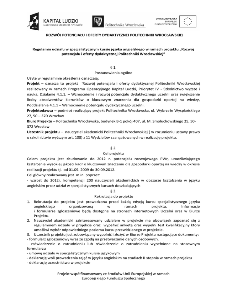 ROZWÓJ POTENCJAŁU I OFERTY DYDAKTYCZNEJ POLITECHNIKI WROCŁAWSKIEJ Regulamin udziału w specjalistycznym kursie języka angielskiego w ramach projektu „Rozwój potencjału i oferty dydaktycznej Politechniki Wrocławskiej” § 1. Postanowienia ogólne Użyte w regulaminie określenia oznaczają: Projekt – oznacza to projekt ‘Rozwój potencjału i oferty dydaktycznej Politechniki Wrocławskiej realizowany w ramach Programu Operacyjnego Kapitał Ludzki, Priorytet IV - Szkolnictwo wyższe i nauka, Działanie 4.1.1. – Wzmocnienie i rozwój potencjału dydaktycznego uczelni oraz zwiększenie liczby absolwentów kierunków o kluczowym znaczeniu dla gospodarki opartej na wiedzy, Poddziałanie 4.1.1 – Wzmocnienie potencjału dydaktycznego uczelni. Projektodawca – podmiot realizujący projekt Politechnika Wrocławska, ul. Wybrzeże Wyspiańskiego 27, 50 – 370 Wrocław Biuro Projektu – Politechnika Wrocławska, budynek B-1 pokój 407, ul. M. Smoluchowskiego 25, 50372 Wrocław Uczestnik projektu – nauczyciel akademicki Politechniki Wrocławskiej ( w rozumieniu ustawy prawo o szkolnictwie wyższym art. 108) z 11 Wydziałów zaangażowanych w realizację projektu. § 2. Cel projektu Celem projektu jest zbudowanie do 2012 r. potencjału rozwojowego PWr, umożliwiającego kształcenie wysokiej jakości kadr o kluczowym znaczeniu dla gospodarki opartej na wiedzy w okresie realizacji projektu tj. od 01.09. 2009 do 30.09.2012. Cel główny realizowany jest m.in. poprzez: - wzrost do 2012r. kompetencji 200 nauczycieli akademickich w obszarze kształcenia w języku angielskim przez udział w specjalistycznych kursach doszkalających § 3. Rekrutacja do projektu 1. Rekrutacja do projektu jest prowadzona przed każdą edycją kursu specjalistycznego języka angielskiego organizowaną w ramach projektu. Informacje i formularze zgłoszeniowe będą dostępne na stronach internetowych Uczelni oraz w Biurze Projektu. 2. Nauczyciel akademicki zainteresowany udziałem w projekcie ma obowiązek zapoznać się z regulaminem udziału w projekcie oraz wypełnić ankietę oraz wypełni test kwalifikacyjny który umożliwi wybór odpowiedniego poziomu kursu przewidzianego w projekcie. 3. Uczestnik projektu jest zobowiązany wypełnić i złożyć w Biurze Projektu następujące dokumenty: - formularz zgłoszeniowy wraz ze zgodą na przetwarzanie danych osobowych. - zaświadczenie o zatrudnieniu lub oświadczenie o zatrudnieniu wypełnione na stosownym formularzu - umowę udziału w specjalistycznym kursie językowym - deklarację woli prowadzenia zajęć w języku angielskim na studiach II stopnia w ramach projektu - deklarację uczestnictwa w projekcie Projekt współfinansowany ze środków Unii Europejskiej w ramach Europejskiego Funduszu Społecznego ROZWÓJ POTENCJAŁU I OFERTY DYDAKTYCZNEJ POLITECHNIKI WROCŁAWSKIEJ - akceptację Dziekana dla kandydatury Uczestnika projektu do prowadzenia zajęć w języku angielskim na studiach II stopnia w ramach Projektu1 4. Nauczyciel akademicki, który nie złoży wymaganych dokumentów nie może być uczestnikiem projektu. 5. O udziale w projekcie decyduje kolejność zgłoszeń zgodnie z Regulaminem Rekrutacji. Dla osób, które nie znajdą się na liście uczestników - będzie utworzona lista rezerwowa. § 4. Udział w projekcie Każdy uczestnik projektu ma prawo do otrzymania bezpłatnego wsparcia w postaci: · Minimum 60 godzin „Specjalistycznego kursu szkoleniowego Academic English I lub II” na poziomie zgodnym z kompetencjami językowymi Uczestnika projektu. § 1 indywidualnej wizytacji lektora podczas zajęć prowadzonych przez Uczestnika. § 2 godzin „Specjalistycznego kursu personalizowanego” § Podręcznika do kursu Academic English I i/lub II – 150 szt. dla uczestników AE I oraz 150 szt. dla uczestników AE II. 1. 2. 3. 4. § 5. Postanowienia końcowe Uczestnik projektu zobowiązany jest poddać się badaniu ewaluacyjnemu, które zostanie przeprowadzone na pierwszych oraz na ostatnich zajęciach. Uczestnik projektu zobowiązany jest poddać się badaniu satysfakcji, oceniającego min organizację zajęć, merytoryczne przygotowanie lektorów itp., które zostanie przeprowadzone na ostatnich zajęciach. Uczestnik projektu ma obowiązek niezwłocznie powiadomić Projektodawcę o wszystkich zmianach danych osobowych (adres, telefon itp.) W przypadkach nieuregulowanych niniejszym Regulaminem decyzję podejmuje Kierownik Projektu. Wrocław dnia………………………. …………………………… Czytelny podpis 1 W razie niedoboru uczestników, będą przyjmowane także osoby bez akceptacji Dziekana Wydziału, jednak zobowiązane będą do złożenia deklaracji woli poprowadzenia zajęć w języku angielskim na wskazanym Wydziale w przypadku takiej konieczności. Projekt współfinansowany ze środków Unii Europejskiej w ramach Europejskiego Funduszu Społecznego