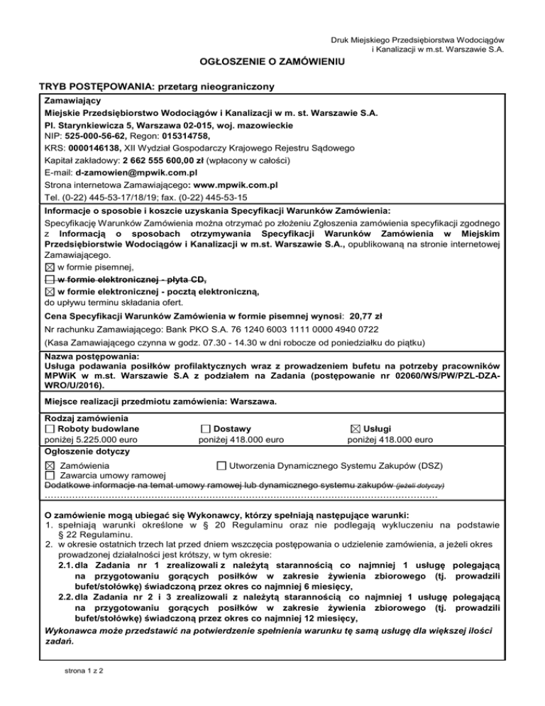 Druk Miejskiego Przedsiębiorstwa Wodociągów i Kanalizacji w m.st. Warszawie S.A. OGŁOSZENIE O ZAMÓWIENIU TRYB POSTĘPOWANIA: przetarg nieograniczony Zamawiający Miejskie Przedsiębiorstwo Wodociągów i Kanalizacji w m. st. Warszawie S.A. Pl. Starynkiewicza 5, Warszawa 02-015, woj. mazowieckie NIP: 525-000-56-62, Regon: 015314758, KRS: 0000146138, XII Wydział Gospodarczy Krajowego Rejestru Sądowego Kapitał zakładowy: 2 662 555 600,00 zł (wpłacony w całości) E-mail: [email protected] Strona internetowa Zamawiającego: www.mpwik.com.pl Tel. (0-22) 445-53-17/18/19; fax. (0-22) 445-53-15 Informacje o sposobie i koszcie uzyskania Specyfikacji Warunków Zamówienia: Specyfikację Warunków Zamówienia można otrzymać po złożeniu Zgłoszenia zamówienia specyfikacji zgodnego z Informacją o sposobach otrzymywania Specyfikacji Warunków Zamówienia w Miejskim Przedsiębiorstwie Wodociągów i Kanalizacji w m.st. Warszawie S.A., opublikowaną na stronie internetowej Zamawiającego. w formie pisemnej, w formie elektronicznej - płyta CD, w formie elektronicznej - pocztą elektroniczną, do upływu terminu składania ofert. Cena Specyfikacji Warunków Zamówienia w formie pisemnej wynosi: 20,77 zł Nr rachunku Zamawiającego: Bank PKO S.A. 76 1240 6003 1111 0000 4940 0722 (Kasa Zamawiającego czynna w godz. 07.30 - 14.30 w dni robocze od poniedziałku do piątku) Nazwa postępowania: Usługa podawania posiłków profilaktycznych wraz z prowadzeniem bufetu na potrzeby pracowników MPWiK w m.st. Warszawie S.A z podziałem na Zadania (postępowanie nr 02060/WS/PW/PZL-DZAWRO/U/2016). Miejsce realizacji przedmiotu zamówienia: Warszawa. Rodzaj zamówienia Roboty budowlane poniżej 5.225.000 euro Ogłoszenie dotyczy Dostawy poniżej 418.000 euro Usługi poniżej 418.000 euro Zamówienia Utworzenia Dynamicznego Systemu Zakupów (DSZ) Zawarcia umowy ramowej Dodatkowe informacje na temat umowy ramowej lub dynamicznego systemu zakupów (jeżeli dotyczy) ………………………………………………………………………………………………………………… O zamówienie mogą ubiegać się Wykonawcy, którzy spełniają następujące warunki: 1. spełniają warunki określone w § 20 Regulaminu oraz nie podlegają wykluczeniu na podstawie § 22 Regulaminu. 2. w okresie ostatnich trzech lat przed dniem wszczęcia postępowania o udzielenie zamówienia, a jeżeli okres prowadzonej działalności jest krótszy, w tym okresie: 2.1. dla Zadania nr 1 zrealizowali z należytą starannością co najmniej 1 usługę polegającą na przygotowaniu gorących posiłków w zakresie żywienia zbiorowego (tj. prowadzili bufet/stołówkę) świadczoną przez okres co najmniej 6 miesięcy, 2.2. dla Zadania nr 2 i 3 zrealizowali z należytą starannością co najmniej 1 usługę polegającą na przygotowaniu gorących posiłków w zakresie żywienia zbiorowego (tj. prowadzili bufet/stołówkę) świadczoną przez okres co najmniej 12 miesięcy, Wykonawca może przedstawić na potwierdzenie spełnienia warunku tę samą usługę dla większej ilości zadań. strona 1 z 2 Zamawiający dopuszcza składanie ofert częściowych na poszczególne zadania: Liczba zadań: 3 Zamawiający dopuszcza składanie ofert wariantowych: tak tak nie nie Termin realizacji zamówienia / Okres realizacji zamówienia: Zadanie nr 1: od dnia 02.01.2017 r. do dnia 31.10.2017 r. Zadanie nr 2 i 3: od dnia 02.01.2017 r. do dnia 31.12.2018 r. lub do wyczerpania maksymalnego wynagrodzenia, w zależności od tego, które z tych zdarzeń nastąpi jako pierwsze. Wymagane wadium: Zadanie nr 1 - Zamawiający odstępuje od żądania wniesienia wadium, Zadanie nr 2 - 6.000,00 zł (słownie złotych: sześć tysięcy 00/100), Zadanie nr 3 - 12.000,00 zł (słownie złotych: dwanaście tysięcy 00/100). Zabezpieczenie należytego wykonania umowy wynosi: Kryteria oceny ofert i ich znaczenie wyrażone w procentach: Cena 100 % Inne kryteria …..% …………………………………………………………………………………………… (opis kryterium) Miejsce i termin składania ofert: siedziba Zamawiającego, pokój numer: 313, do dnia 09/12/2016 r. do godziny: 10:45 Miejsce i termin otwarcia ofert: siedziba Zamawiającego, pokój numer: 315, w dniu 09/12/2016 r. godzina: 11:00 Informacje dodatkowe: Do oferty należy dołączyć: - wypełniony formularz cenowy (zgodnie ze wzorem stanowiącym załącznik nr 5a-c do SWZ) - oświadczenie wykonawcy, iż w okresie ostatnich 5 lat zdobył co najmniej dwuletnie doświadczenie w prowadzeniu działalności gastronomicznej (załącznik nr 7 do SWZ). - dokumenty wymienione w pkt 8.1. SWZ - dowód wniesienia wadium (na zasadach określonych w pkt 9 SWZ) Data zamieszczenia ogłoszenia o zamówieniu 02/12/2016 r. strona 2 z 2