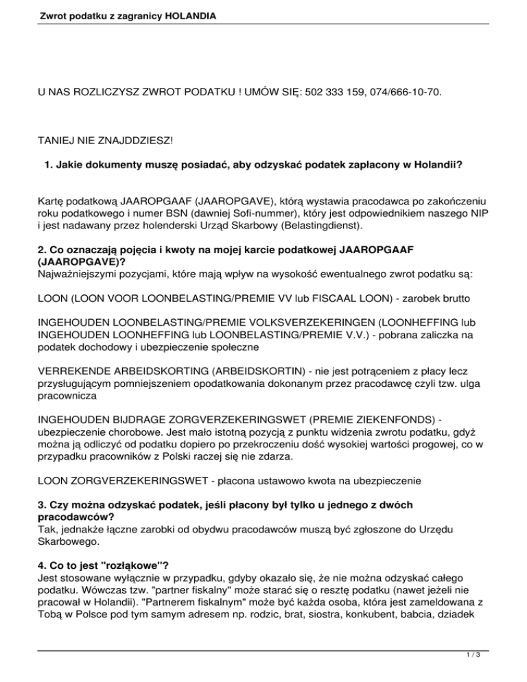 Zwrot podatku z zagranicy HOLANDIA U NAS ROZLICZYSZ ZWROT PODATKU ! UMÓW SIĘ: 502 333 159, 074/666-10-70. TANIEJ NIE ZNAJDDZIESZ! 1. Jakie dokumenty muszę posiadać, aby odzyskać podatek zapłacony w Holandii? Kartę podatkową JAAROPGAAF (JAAROPGAVE), którą wystawia pracodawca po zakończeniu roku podatkowego i numer BSN (dawniej Sofi-nummer), który jest odpowiednikiem naszego NIP i jest nadawany przez holenderski Urząd Skarbowy (Belastingdienst). 2. Co oznaczają pojęcia i kwoty na mojej karcie podatkowej JAAROPGAAF (JAAROPGAVE)? Najważniejszymi pozycjami, które mają wpływ na wysokość ewentualnego zwrot podatku są: LOON (LOON VOOR LOONBELASTING/PREMIE VV lub FISCAAL LOON) - zarobek brutto INGEHOUDEN LOONBELASTING/PREMIE VOLKSVERZEKERINGEN (LOONHEFFING lub INGEHOUDEN LOONHEFFING lub LOONBELASTING/PREMIE V.V.) - pobrana zaliczka na podatek dochodowy i ubezpieczenie społeczne VERREKENDE ARBEIDSKORTING (ARBEIDSKORTIN) - nie jest potrąceniem z płacy lecz przysługującym pomniejszeniem opodatkowania dokonanym przez pracodawcę czyli tzw. ulga pracownicza INGEHOUDEN BIJDRAGE ZORGVERZEKERINGSWET (PREMIE ZIEKENFONDS) ubezpieczenie chorobowe. Jest mało istotną pozycją z punktu widzenia zwrotu podatku, gdyż można ją odliczyć od podatku dopiero po przekroczeniu dość wysokiej wartości progowej, co w przypadku pracowników z Polski raczej się nie zdarza. LOON ZORGVERZEKERINGSWET - płacona ustawowo kwota na ubezpieczenie 3. Czy można odzyskać podatek, jeśli płacony był tylko u jednego z dwóch pracodawców? Tak, jednakże łączne zarobki od obydwu pracodawców muszą być zgłoszone do Urzędu Skarbowego. 4. Co to jest "rozłąkowe"? Jest stosowane wyłącznie w przypadku, gdyby okazało się, że nie można odzyskać całego podatku. Wówczas tzw. "partner fiskalny" może starać się o resztę podatku (nawet jeżeli nie pracował w Holandii). "Partnerem fiskalnym" może być każda osoba, która jest zameldowana z Tobą w Polsce pod tym samym adresem np. rodzic, brat, siostra, konkubent, babcia, dziadek 1/3 Zwrot podatku z zagranicy HOLANDIA itp. 5. Co można zrobić nie posiadając dokumentu Jaaropgaaf (Jaaropgave)? Czy informacja o pracodawcach wystarczy, aby odzyskać podatki? Jeśli nie posiadasz Jaaropgaaf (Jaaropgave), możemy wystąpić w Twoim imieniu o wystawienie niezbędnych dokumentów. W tym celu należy przesłać do nas kopię umowy o pracę lub rozliczenie miesięczne. Może to jednak spowodować pewne opóźnienie w procedurze zwrotu podatku. Chcielibyśmy podkreślić fakt, że w Twoim własnym interesie jest otrzymanie od pracodawcy Jaaropgaaf, co ułatwi i przyśpieszy proces odzyskiwania podatku. 6. Jakie są konsekwencje, jeśli okaże się, że jestem winien pieniądze holenderskiemu urzędowi podatkowemu? Jeśli okaże się, że jesteś winien pieniądze holenderskiemu urzędowi podatkowemu, poinformujemy Cię o tym. Nie robimy takich rozliczeń podatkowych!!! 7. Co to jest Sofi-nummer (BSN)? Jest to odpowiednik polskiego Numeru Identyfikacji Podatkowej (NIP). Posiadając numer BSN (Burger Service Nummer) można o wiele sprawniej załatwić różne sprawy urzędowe. BSN zastąpił dotychczasowy SOFI-nummer. Nie można odzyskać podatku nie posiadając numeru BSN, który zawsze można znaleźć na swojej karcie podatkowej JAAROPGAAF (JAAROPGAVE). 8. Jak długo trwa proces odzyskiwania podatków? Zazwyczaj upływa 3-6 miesięcy pod warunkiem, że wypełnione formularze za miniony rok podatkowy zostały złożone u nas przed końcem marca bieżącego roku. Termin ten może jednak ulec wydłużeniu, jeśli urząd podatkowy będzie potrzebował dodatkowych informacji. Czas oczekiwania na zwrot podatku tylko w małym stopniu zależy od rozliczającej firmy. Żadna firma nie może wpłynąć na urząd skarbowy aby ten rozpatrzył jej sprawy priorytetowo. Deklarowane więc przez firmy "najszybsze zwroty" to tylko chwyt reklamowy, który nie odpowiada rzeczywistości i jest oszustwem. 9. Od czego zależy, jaką kwotę zwrotu otrzymam? Kwota zwrotu, o którą można ubiegać się, zależy od kilku czynników. Między innymi od wysokości Twojego całkowitego dochodu, długości pobytu, miejsca pracy. Również posiadanie dzieci wpływa na kwotę zwrotu. Ważne jest również to, w jaki sposób starasz się o zwrot. Próbując rozliczać się samodzielnie możesz popełnić błędy, które spowodują mniejszy zwrot. Jako specjaliści w dziedzinie holenderskiego podatku gwarantujemy Ci zwrot najwyższej możliwej do odzyskania kwoty. 10. Za jaki okres można ubiegać się o zwrot podatku? Deklaracje podatkowe można składać w holenderskim Urzędzie Skarbowym za ostatnie 5 lat np. w roku 2014 składamy deklaracje za lata: 2013, 2012, 2011, 2010, 2009. 2/3 Zwrot podatku z zagranicy HOLANDIA Z nami rozliczysz zwrot podatku. Zapraszamy ! [powrót na górę] 3/3