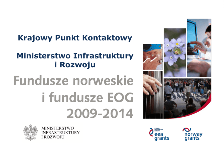 Krajowy Punkt Kontaktowy Ministerstwo Infrastruktury i Rozwoju Podział alokacji dla poszczególnych państw–beneficjentów (w procentach) I edycja 2004-2009 II edycja 2009-2014 Łotwa 4,33 Litwa 5,43 Malta 0,29 Hiszpania 3,7 Węgry 10,9 Grecja 2,77 Estonia 2,65 Słowacja 5,67 Słowenia 1,5 Czechy 8,95 Cypr 0,37 Bułgaria 1,74 % Rumunia 4,08 Portugalia 2,53 Łotwa 4,08 Litwa 4,7 Hiszpania 2,56 Malta 0,25 Węgry 8,57 Słowacja 4,51 Słowenia 1,5 Grecja 3,54 Estonia 2,72 Czechy 7,37 Cypr 0,44 % Rumunia 17,1 Bułgaria 7,1 Portugalia 3,24 Polska 45,08 Polska 32,32 Na tle 15 krajów otrzymujących pomoc w ramach Mechanizmów Finansowych, Polska dysponuje najwyższą alokacją, dlatego wysokość zakontraktowanych i wydatkowanych środków plasuje Polskę na pierwszym miejscu wśród krajów - beneficjentów wsparcia. Fundusze norweskie i EOG w Polsce I edycja 2004-2009 (zakończona): • alokacja dla Polski 558,6 mln euro, • 10 Obszarów Priorytetowych, • wnioskodawcy złożyli łącznie 2720 wniosków, • dofinansowanie otrzymało 413 pojedynczych projektów i programów, • ponadto w ramach 4 grantów blokowych odbyły się łącznie 23 konkursy, w wyniku których dofinansowanie przyznano 1000 projektów. II edycja 2009-2014 (etap wdrażania): • alokacja dla Polski 578,1 mln euro, • 17 programów oraz Pomoc Techniczna/FWD, •złożono już ponad 5000 wniosków •obecnie trwa początkowy etap wdrażania programów, w tym nabory wniosków w ramach konkursów, ocena złożonych aplikacji, wdrażanie projektów predefiniowanych oraz realizacji innych działań prowadzonych przez Operatorów Programów. Projekty realizowane w ramach poprzedniej edycji Mechanizmów Finansowych wg typu beneficjentów – prawie 50% jst (200 z 413) Władze krajowe; 28; 7% ;Jednostki służby zdrowia 8% ;34 Jednostki samorządu terytorialnego; 200; 49% NGO; 34; 8% Inne; 50; 12% Przedsiębiorstwa; 4; 1% -Ośrodki badawczo rozwojowe; 63; 15% Mechanizmy Finansowe w Polsce - środki na ochronę zdrowia Edycja MF Obszar Tematyczny/Program Całkowita alokacja z Mechanizmów Finansowych I edycja MF 2004-2009 Obszar Tematyczny nr 5: Opieka zdrowotna i opieka nad dzieckiem 59 mln EUR II edycja MF 2009-2014 Program nr PL07: Poprawa i lepsze dostosowanie ochrony zdrowia do trendów demograficznoepidemiologicznych 72 mln EUR Program nr PL13: Ograniczanie społecznych nierówności w zdrowiu 18 mln EUR I edycja Mechanizmów Finansowych 2004-2009 Obszar Tematyczny: Opieka zdrowotna i opieka nad dzieckiem • Alokacja: 59 mln EURO 59 mln euro dla 74 projektów Każdej inwestycji towarzyszył komponent „miękki” oparty na badaniach profilaktycznych czy programie promocji zdrowia. Rezultaty - wybudowano 113 stref rekreacji dziecięcej, wsparto 43 szpitale, w których dokonano modernizacji pomieszczeń, czy przeprowadzono remont Oddziałów, zrealizowano 146 programów profilaktycznych i przesiewowych, zakupiono ponad tysiąc sztuk sprzętu diagnostycznego i ponad 12 tys. sztuk innego sprzętu medycznego oraz sportowego, rehabilitacyjnego i informatycznego. Łącznie z projektów w ramach priorytetu skorzystało 320 tys. dorosłych oraz ponad 408 tys. dzieci II edycja Mechanizmów Finansowych 2009-2014 2 Programy z obszaru ochrony zdrowia Alokacja: 90 mln EURO PL07 Zdrowotny program inwestycyjny (Alokacja: 72 mln EUR) • Środki w ramach naboru przeznaczone na projekty z 3 następujących obszarów tematycznych: 1. Poprawa opieki perinatalnej - świadczenia z zakresu profilaktyki, diagnostyka i leczenie w celu zwiększenia liczby urodzeń; 2. Lepsze dostosowanie opieki zdrowotnej w celu sprostania potrzebom szybko rosnącej populacji osób przewlekle chorych i niesamodzielnych oraz osób starszych; 3. Profilaktyka chorób nowotworowych mająca na celu zmniejszenie wskaźnika zachorowalności i śmiertelności z powodu nowotworów w Polsce. • 28 czerwca 2013 r. – zakończenie naboru wniosków • Alokacja na nabór: ponad 52,5 mln EUR • 585 wniosków złożono • I połowa 2014 roku – zakończenie oceny wniosków PL13 Ograniczanie społecznych nierówności w zdrowiu (Alokacja: 18 mln EUR) • Styczeń 2014 r. – rozpoczęcie realizacji projektu predefiniowanego • Marzec 2014 r. – ogłoszenie ograniczonego naboru wniosków • Alokacja na nabór: ponad 15,4 mln EUR • Nabór skierowany do grupy 156 powiatów II edycja Mechanizmów Finansowych 2009-2014 Ostatnie nabory wniosków Alokacja na nabór Uprawnieni wnioskodawcy Termin składania aplikacji PL04 Oszczędzanie energii i promowanie odnawialnych źródeł energii (ograniczenie emisji gazów cieplarnianych i zanieczyszczeń powietrza ) Ponad 12,6 mln EUR Małe, średnie i duże przedsiębiorstwa do 7 kwietnia 2014 r. PL13 Ograniczanie społecznych nierówności w zdrowiu (projekty profilaktyczne i działania edukacyjne o tematyce zdrowotnej) Ponad 15,4 mln EUR 156 powiatów od 31 marca 2014 r. PL18 Innowacje w zakresie zielonych technologii Innovation Norway (poprawa wpływu przedsiębiorstw na środowisko) Ponad 17,7 mln EUR Małe i średnie przedsiębiorstwa do 28 maja 2014 r. Nr Programu Nazwa Programu (zakres naboru) Stosunki bilateralne Znakiem szczególnym II edycji funduszy norweskich i EOG jest nacisk na wzmocnienie współpracy dwustronnej z Państwami-Darczyńcami, tj. Islandią, Liechtensteinem, Norwegią. Wyrazem takiego podejścia jest: • ustanowienie tzw. programów partnerskich, np. program PL13 „Ograniczanie społecznych nierówności w zdrowiu” wdrażany we współpracy z Norweskim Dyrektoriatem ds. Zdrowia, • powołanie funduszy współpracy dwustronnej na poziomie krajowym i programowym, • promowanie współpracy partnerskiej na poziomie projektów. Fundusz Współpracy Dwustronnej na poziomie krajowym stanowi elastyczne źródło finansowania inicjatyw przyczyniających się do wzmacniania stosunków dwustronnych z Państwami-Darczyńcami. Dziękuję za uwagę www.eog.gov.pl Michał Ziętara Dyrektor Krajowego Punktu K