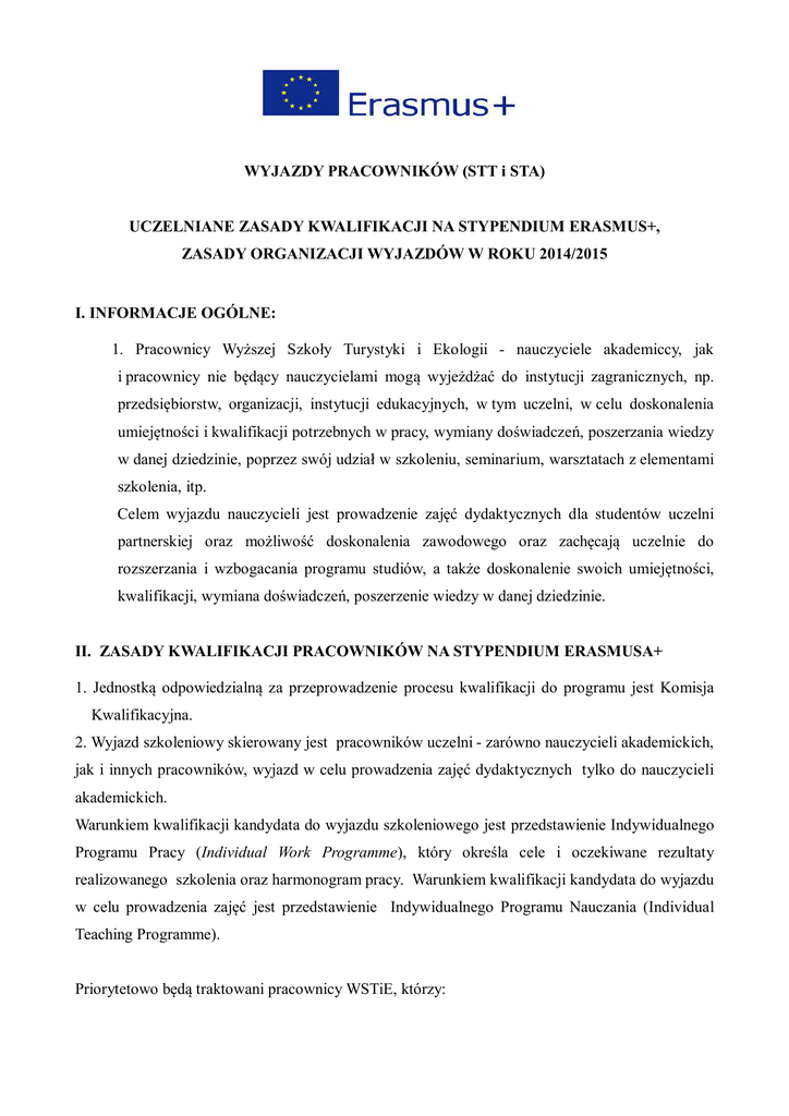 WYJAZDY PRACOWNIKÓW (STT i STA) UCZELNIANE ZASADY KWALIFIKACJI NA STYPENDIUM ERASMUS+, ZASADY ORGANIZACJI WYJAZDÓW W ROKU 2014/2015 I. INFORMACJE OGÓLNE: 1. Pracownicy Wyższej Szkoły Turystyki i Ekologii - nauczyciele akademiccy, jak i pracownicy nie będący nauczycielami mogą wyjeżdżać do instytucji zagranicznych, np. przedsiębiorstw, organizacji, instytucji edukacyjnych, w tym uczelni, w celu doskonalenia umiejętności i kwalifikacji potrzebnych w pracy, wymiany doświadczeń, poszerzania wiedzy w danej dziedzinie, poprzez swój udział w szkoleniu, seminarium, warsztatach z elementami szkolenia, itp. Celem wyjazdu nauczycieli jest prowadzenie zajęć dydaktycznych dla studentów uczelni partnerskiej oraz możliwość doskonalenia zawodowego oraz zachęcają uczelnie do rozszerzania i wzbogacania programu studiów, a także doskonalenie swoich umiejętności, kwalifikacji, wymiana doświadczeń, poszerzenie wiedzy w danej dziedzinie. II. ZASADY KWALIFIKACJI PRACOWNIKÓW NA STYPENDIUM ERASMUSA+ 1. Jednostką odpowiedzialną za przeprowadzenie procesu kwalifikacji do programu jest Komisja Kwalifikacyjna. 2. Wyjazd szkoleniowy skierowany jest pracowników uczelni - zarówno nauczycieli akademickich, jak i innych pracowników, wyjazd w celu prowadzenia zajęć dydaktycznych tylko do nauczycieli akademickich. Warunkiem kwalifikacji kandydata do wyjazdu szkoleniowego jest przedstawienie Indywidualnego Programu Pracy (Individual Work Programme), który określa cele i oczekiwane rezultaty realizowanego szkolenia oraz harmonogram pracy. Warunkiem kwalifikacji kandydata do wyjazdu w celu prowadzenia zajęć jest przedstawienie Indywidualnego Programu Nauczania (Individual Teaching Programme). Priorytetowo będą traktowani pracownicy WSTiE, którzy: ubiegają się o wyjazd z programu Erasmus+ po raz pierwszy, najmłodsi stażem, prowadzący zajęcia w języku obcym dla studentów Erasmusa, nie będący nauczycielami akademickimi (wyjazdy szkoleniowe) 3. Pracownik/nauczyciel akademicki zakwalifikowany na wyjazd musi spełniać następujące kryteria formalne: być związany stosunkiem pracy z Wyższą Szkołą Turystyki i Ekologii ; podstawą zatrudnienia musi być umowa o pracę lub inna umowa cywilno-prawna; mieć obywatelstwo polskie, inne lub status bezpaństwowca, pracownik WSTiE nie będący obywatelem polskim nie może wyjechać do swojego kraju, wymagany poziom znajomości języka angielskiego i/lub języka obowiązującego w danym kraju: na poziomie B2 – wyjazdy dydaktyczne na poziomie B1 – wyjazdy szkoleniowe 4. Podstawę kwalifikacji pracownika na wyjazd w celu szkoleniowym powinien stanowić Indywidualny Program Szkolenia (Individual Work Programme) lub propozycja tego programu, z którego wynika, że program szkolenia oraz zakładane rezultaty przyczynią się do podwyższenia kwalifikacji zawodowych pracownika. W przypadku braku Indywidualnego Programu Szkolenia kandydatura pracownika na wyjazd zostaje odrzucona. 5. Podstawę kwalifikacji pracownika na wyjazd w celu prowadzenia zajęć powinien stanowić Indywidualny Program Nauczania (Individual Teaching Programme), z którego wynika, że program nauczania oraz zakładane rezultaty przyczynią się do podwyższenia kwalifikacji zawodowych pracownika. W przypadku braku Indywidualnego Programu Nauczania (Individual Teaching Programme), kandydatura pracownika na wyjazd zostaje odrzucona. 6. W przypadku większej ilości zgłoszeń niż liczba dostępnych miejsc utworzona zostanie lista rezerwowa. 7. Aplikujący pracownicy zostaną indywidualnie poinformowani o decyzjach Komisji Kwalifikacyjnej w terminie 5 dni roboczych od daty złożenia wniosku. 8. Pracownikowi przysługuje prawo do wniesienia odwołania od rozstrzygnięcia komisji kwalifikacyjnej w terminie 5 dni roboczych od dnia ogłoszenia wyników. Odwołanie wnosi się do komisji prowadzącej kwalifikację. III. ZASADY ORGANIZACJI WYJAZDÓW STT i STA 1. Wyjazdy w celu prowadzenia zajęć mogą być realizowane do uczelni, które posiadają Kartę ECHE (Erasmus Charter for Higher Education) ważną w roku akademickim 2014/2015, z którymi WSTiE ma podpisane umowy bilateralne, zaś wyjazdy szkoleniowe i/lub do instytucji, np. przedsiębiorstw, organizacji, instytucji edukacyjnych, w tym uczelni. 2. Szkolenia nie mogą być realizowane w instytucjach Unii Europejskiej, organizacjach zarządzających programami Unii Europejskiej. 3. Zgłoszenia przyjmowane są do 30 kwietnia 2015r. na formularzu zgłoszeniowym. Zgłoszenia złożone po tym terminie mogą być realizowane w miarę posiadania przez Wyższą Szkołę Turystyki i Ekologii wolnych środków finansowych w ramach programu Erasmus+. 4. Zgłoszenia należy składać przynajmniej 1 miesiąc przed planowanym wyjazdem. 5. Przed wyjazdem pracownika zostanie uzgodniony między stronami „Indywidualny program szkolenia” (Individual work programme) lub Indywidualny Program Nauczania (Individual Teaching Programme). 6. Uprawniony czas wyjazdu wg programu Erasmus+ wynosi od 2 dni do 2 miesięcy, jednakże pracownicy Wyższej Szkoły Turystyki i Ekologii będą kwalifikowani na: od 2 do 5 dni roboczych (bez podróży) – wyjazdy w celach dydaktycznych od 5 do 10 dni roboczych (bez podróży) - wyjazdy w celach szkoleniowych Przedłużenie lub skrócenie pobytu będzie rozpatrywane indywidualnie 7. Z każdym wyjeżdżającym pracownikiem WSTiE zostanie sporządzona pisemna umowa. Przekazanie stypendium pracownikowi może nastąpić tylko pod warunkiem zaakceptowania przez niego wszystkich warunków umowy. Stypendium powinno być wypłacone w sposób uzgodniony między stronami. Pracownik zakwalifikowany do wyjazdu otrzymuje dofinansowanie z programu Erasmus+. Podpisanie umowy następuje na przed wyjazdem. Umowa stanowi podstawę do wypłacenia stypendium. 8. Do obowiązków pracownika należy posiadanie właściwego ubezpieczenia na czas podróży i pobytu w instytucji przyjmującej (co najmniej koszty leczenia i