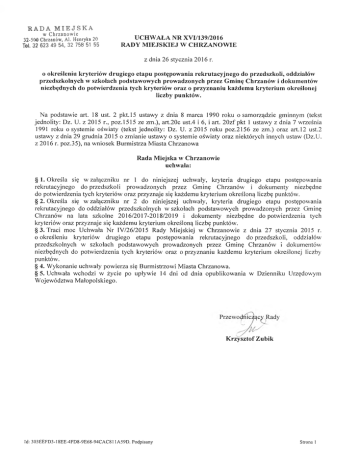 RADA MIEJSKA w C hrzan o w ie 32-500 Chrzanów, Al. Henryka 20 Teł. 32 623 49 54, 32 758 51 55 U C H W A Ł A N R X V I/139/2016 R A D Y M IE JS K IE J W C H R Z A N O W IE z dnia 26 stycznia 2016 r. o ok reślen iu k ryteriów d ru giego etapu p ostęp ow an ia rek ru tacyjn ego do p rzed szk oli, od działów p rzedszkolnych w szk ołach p od staw ow ych p row ad zon ych p rzez G m in ę C h rzan ów i d ok u m en tów n iezbędnych do p otw ierd zen ia tych k ryteriów oraz o p rzyznan iu k ażd em u kryterium określonej liczb y p unktów . N a podstaw ie art. 18 ust. 2 pkt. 15 ustaw y z dnia 8 m arca 1990 roku o sam orządzie gm innym (tekst jed n o lity : Dz. U. z 2015 r., poz.1515 ze zm .), art.20c ust.4 i 6, i art. 2 0 z f p k t 1 ustaw y z dnia 7 w rześnia 1991 roku o system ie ośw iaty (tekst jed n o lity : Dz. U. z 2015 roku poz.2156 ze zm .) oraz art.12 ust.2 u staw y z dnia 29 grudnia 2015 o zm ianie ustaw y o system ie ośw iaty oraz n iektórych innych ustaw (D z.U . z 2016 r. poz.35), na w n io sek B urm istrza M iasta C hrzanow a R ad a M iejsk a w C h rzan ow ie uchw ala: § 1. O kreśla się w załączn ik u n r 1 do niniejszej uchw ały, kryteria drugiego etapu postępow ania rekrutacyjnego do przedszkoli p row adzonych przez G m inę C h rzanów i dokum enty niezbędne do potw ierdzenia tych k ry terió w oraz przyznaje się każdem u kryterium ok reślo n ą liczbę punktów . § 2. O kreśla się w załączn ik u nr 2 do niniejszej uchw ały, kryteria drugiego etapu postępow ania rekrutacyjnego do o d d ziałó w przedszkoln ych w szkołach podstaw ow ych prow adzonych przez G m inę C hrzanów na lata szkolne 2 0 16/2017-2018/2019 i dokum enty n iezbędne do p otw ierdzenia tych kryteriów oraz przyznaje się każdem u kryterium określoną liczbę punktów . § 3. Traci m oc U chw ała N r IY /2 6 /2 0 15 R ady M iejskiej w C hrzanow ie z dnia 27 stycznia 2015 r. o określeniu kryteriów drugiego etapu postępow ania rekrutacyjnego do przedszkoli, oddziałów przedszkolnych w szkołach podstaw ow ych prow adzonych przez G m inę C h rzanów i dokum entów niezbędnych do potw ierd zen ia tych kryteriów oraz o przyznaniu każdem u kryterium określonej liczby punktów . § 4. W ykonanie uchw ały pow ierza się B urm istrzow i M iasta C hrzanow a. § 5. U chw ała w chodzi w życie po upływ ie 14 dni od dnia o p u b lik o w an ia w D zienniku U rzędow ym W ojew ództw a M ałopolskiego. K r z y sz to f Z u b ik Id: 303EEFD3-18EE-4FD8-9E68-94CAC811A59D. Podpisany Strona 1 Z ałącznik N r 1 do U chw ały N r X V I/1 39/2016 R ady M iejskiej w C hrzanow ie z dnia 26 stycznia 2016 r. L.p. 1. 2. 3. 4. 5. 6. Kryteria drugiego etapu postępowania rekrutacyjnego do przedszkoli prowadzonych przez Gminę Chrzanów dziecko ma obowiązek rocznego przygotowania przedszkolnego dziecko ma prawo do korzystania z wychowania przedszkolnego oboje rodzice/prawni opiekunowie dziecka pracują zawodowo, prowadzą działalność gospodarczą lub pobierają naukę w systemie dziennym rodzeństwo dziecka kontynuuje wychowanie przedszkolne w tym samym przedszkolu przedszkole jest najbliższym przedszkolem od miejsca zamieszkania dziecka dzienny czas pobytu dziecka wynosi co najmniej 8 godzin dziennie Punkty Dokumenty niezbędne do potwierdzenia kryteriów 60 pkt - 35 pkt - 30 pkt 20 pkt oświadczenie rodziców o zatrudnieniu/prowadzeniu działalności gospodarczej lub o pobieraniu nauki w systemie dziennym oświadczenie rodziców o kontynuowaniu wychowania przedszkolnego w tym samym przedszkolu przez rodzeństwo dziecka 15 pkt - 10 pkt oświadczenie o deklarowanym pobycie dziecka powyżej 8 godzin dziennie zawarte we wniosku o przyjęcie dziecka do przedszkola 1/ P rzew odniczący R ady ' ^sztof Z u b ik Id: 303EEFD3-18EE-4FD8-9E68-94CAC811A59D. Podpisany Strona 1 Z ałączn ik N r 2 do U chw ały N r X V I/1 39/2016 R ady M iejskiej w C hrzanow ie z dnia 26 stycznia 2016 r. L.p. 1. 2. Kryteria drugiego etapu postępowania rekrutacyjnego do oddziałów przedszkolnych prowadzonych przez Gminę Chrzanów dziecko ma obowiązek rocznego przygotowania przedszkolnego dziecko 5 letnie ma prawo do korzystania z wychowania przedszkolnego Punkty Dokumenty niezbędne do potwierdzenia kryteriów 40 pkt - 40 pkt - 3. dziecko mieszka w obwodzie szkoły 35 pkt 4. rodzeństwo dziecka uczęszcza do zespołu szkół/szkoły, w której funkcjonuje oddział przedszkolny 25 pkt 5. miejsce pracy rodziców/prawnych opiekunów dziecka prowadzenia działalności gospodarczej lub pobierania nauki w systemie dziennym znajduje się w pobliżu szkoły 20 pkt 6. w pobliżu szkoły mieszkają krewni dziecka (babcia, dziadek) wspierający rodziców/prawnych opiekunów w zapewnieniu dziecku właściwej opieki 10 pkt oświadczenie rodziców/ prawnych opiekunów o miejscu zamieszkania dziecka oświadczenie rodziców o uczęszczaniu rodzeństwa dziecka do zespołu szkół/ szkoły, w której funkcjonuje oddział przedszkolny oświadczenie rodziców/prawnych opiekunów o miejscu pracy/ prowadzenia działalności gospodarczej lub pobieraniu nauki w systemie dziennym (adres) oświadczenie rodziców/ prawnych opiekunów o miejscu zamieszkania krewnych dziecka (babci, dziadka) i ich pomocy w zapewnianiu dziecku właściwej opieki P rzew o d n iczący R ady Jw[ K r z y sz to f Z u b ik Id: 303EEFD3-18EE-4FD8-9E68-94CAC811A59D. Podpisany S trona 1