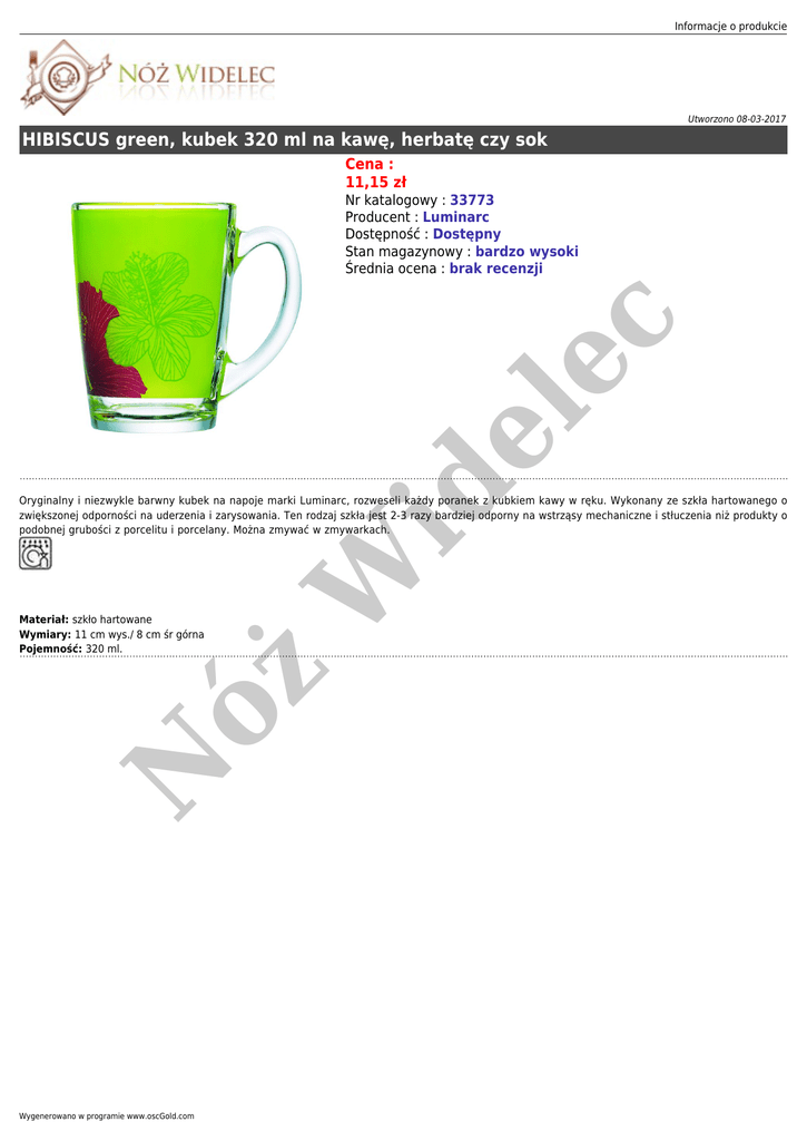 Informacje o produkcie Utworzono 08-03-2017 HIBISCUS green, kubek 320 ml na kawę, herbatę czy sok Cena : 11,15 zł id e le c Nr katalogowy : 33773 Producent : Luminarc Dostępność : Dostępny Stan magazynowy : bardzo wysoki Średnia ocena : brak recenzji N óż Materiał: szkło hartowane Wymiary: 11 cm wys./ 8 cm śr górna Pojemność: 320 ml. W Oryginalny i niezwykle barwny kubek na napoje marki Luminarc, rozweseli każdy poranek z kubkiem kawy w ręku. Wykonany ze szkła hartowanego o zwiększonej odporności na uderzenia i zarysowania. Ten rodzaj szkła jest 2-3 razy bardziej odporny na wstrząsy mechaniczne i stłuczenia niż produkty o podobnej grubości z porcelitu i porcelany. Można zmywać w zmywarkach. Wygenerowano w programie www.oscGold.com