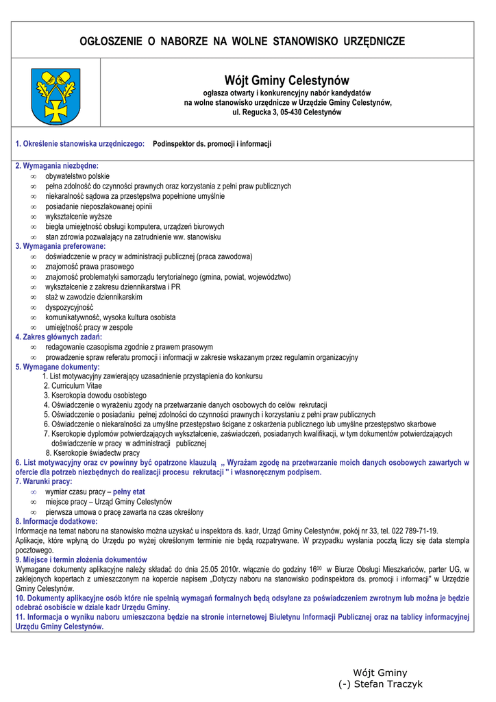 OGŁOSZENIE O NABORZE NA WOLNE STANOWISKO URZĘDNICZE Wójt Gminy Celestynów ogłasza otwarty i konkurencyjny nabór kandydatów na wolne stanowisko urzędnicze w Urzędzie Gminy Celestynów, ul. Regucka 3, 05-430 Celestynów 1. Określenie stanowiska urzędniczego: Podinspektor ds. promocji i informacji 2. Wymagania niezbędne: • obywatelstwo polskie • pełna zdolność do czynności prawnych oraz korzystania z pełni praw publicznych • niekaralność sądowa za przestępstwa popełnione umyślnie • posiadanie nieposzlakowanej opinii • wykształcenie wyŜsze • biegła umiejętność obsługi komputera, urządzeń biurowych • stan zdrowia pozwalający na zatrudnienie ww. stanowisku 3. Wymagania preferowane: • doświadczenie w pracy w administracji publicznej (praca zawodowa) • znajomość prawa prasowego • znajomość problematyki samorządu terytorialnego (gmina, powiat, województwo) • wykształcenie z zakresu dziennikarstwa i PR • staŜ w zawodzie dziennikarskim • dyspozycyjność • komunikatywność, wysoka kultura osobista • umiejętność pracy w zespole 4. Zakres głównych zadań: • redagowanie czasopisma zgodnie z prawem prasowym • prowadzenie spraw referatu promocji i informacji w zakresie wskazanym przez regulamin organizacyjny 5. Wymagane dokumenty: 1. List motywacyjny zawierający uzasadnienie przystąpienia do konkursu 2. Curriculum Vitae 3. Kserokopia dowodu osobistego 4. Oświadczenie o wyraŜeniu zgody na przetwarzanie danych osobowych do celów rekrutacji 5. Oświadczenie o posiadaniu pełnej zdolności do czynności prawnych i korzystaniu z pełni praw publicznych 6. Oświadczenie o niekaralności za umyślne przestępstwo ścigane z oskarŜenia publicznego lub umyślne przestępstwo skarbowe 7. Kserokopie dyplomów potwierdzających wykształcenie, zaświadczeń, posiadanych kwalifikacji, w tym dokumentów potwierdzających doświadczenie w pracy w administracji publicznej 8. Kserokopie świadectw pracy 6. List motywacyjny oraz cv powinny być opatrzone klauzulą ,, WyraŜam zgodę na przetwarzanie moich danych osobowych zawartych w ofercie dla potrzeb niezbędnych do realizacji procesu rekrutacji '' i własnoręcznym podpisem. 7. Warunki pracy: • wymiar czasu pracy – pełny etat • miejsce pracy – Urząd Gminy Celestynów • pierwsza umowa o pracę zawarta na czas określony 8. Informacje dodatkowe: Informacje na temat naboru na stanowisko moŜna uzyskać u inspektora ds. kadr, Urząd Gminy Celestynów, pokój nr 33, tel. 022 789-71-19. Aplikacje, które wpłyną do Urzędu po wyŜej określonym terminie nie będą rozpatrywane. W przypadku wysłania pocztą liczy się data stempla pocztowego. 9. Miejsce i termin złoŜenia dokumentów Wymagane dokumenty aplikacyjne naleŜy składać do dnia 25.05 2010r. włącznie do godziny 1600 w Biurze Obsługi Mieszkańców, parter UG, w zaklejonych kopertach z umieszczonym na kopercie napisem „Dotyczy naboru na stanowisko podinspektora ds. promocji i informacji'' w Urzędzie Gminy Celestynów. 10. Dokumenty aplikacyjne osób które nie spełnią wymagań formalnych będą odsyłane za poświadczeniem zwrotnym lub moŜna je będzie odebrać osobiście w dziale kadr Urzędu Gminy. 11. Informacja o wyniku naboru umieszczona będzie na stronie internetowej Biuletynu Informacji Publicznej oraz na tablicy informacyjnej Urzędu Gminy Celestynów. Wójt Gminy (-) Stefan Traczyk
