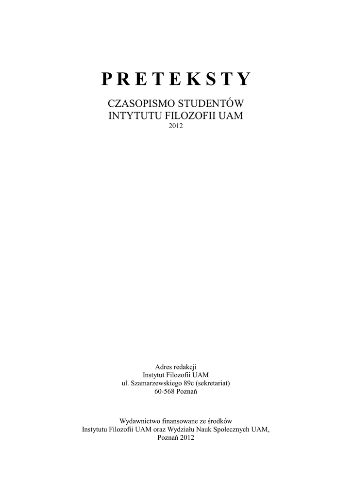 PR ETEK STY CZASOPISMO STUDENTÓW INTYTUTU FILOZOFII UAM 2012 Adres redakcji Instytut Filozofii UAM ul. Szamarzewskiego 89c (sekretariat) 60-568 Poznań Wydawnictwo finansowane ze środków Instytutu Filozofii UAM oraz Wydziału Nauk Społecznych UAM, Poznań 2012 Recenzenci Prof. zw. dr hab. A. Pałubicka Prof. UAM dr hab. R. Liberkowski Prof. UAM dr hab. D. Sobczyńska Prof. UAM dr hab. A. Szczuciński Prof. UAM dr hab. Z. Tworak dr hab. N. Leśniewski Wydawca Koło Studentów Filozofii “CIVIS LIBER” przy Instytucie Filozofii UAM, Poznań Redaktor naczelny Katarzyna Klewenhagen Z-cy redaktora naczelnego Natalia John Michał J. Kosicki Natalia Szydłowska Korekta Natalia John Katarzyna Klewenhagen Michał J. Kosicki Natalia Szydłowska ISSN 1642-2929 Katarzyna Klewenhagen Samotność konstytuującego – podmiot u Husserla Jeden z pierwszych wniosków, jaki nasuwa się po lekturze Medytacji kartezjańskich (1931) Edmunda Husserla (1859 – 1938) to wielość możliwych interpretacji. Konieczne jest zatem uwspólnienie różnych perspektyw. W niniejszej pracy dotyczyć ono będzie fenomenologicznej koncepcji podmiotowości. Od kiedy Sokrates zaczął oczekiwać od innych tego, że będą rozumnymi podmiotami, na drodze przebiegającego dwuetapowo kształcenia: poprzez dążenie do wiedzy pogłębianie relacji z innymi ludźmi, od kiedy sam dał świadectwo bycia samoświadomym podmiotem wypijając cykutę, kwestia podmiotowości, czegoś wewnętrznego wchodzącego w interakcję z zewnętrznym, stała się obecna jako przedmiot filozoficznych badań. Na przestrzeni lat, a w zasadzie całych epok, podmiotowość jako treść filozoficznego namysłu, ewoluowała do najrozmaitszych koncepcji, wśród których trudno o ostateczną typologię. Niemniej wyraźną zmianę, dokonującą rewizji ujęcia podmiotowości, zarysowuje upadek wiary w istnienie substancjalnego podmiotu, a tym samym w możliwość jego uchwytności. Jest to kryterium odróżniające koncepcje nowożytne od współczesnych. Warto podkreślić, iż we współczesności dokonało się zerwanie podwójne: odejście od pojmowania podmiotu jako czystej bezpośredniości, […] człowiecza dusza straciła moc spojrzenia na siebie wewnętrznym okiem swojej uwagi, a wraz z utratą tej mocy, znikła samouchwytność ciała1. Przykładem, który to ilustruje, są rozważania Husserla o podmiocie, które pojawiają się w kontekście budowanej przez niego filozofii fenomenologicznej. U podstaw fenomenologicznej filozofii Husserla leży problem świadomości, jako efekt poszukiwań tego, co dawałoby pewność poznania naukowego. Analiza myśli Kartezjusza doprowadza Husserla do ego cogito - można by rzec - obecnego na gruncie jego koncepcji w postacie czystej świadomości podmiotu poznającego. Taki odczyt jest jednak błędny. Husserl spogląda krytycznie na ego cogito, odrzuca ujęcie kartezjańskie, bowiem nie zgadza się na potraktowanie cogito jako apodyktycznego aksjomatu. Niemniej kartezjańską kategorią oczywistości mierzona jest u Husserla samowiedza podmiotu, którą ten uzyskuje reflektując 1 K. Gurczyńska-Sady, Problem samo uchwytności ciała – Husserl Sartre, [w:] „Diametros” nr 21, Kraków 2009.s. 14. Samotność konstytuującego – podmiot u Husserla nad aktami świadomości (podmiotowe Ja istnieje na zasadzie oczywistości). Należy również dodać, iż z uwagi na zasadniczy cel fenomenologii (niezawodna nauka), czysta świadomość 2 (której nie należy mylić z wiedzą o sobie) ogołocona jest ze wszelkich uwarunkowań przypadłościowych oraz że tym samym nie mamy do czynienia z realnym, konkretnym podmiotem a teoretycznym konstruktem w postaci transcendentalnego Ja3. Platoński wysiłek poznawczy, malowniczo uchwycony w micie jaskini jako gest odwrócenia się od cieni, wyjście z jaskini, przestał być aktualny. Straciły swą ważność słowa Seneki: wejdź raczej w siebie samego, jak to tylko możliwe, (…) wyzwalaj siebie dla siebie. Otóż, nie ma do kogo wracać, a odpodmiotowe poznanie nie jest gwarantem pewności. Paradoksalnie Husserl – podążając tą samą drogą, co Kartezjusz – poszukuje obiektywności, pewności przez, można by powiedzieć, właśnie powrót do siebie, a dokładniej wgląd w istotę. Jego zdaniem rezygnacja z dążenia do prawdy, pewności, byłaby jednoznaczna z upadkiem kultury europejskiej. Aby ocalić prawdę, Husserl mówi o konieczności oparcia się na logice. Szuka metody, która mogłaby uzasadniać wiedzę. Stąd krytyka psychologizmu, nastawienia naturalnego, koncentracja na świadomości oraz ujmowanym przez nią przedmiocie poznania. Chodzi więc o zbadanie relacji między podmiotem a przedmiotem, który staje się przedmiotem poznania, kiedy to jest percypowany przez poznający go podmiot. Z drugiej jednak strony, pisze Marcin Furman: res cogitans nie pojawia się nigdy w rzeczywistości intersubiektywnej explicite, albowiem zawsze jest wyznaczone wtórnie poprzez mowę lub pismo. Stąd wszelka taka światowa afirmacja swojej osoby, w rzeczywistości zakłada rozumiejące audytorium. To znaczy podmiot intersubiektywny jest komplementarnym wyrazem gminy, do której przynależy każda jednostka na zasadzie bycia świadomym4. Husserl wychodzi od kartezjańskiego założenia, iż niewątpliwym jest to, że przeżywamy. A więc obszar badań zawęża się do sfery immanencji. Zarówno Kartezjusz jaki Husserl wkraczają tu w subiektywizm: 2 Czysta świadomość, transcendentalne Ja są tym, co odsłania redukcja transcendentalna. Transcendentalny podmiot, ponadindywidualne Ja wskazuje na podobieństwo myśli Husserla i Kanta. Obaj filozofowie odnosili bowiem poznanie do wspólnej wszystkim podmiot struktury poznawczej gwarantującej obiektywność. Należy jednak mieć na względzie różnicę między kantowskim i husserlowskim podmiotem transcendentalnym, która przebiega ze względu aktywne (Kant) bierne (Husserl) uczestnictwo podmiotu w proce