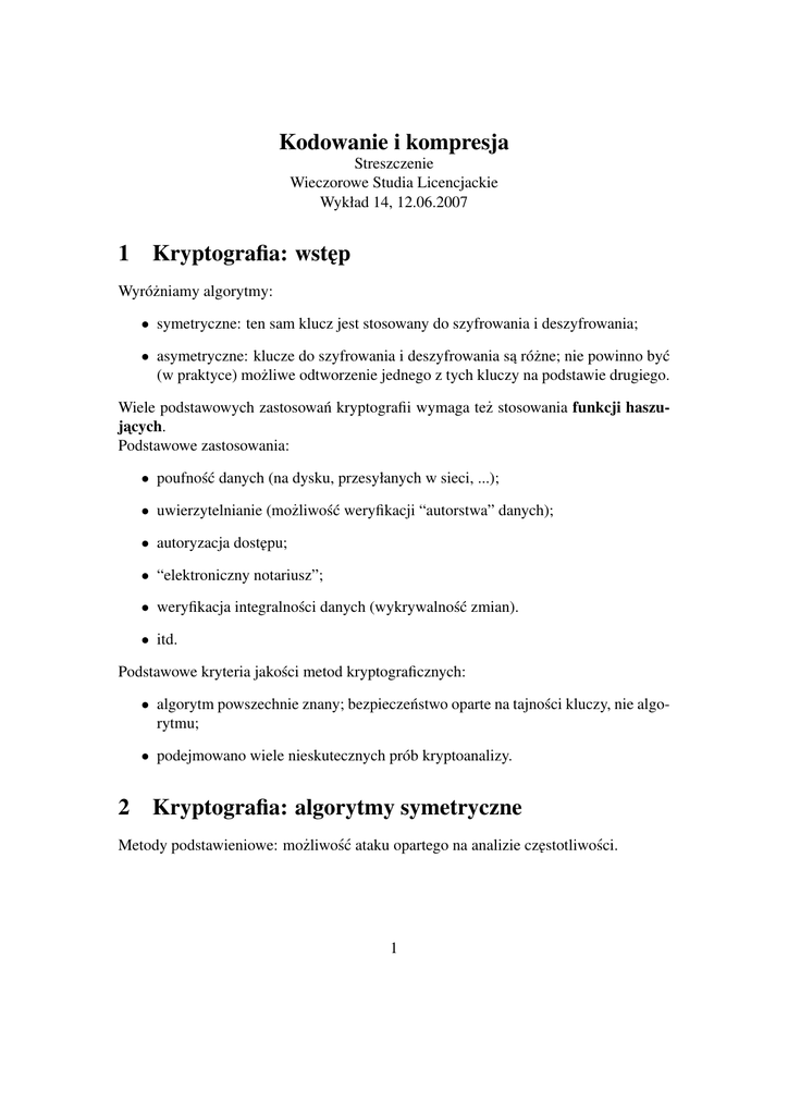 Kodowanie i kompresja 1 Kryptografia: wst˛ep 2 Kryptografia