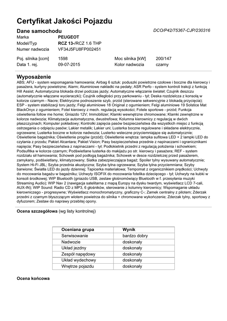 Certyfikat Jakości Pojazdu DCO/P42/75367-CJP/230316 Dane samochodu Marka Model/Typ Numer nadwozia PEUGEOT RCZ 13-/RCZ 1.6 THP VF34J5FU8FP002451 Poj. silnika [ccm] Data 1. rej. 1598 09-07-2015 Moc silnika [kW] Kolor nadwozia 200/147 czarny Wyposażenie ABS; AFU - system wspomagania hamowania; Airbag 6 sztuk: poduszki powietrzne czołowe i boczne dla kierowcy i pasażera, kurtyny powietrzne; Alarm; Aluminiowe nakładki na pedały; ASR Perfo - system kontroli trakcji z funkcją Hill Assist; Automatyczna blokada drzwi podczas jazdy; Automatyczne włączanie świateł; Czujnik deszczu (automatycznie włączane wycieraczki); Czujnik odległości przy parkowaniu - tył; Deska rozdzielcza z konsolą w kolorze czarnym - Nacre; Elektryczne podnoszenie szyb, przód (sterowane sekwencyjnie z blokadą przycięcia); ESP - system stabilizacji toru jazdy; Felgi aluminiowe 18 Original z ogumieniem; Felgi aluminiowe 19 Solstice Mat BlackOnyx z ogumieniem; Fotel kierowcy z mech. regulacją wysokości; Fotele sportowe - przód; Funkcja oświetlenia follow me home; Gniazdo 12V; Immobilizer; Klamki wewnętrzne chromowane; Klamki zewnętrzne w kolorze nadwozia; Klimatyzacja automatyczna, dwustrefowa; Kolumna kierownicy z regulacją w dwóch płaszczyznach; Komputer pokładowy; Kontrolki zapięcia pasów bezpieczeństwa dla wszystkich miejsc z funkcją ostrzegania o odpięciu pasów; Lakier metalik; Lakier uni; Lusterka boczne regulowane i składane elektrycznie, ogrzewane; Lusterka boczne w kolorze nadwozia; Lusterko wsteczne przyciemniające się automatycznie; Oświetlenie bagażnika; Oświetlenie progów (przód); Oświetlenie wnętrza: lampka sufitowa LED + 2 lampki LED do czytania z przodu; Pakiet Alcantara; Pakiet Vision; Pasy bezpieczeństwa przednie z napinaczami i ogranicznikami napięcia; Pasy bezpieczeństwa z napinaczami - tył; Podłokietnik przedni z regulacją położenia i schowkiem; Podsufitka w kolorze czarnym; Podświetlane lusterka do makijażu po str. kierowcy i pasażera; REF - system rozdziału sił hamowania; Schowek pod podłogą bagażnika; Schowek w desce rozdzielczej przed pasażerem, zamykany, podświetlany, klimatyzowany; Siatka zabezpieczająca bagaż; Spoiler tylny wysuwany automatycznie; System Hi-Fi JBL; Szyba przednia akustyczna; Szyba tylna ogrzewana; Szyba tylna przyciemniana; Szyby barwione; Światła LED do jazdy dziennej; Tapicerka materiałowa; Tempomat z organicznikiem prędkości; Uchwyty do mocowania bagażu w bagażniku; Uchwyty ISOFIX do mocowania fotelika dziecięcego - tył; Uchwyty na kubki w konsoli środkowej; WIP Bluetooth (gniazdo USB, zestaw głośnomówiący Bluetooth w f. przesyłania muzyki Streaming Audio); WIP Nav 2 (nawigacja satelitarna z mapą Europy na dysku twardym, wyświetlacz LCD 7-cali, AUX-IN); WIP Sound: Radio CD z MP3, 6 głośników, sterowanie z kolumny kierownicy; Wspomaganie układu kierowniczego - progresywne; Wyświetlacz monochromatyczny, graficzny C-; Zamek centralny z pilotem; Zderzak przedni z czarnym błyszczącym wlotem powietrza do silnika + chromowane wykończenie; Zderzak tylny, sportowy z dyfuzorem; Zestaw do naprawy przebitej opony. Ocena szczegółowa (wg listy kontrolnej) Oceniana grupa Serwisowanie Nadwozie Układ jezdny Zespół napędowy Układ wydechowy Wnętrze pojazdu Ocena końcowa Wynik bardzo dobry doskonały doskonały doskonały doskonały doskonały W wyniku sprawdzenia ponad 150 pkt. kontrolnych w pojeździe stwierdza się: *** Pojazd spełnia standardy techniczne DEKRA dla samochodów używanych *** Ocenę wykonał: Przemysław Kostrzewski, PL