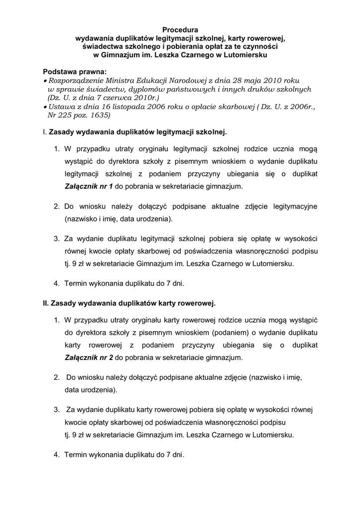 Procedura wydawania duplikatów legitymacji szkolnej, karty rowerowej, świadectwa szkolnego i pobierania opłat za te czynności w Gimnazjum im. Leszka Czarnego w Lutomiersku Podstawa prawna: Rozporządzenie Ministra Edukacji Narodowej z dnia 28 maja 2010 roku w sprawie świadectw, dyplomów państwowych i innych druków szkolnych (Dz. U. z dnia 7 czerwca 2010r.) Ustawa z dnia 16 listopada 2006 roku o opłacie skarbowej ( Dz. U. z 2006r., Nr 225 poz. 1635) I. Zasady wydawania duplikatów legitymacji szkolnej. 1. W przypadku utraty oryginału legitymacji szkolnej rodzice ucznia mogą wystąpić do dyrektora szkoły z pisemnym wnioskiem o wydanie duplikatu legitymacji szkolnej z podaniem przyczyny ubiegania się o duplikat Załącznik nr 1 do pobrania w sekretariacie gimnazjum. 2. Do wniosku należy dołączyć podpisane aktualne zdjęcie legitymacyjne (nazwisko i imię, data urodzenia). 3. Za wydanie duplikatu legitymacji szkolnej pobiera się opłatę w wysokości równej kwocie opłaty skarbowej od poświadczenia własnoręczności podpisu tj. 9 zł w sekretariacie Gimnazjum im. Leszka Czarnego w Lutomiersku. 4. Termin wykonania duplikatu do 7 dni. II. Zasady wydawania duplikatów karty rowerowej. 1. W przypadku utraty oryginału karty rowerowej rodzice ucznia mogą wystąpić do dyrektora szkoły z pisemnym wnioskiem (podaniem) o wydanie duplikatu karty rowerowej z podaniem przyczyny ubiegania się o duplikat Załącznik nr 2 do pobrania w sekretariacie gimnazjum. 2. Do wniosku należy dołączyć podpisane aktualne zdjęcie (nazwisko i imię, data urodzenia). 3. Za wydanie duplikatu karty rowerowej pobiera się opłatę w wysokości równej kwocie opłaty skarbowej od poświadczenia własnoręczności podpisu tj. 9 zł w sekretariacie Gimnazjum im. Leszka Czarnego w Lutomiersku. 4. Termin wykonania duplikatu do 7 dni. III. Zasady wydawania duplikatów świadectw szkolnych 1. W przypadku utraty oryginału świadectwa rodzice ucznia lub pełnoletni absolwent może wystąpić do dyrektora szkoły z pisemnym wnioskiem o wydanie duplikatu świadectwa z podaniem przyczyny ubiegania się o duplikat oraz określeniem: rodzaju świadectwa (ukończenia szkoły/klasy), roku ukończenia szkoły/klasy. Załącznik nr 3 do pobrania w sekretariacie gimnazjum. 2. Za wydanie duplikatu świadectwa szkolnego pobiera się opłatę w wysokości równej kwocie opłaty skarbowej od legalizacji dokumentu tj. 26 zł w sekretariacie gimnazjum. 3. Termin wykonania duplikatu do 7 dni, jeżeli przedłożony wniosek zawiera wymagane informacje, a dokumentacja niezbędna do wystawienia duplikatu znajduje się w szkole. 5. Duplikat wystawia się na druku obowiązującym w okresie wystawienia oryginału lub na formularzu zgodnym z treścią oryginału świadectwa. 6. Duplikat zawiera: wyraz „Duplikat” – na pierwszej stronie u góry, dane zgodne z dokumentacją pedagogiczną, pod tekstem nazwiska i imiona osób, które oryginały podpisały lub stwierdzenie ich nieczytelności, datę wystawienia duplikatu, pieczęć urzędową (okrągłą) 7. Jeżeli szkoła nie posiada dokumentacji przebiegu nauczania (księgi arkuszy ocen) albo nie jest ona wystarczająca do wystawienia duplikatu, wydaje się zaświadczenie stwierdzające, że wystawienie duplikatu nie jest możliwe. 8. W tym przypadku odtworzenie oryginału świadectwa może nastąpić na podstawie odrębnych przepisów, w drodze postępowania sądowego. 9. Duplikat może zostać odebrany osobiście przez osobę zainteresowaną lub przez inne osoby posiadające pisemne upoważnienie po potwierdzeniu odbioru dokumentu własnoręcznym podpisem lub wysyłany jest pod wskazany we wniosku adres listem poleconym za zwrotnym potwierdzeniem odbioru. 10.Duplikat ma moc oryginału i może być wystawiony ponownie. Załącznik Nr 1 …………………………… (miejscowość i data) …………………………………… (imię i nazwisko rodziców/prawnych opiekunów) …………………………………… (adres zamieszkania) …………………………………… Do Dyrektora Gimnazjum im. Leszka Czarnego w Lutomiersku Zwracam się z prośbą o wydanie duplikatu legitymacji szkolnej dla mojego/mojej syna/córki ……………………………................................. ur. ……………………, zam. …………………………………...................... Oświadczam, że ………………………………………………………........... ................................................................................................................... (proszę wskazać, co się stało z oryginałem legitymacji szkolnej – zagubiona, zniszczona) Jednocześnie przyjmuję do wiadomości, że z chwilą otrzymania duplikatu traci ważność oryginał dokumentu. W przypadku odnalezienia utraconego oryginału zobowiązuję się do zwrócenia go do sekretariatu Gimnazjum im. Leszka Czarnego w Lutomiersku. ………………………………………………. (czytelny podpis rodzica/ prawnego opiekuna) Za wydanie duplikatu legitymacji szkolnej pobiera się opłatę w wysokości równej kwocie opłaty skarbowej od poświadczenia własnoręczności podpisu tj. 9 zł w sekretariacie gimnazjum. Ustawa z dnia 16 listopada 2006 roku o opłacie skarbowej ( Dz. U. z 2006r., Nr 225 poz. 1635) Adnotacje Szkoły: ………………………………………………………………………………………………… ………………………………………………………………………………………………… ………………………………………………………………………………………………… Załącznik Nr 2 …………………………… (miejscowość i data) …………………………………… (imię i nazwisko rodziców/prawnych opiekunów) …………………………………… (adres zamieszkania) …………………………………… Do Dyrektora Gimnazjum im. Les