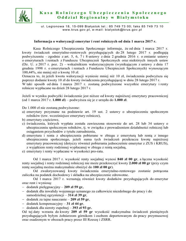 Kasa Rolniczego Ubezpieczenia Społecznego Oddział Regionalny w Białymstoku u l. L e gi o no wa 1 8, 1 5- 09 9 B i a ł ys t ok t e l. : 85 74 9 7 3 0 0; f ak s 8 5 7 4 9 7 3 10 ww w.k r us . g o v. p l, e- m a i l: b i a l ys t ok @k r us . go v . p l Informacja o waloryzacji emerytur i rent rolniczych od dnia 1 marca 2017 r. Kasa Rolniczego Ubezpieczenia Społecznego informuje, że od dnia 1 marca 2017 r. kwoty świadczeń emerytalno-rentowych przysługujących do 28 lutego 2017 r. podlegają podwyższeniu – zgodnie z art. 5, 6, 7 i 8 ustawy z dnia 2 grudnia 2016 r. o zmianie ustawy o emeryturach i rentach z Funduszu Ubezpieczeń Społecznych oraz niektórych innych ustaw (Dz. U. z 2017 r. poz. 2) – wskaźnikiem waloryzacyjnym (wynikającym z ustawy z dnia 17 grudnia 1998 r. o emeryturach i rentach z Funduszu Ubezpieczeń Społecznych) wynoszącym 100,44%, nie mniej niż o kwotę 10 zł. Oznacza to, że jeżeli kwota waloryzacji wyniesie mniej niż 10 zł, świadczenia podwyższa się poprzez dodanie kwoty 10 zł do kwoty świadczenia przysługującej w dniu 28 lutego 2017 r. W taki sposób od dnia 1 marca 2017 r. zostaną podwyższone wszystkie emerytury i renty rolnicze wypłacane na dzień 28 lutego 2017 r. Jeżeli w wyniku podwyżki świadczenie jest niższe od kwoty najniższej emerytury pracowniczej (od 1 marca 2017 r. 1.000 zł) – podwyższa się je z urzędu do 1.000 zł. Do 1.000 zł nie zostaną podwyższone: a) emerytury przyznane na podstawie art. 19 ust. 2 ustawy o ubezpieczeniu społecznym rolników (tzw. wcześniejsze emerytury rolnicze), b) emerytury częściowe, c) świadczenia, których wypłata została zawieszona stosownie do art. 28 lub 34 ustawy o ubezpieczeniu społecznym rolników, tj. w związku z prowadzeniem działalności rolniczej lub osiąganiem przychodów z tytułu zatrudnienia, d) emerytura i renta z ubezpieczenia pobierane w zbiegu z emeryturą lub rentą z innego ubezpieczenia społecznego, jeżeli suma tych świadczeń przekracza kwotę najniższej emerytury pracowniczej (dotyczy również pobierania jednocześnie emerytur z ZUS i KRUS), z wyjątkiem renty rodzinnej wypłacanej w zbiegu z rentą socjalną, e) emerytury i renty wypłacane w wysokości pro-rata. Od 1 marca 2017 r. wysokość renty socjalnej wynosi 840 zł 00 gr, a łączna wysokość renty socjalnej i renty rodzinnej rolniczej nie może przekroczyć kwoty 2.000 zł 00 gr (przy czym rentę socjalną można maksymalnie obniżyć do 100 zł 00 gr). Od zwaloryzowanej kwoty świadczenia emerytalno-rentowego zostanie potrącona zaliczka na podatek dochodowy i składka na ubezpieczenie zdrowotne. Od 1 marca 2017 r. wzrastają również kwoty dodatków przysługujących do emerytur oraz rent i wyniosą: − dodatek pielęgnacyjny – 209 zł 59 gr, − dodatek dla inwalidy wojennego uznanego za całkowicie niezdolnego do pracy i do samodzielnej egzystencji – 314 zł 39 gr, − dodatek za tajne nauczanie – 209 zł 59 gr, − dodatek kompensacyjny – 31 zł 44 gr, − dodatek dla sieroty zupełnej – 393 zł 93 gr. Od tej daty wzrasta do kwoty 209 zł 59 gr wysokość maksymalna świadczeń pieniężnych przysługujących byłym żołnierzom górnikom i osobom deportowanym do pracy przymusowej oraz osadzonym w obozach pracy przez III Rzeszę i ZSRR. Natomiast nie zmienia się wysokość: − ryczałtu energetycznego (166 zł 05 gr miesięcznie), − zasiłku pogrzebowego (4.000 zł), − zasiłku chorobowego (10 zł za każdy dzień czasowej niezdolności do pracy trwającej nieprzerwanie co najmniej przez 30 dni), − zasiłku macierzyńskiego (1.000 zł miesięcznie). Prezes GUS ogłosił, że przeciętne wynagrodzenie miesięczne w IV kwartale 2016 r. wyniosło 4.218 zł 92 gr. W związku z podaną przez Prezesa GUS kwotą przeciętnego wynagrodzenia zmienią się również dopuszczalne kwoty dodatkowych przychodów osiąganych przez emerytów i rencistów. I tak od dnia 1 marca 2017 r. kwoty te wynoszą: − 70% przeciętnego wynagrodzenia miesięcznego – 2.953 zł 30 gr (przychody do tej kwoty nie powodują żadnych zmniejszeń emerytury/renty), − 130% przeciętnego wynagrodzenia miesięcznego – 5.484 zł 60 gr (przychody przekraczające tę kwotę powodują zawieszenie emerytury/renty), − przychody między kwotą 2.953 zł 30 gr a 5.484 zł 60 gr powodują zmniejszenie emerytury lub renty maksymalnie o kwotę 565 zł 53 gr, a w przypadku renty rodzinnej, do której uprawniona jest jedna osoba, kwota maksymalnego zmniejszenia wynosi 480 zł 73 gr. Powyższe zasady zawieszenia lub zmniejszenia emerytur i rent dotyczą części uzupełniającej rent rolniczych z tytułu niezdolności do pracy, rent rodzinnych oraz emerytur rolniczych z art. 19 ust. 2 ustawy o ubezpieczeniu społecznym rolników (tzw. „wcześniejszych”) i okresowych emerytur rolniczych. Bez względu na wysokość osiąganego przychodu nie podlegają zawieszeniu ani zmniejszeniu świadczenia osób, które mają ustalone prawo do emerytury rolniczej i osiągnęły powszechny wiek emerytalny. Emeryci ci mogą zarobkować bez ograniczeń. Dotyczy to również osób uprawnionych do częściowej emerytury rolniczej. Przykład I Emeryt, były rolnik, w wieku 80 lat pobiera emeryturę z tytułu przekazania gospodarstwa rolnego następcy. Wskaźnik wymiaru emerytury wynosi 1,05. Emerytura wraz z przysługującym zwiększeniem za sprzedaż produktów rolnych w okresie od dnia 1 stycznia 2017 r. do dnia 28 lutego 2017 r. wynosiła 926 zł 69 gr (tj. emerytura podstawowa 882 zł 56 gr x 1,05). Po potrąceniu zaliczki na podatek dochodowy i składki na ubezpieczenie zdrowotne świadczeniobiorca otrzymywał emeryturę w wysokości 794 zł 69 gr oraz dodatek pielęgnacyjny w kwocie 208 zł 67 gr, co stanowiło kwotę 1.003 zł 36 gr. Od 1 marca 2017 r. emerytura zostanie podwyższona do kwoty 1.000 zł 00 gr (świadczenie w wyniku podwyżki wskaźnikiem waloryzacji, nie mniej niż o 10 zł, jest niższe od 1.000 zł