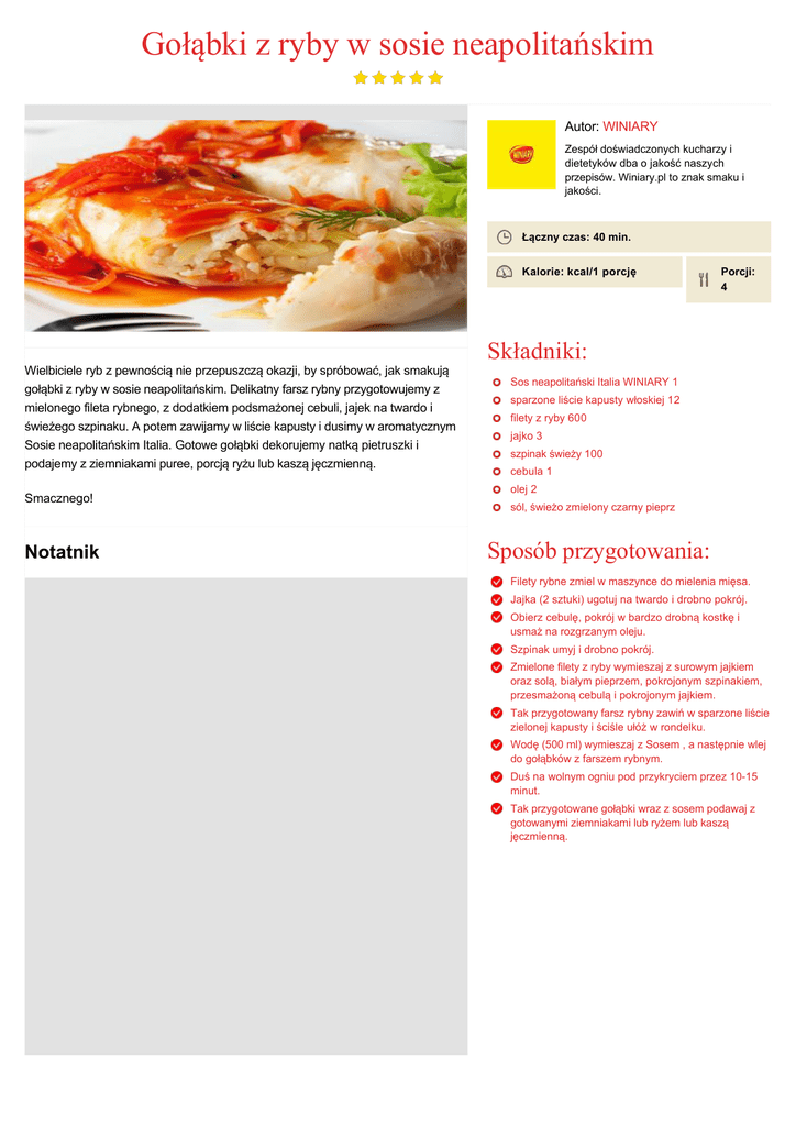 Gołąbki z ryby w sosie neapolitańskim Autor: WINIARY Zespół doświadczonych kucharzy i dietetyków dba o jakość naszych przepisów. Winiary.pl to znak smaku i jakości. Łączny czas: 40 min. Kalorie: kcal/1 porcję Porcji: 4 Składniki: Wielbiciele ryb z pewnością nie przepuszczą okazji, by spróbować, jak smakują gołąbki z ryby w sosie neapolitańskim. Delikatny farsz rybny przygotowujemy z mielonego fileta rybnego, z dodatkiem podsmażonej cebuli, jajek na twardo i świeżego szpinaku. A potem zawijamy w liście kapusty i dusimy w aromatycznym Sosie neapolitańskim Italia. Gotowe gołąbki dekorujemy natką pietruszki i podajemy z ziemniakami puree, porcją ryżu lub kaszą jęczmienną. Smacznego! Notatnik Sos neapolitański Italia WINIARY 1 sparzone liście kapusty włoskiej 12 filety z ryby 600 jajko 3 szpinak świeży 100 cebula 1 olej 2 sól, świeżo zmielony czarny pieprz Sposób przygotowania: Filety rybne zmiel w maszynce do mielenia mięsa. Jajka (2 sztuki) ugotuj na twardo i drobno pokrój. Obierz cebulę, pokrój w bardzo drobną kostkę i usmaż na rozgrzanym oleju. Szpinak umyj i drobno pokrój. Zmielone filety z ryby wymieszaj z surowym jajkiem oraz solą, białym pieprzem, pokrojonym szpinakiem, przesmażoną cebulą i pokrojonym jajkiem. Tak przygotowany farsz rybny zawiń w sparzone liście zielonej kapusty i ściśle ułóż w rondelku. Wodę (500 ml) wymieszaj z Sosem , a następnie wlej do gołąbków z farszem rybnym. Duś na wolnym ogniu pod przykryciem przez 1015 minut. Tak przygotowane gołąbki wraz z sosem podawaj z gotowanymi ziemniakami lub ryżem lub kaszą jęczmienną.