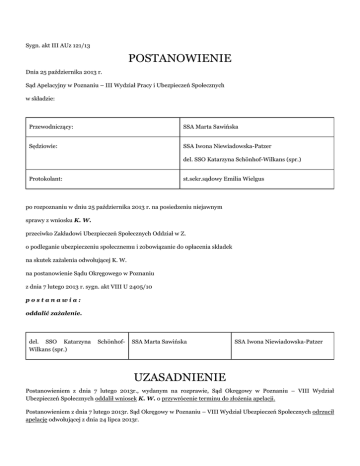 Sygn. akt III AUz 121/13 POSTANOWIENIE Dnia 25 października 2013 r. Sąd Apelacyjny w Poznaniu – III Wydział Pracy i Ubezpieczeń Społecznych w składzie: Przewodniczący: SSA Marta Sawińska Sędziowie: SSA Iwona Niewiadowska-Patzer del. SSO Katarzyna Schönhof-Wilkans (spr.) Protokolant: st.sekr.sądowy Emilia Wielgus po rozpoznaniu w dniu 25 października 2013 r. na posiedzeniu niejawnym sprawy z wniosku K. W. przeciwko Zakładowi Ubezpieczeń Społecznych Oddział w Z. o podleganie ubezpieczeniu społecznemu i zobowiązanie do opłacenia składek na skutek zażalenia odwołującej K. W. na postanowienie Sądu Okręgowego w Poznaniu z dnia 7 lutego 2013 r. sygn. akt VIII U 2405/10 postanawia: oddalić zażalenie. del. SSO Katarzyna Wilkans (spr.) Schönhof- SSA Marta Sawińska SSA Iwona Niewiadowska-Patzer UZASADNIENIE Postanowieniem z dnia 7 lutego 2013r., wydanym na rozprawie, Sąd Okręgowy w Poznaniu – VIII Wydział Ubezpieczeń Społecznych oddalił wniosek K. W. o przywrócenie terminu do złożenia apelacji. Postanowieniem z dnia 7 lutego 2013r. Sąd Okręgowy w Poznaniu – VIII Wydział Ubezpieczeń Społecznych odrzucił apelację odwołującej z dnia 24 lipca 2013r. W uzasadnieniu Sąd wskazał, że wyrokiem z dnia 23 maja 2012r. Sąd Okręgowy w Poznaniu zmienił zaskarżoną decyzję ZUS, Oddział w Z., z dnia 29 lipca 2010r. Nr (...) i stwierdził, że K. W. nie jest zobowiązana do opłacenia składek na Fundusz Pracy za okres od dnia 30 grudnia 1999r. do 30 czerwca 2000r. (pkt 1), w pozostałym zakresie oddalił odwołanie od tej decyzji oraz od decyzji z tej samej daty Nr (...) (pkt 1). Sąd orzekający ustalił, że strona, prawidłowo wezwana, nie stawiła się w dniu 23 maja 2012r. na rozprawę poprzedzającą wydanie wyroku, jak również na ogłoszenie wyroku (w tym dniu). Odwołująca w dniu 24 maja 2012r. nadesłała do sekretariatu Wydziału VIII Ubezpieczeń Społecznych Sądu Okręgowego w Poznaniu e-mail z informacją, że z uwagi na pogorszenie stanu zdrowia nie mogła stawić się na rozprawę w dniu 23 maja 2013 r. Tego samego dnia odwołująca przesłała do Sądu listownie pismo z powyższą informacją; do pisma dołączyła zaświadczenie lekarza sądowego nr (...)r., stwierdzające, że K. W. nie mogła stawić się w Sądzie w dniu 23 maja 2013 r., a przewidywany termin zdolności do stawienia się na wezwanie lub zawiadomienie to 31 maja 2013 r. Pismem z dnia 28 maja 2012r. Przewodnicząca Wydziału VIII Ubezpieczeń Społecznych poinformowała odwołującą o wydaniu wyroku w dniu 23 maja 2012r. i o nieuwzględnieniu wniosku odwołującej z dnia 24 maja 2012r. o odroczenie rozprawy. Pismo wysłano na adres korespondencyjny wskazany w odwołaniu od spornej decyzji. Pismo to dwukrotnie awizowano i w dniu 19 czerwca 2012r. zwrócono do Sądu. Ponownie – zarządzeniem z dnia 9 lipca 2012r. – pismo to przesłano odwołującej ponownie na adres korespondencyjny w P. oraz na adres zamieszkania w miejscowości P.. Pismo przesłane na adres korespondencyjny zostało dwukrotnie awizowane, a doręczone na adres zamieszkania odebrano w dniu 20 lipca 2012r. W dniu 24 lipca 2012r. odwołująca wniosła o przywrócenie terminu do wniesienia apelacji od wyroku z dnia 23 maja 2012r. Sąd Okręgowy, analizując przepisy art. 369 § 1 k.p.c., art. 370 k.p.c. i art. 168 § 1 k.p.c. oraz okoliczności sprawy, nie dopatrzył się braku winy strony w niezachowaniu terminu do złożenia apelacji od wyroku z dnia 23 maja 2012r. W szczególności Sąd Okręgowy stwierdził, że odwołująca w okresie od dnia 23 maja 2012r., tj. od dnia wydania wyroku w sprawie, do dnia 13 czerwca 2012r., tj. do dnia kiedy minął termin do złożenia apelacji, miała możliwość powzięcia informacji o stanie sprawy, chociażby telefonicznie, lecz z powodu własnego zaniedbania tego nie uczyniła. Ponadto, jak wynika z zaświadczenia lekarza sądowego z dnia 24 maja 2013 r. oraz z kserokopii druku (...) seria (...) z dnia 22 maja 2013 r., odwołująca po dniu 30 maja 2013 r. była zdolna do pracy i do uczestnictwa w rozprawie, a zatem również do osobistego stawiennictwa w Sądzie w celu uzyskania informacji o stanie sprawy. Z ustalonego stanu faktycznego wynika jednoznacznie, że wyłączną przyczyną niezłożenia apelacji w terminie była niewiedza odwołującej co do faktu, że w sprawie zapadł już wyrok. Zażalenie na postanowienie o odrzuceniu apelacji wniosła K. W.. Skarżąca kwestionowała ustalenia Sądu I instancji opierające się na uznaniu, że była prawidłowo powiadomiona o wyroku i że z uwagi na jej stan zdrowia mogła dochować terminu do złożenia apelacji. W ocenie skarżącej – w sytuacji zawiadomienia o chorobie – Sąd winien przesłać odpis wyroku na adres domowy odwołującej. Sąd Apelacyjny zważył, co następuje: Zażalenie okazało się bezzasadne. W myśl art. 369 § 1 i 2 k.p.c. apelację wnosi się do sądu, który wydał zaskarżony wyrok, w terminie dwutygodniowym od doręczenia stronie skarżącej wyroku z uzasadnieniem. Jeżeli strona nie zażądała uzasadnienia wyroku w terminie tygodniowym od ogłoszenia sentencji, termin do wniesienia apelacji biegnie od dnia, w którym upłynął termin do żądania uzasadnienia. Zgodnie z treścią art. 370 k.p.c. Sąd pierwszej instancji odrzuci na posiedzeniu niejawnym apelację wniesioną po upływie przepisanego terminu, nieopłaconą lub z innych przyczyn niedopuszczalną, jak również apelację, której braków strona nie uzupełniła w wyznaczonym terminie. Stosownie do treści art. 168 § 1 k.p.c., sąd postanowi o przywróceniu terminu na wniosek strony jedynie w wypadku, gdy strona nie dokonała w terminie czynności procesowej bez swej winy. Brak winy w uchybieniu terminu powinien być oceniany z uwzględnieniem wszystkich okoliczności konkretnej sprawy, w sposób uwzględniający obiektywny miernik staranności, jakiej można wymagać od strony dbającej należycie o swoje in