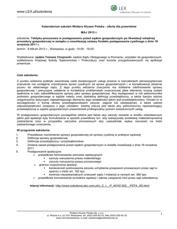 www.LEX.pl/szkolenia ___________________________________________________________________ Kalendarium szkoleń Wolters Kluwer Polska - oferta dla prawników MAJ 2012 r. szkolenie: Taktyka procesowa w postępowaniu przed sądem gospodarczym po likwidacji odrębnej procedury gospodarczej w związku z nowelizacją ustawy Kodeks postępowania cywilnego z dnia 16 września 2011 r. termin: 8 MAJA 2012 r., Warszawa, w godz. 10:00 - 16:00 Wykładowca: sędzia Tomasz Chojnacki- sędzia Sądu Okręgowego w Poznaniu, wizytator ds gospodarczych, wykładowca Krajowej Szkoły Sądownictwa i Prokuratury oraz kursów przygotowawczych na aplikacje prawnicze. Cele szkolenia: Z punktu widzenia praktyki zawodowej osób świadczących usługi prawne w kancelariach pierwszoplanowe znaczenie ma umiejętne rozróżnianie spraw cywilnych od spraw gospodarczych i w konsekwencji złożenie pozwu do właściwego sądu. Z tego punktu widzenia znaczenie ma dokładne zdefiniowanie sprawy gospodarczej i precyzyjne ustalenie w kontekście problematyki orzeczniczej jakie elementy muszą zostać spełnione w celu zakwalifikowania sprawy jako sprawy gospodarczej. Aby występować w roli pełnomocnika podmiotu gospodarczego w sądzie należy znać dokładną definicję przedsiębiorcy, a także bardzo istotne uregulowania dotyczące najważniejszego elementu jego działalności jakim jest przedsiębiorstwo. Chodzi tu w szczególności o formę obrotu przedsiębiorstwami (zbycie, zajęcie lub zastawienie), a także zakres odpowiedzialności związany z jego udziałem. Istotną rzeczą jest także aby pełnomocnicy reprezentujący przedsiębiorcę w sądzie gospodarczym prezentowali profesjonalny poziom świadczonych usług. W postępowaniu gospodarczym szczególnie istotne jest także aby zarzuty zawarte w środku odwoławczym jakim jest apelacja były formułowane w sposób prawidłowy tzn. aby wskazywały podstawę materialnoprawną zaskarżenia oraz w przypadku zarzutów procesowych aby uzasadniały wpływ naruszeń na treść zaskarżonego orzeczenia. W programie szkolenia: 1. 2. 3. 4. 5. Prawidłowe rozróżnienie sprawy gospodarczej od sprawy cywilnej w praktyce sądowej Definicja sprawy gospodarczej Definicja przedsiębiorcy i przedsiębiorstwa Zmiana zasad postępowania przed sądem gospodarczym w świetle nowelizacji z dnia 16 września 2011 Postępowanie apelacyjne • prawidłowe formułowanie zarzutów apelacyjnych zarzuty naruszenia prawa materialnego zarzuty naruszenia prawa procesowego • granice rozpoznania apelacji konieczność podnoszenia zarzutu uchybienia przepisom procesowym przez sąd w oparciu o treść art. 162 kpc kontrola niezaskarżalnych orzeczeń sądu I instancji w ramach art. 380 kpc • prawidłowe formułowanie wniosków apelacji i zakres związania nimi przez sąd odwoławczy więcej informacji: http://www.szkolenia.abc.com.pl/x_C_I__P_40161302__PZTA_0D.html _______________________________________________________________________________________ Wolters Kluwer Polska Sp. z o.o. ul. Płocka 5 a, 01-231 Warszawa, tel. (022) 535 83 23, faks (022) 535 83 22 www.LEX.pl/szkolenia, e-mail: [email protected] 1 www.LEX.pl/szkolenia ___________________________________________________________________ szkolenie: Prawo w projektach IT termin: 9 maja 2012 r., Warszawa, w godz. 10:00 - 16:00 Wykładowca: Xawery Konarski - adwokat, wspólnik w Kancelarii Prawnej Traple Konarski Podrecki i Wspólnicy. Ekspert prawny Polskiej Izby Informatyki i Telekomunikacji (PIIT) oraz Związku Pracodawców Branży Internetowej IAB Polska. Jako ekspert brał udział w pracach legislacyjnych nad szeregiem ustaw z zakresu prawa nowych technologii, jest arbitrem Sądu Polubownego ds. domen internetowych przy PIIT. Nominowany w polskich i zagranicznych rankingach prawników specjalizujących się w IT/TMT, m.in. w latach 2008-2011 r. wyróżniony w Legal Media Group Guide to the World's Leading Technology, Media&Telecommunications Lawyers oraz rekomendowany prawnik w rankingach "Rzeczpospolitej" i "Forbes". Nadzoruje prace prawne dla kilkudziesięciu polskich i zagranicznych podmiotów z branży IT. W programie szkolenia: Wprowadzenie do problematyki prawnej projektów IT • rodzaje projektów IT - znaczenie prawne rozróżnienia • umowy dotyczące projektów IT - przepisy prawa • założenia biznesowe umowy o wdrożenie IT i instrumenty prawne ich realizacji • założenia biznesowe umowy serwisu IT i instrumenty prawne ich realizacji • projekty IT i ryzyko prawne "wielości" umów Prawo autorskie w umowach IT • prawa autorskie do dokumentacji i programów komputerowych • eksploatacja "własnego" i "obcego" oprogramowania Wykonawcy • modele licencjonowania standardowego i dedykowanego oprogramowania Wykonawcy • szczególne sposoby eksploatacji programów komputerowych (Saas, cloud computing etc.) • prawa do modyfikacji i prawa zależne - jak zabezpieczyć interesy Zamawiającego • prawa autorskie a depozyt kodu źródłowego Analiza poszczególnych klauzul umowy wdrożenia IT • ogólne zasady wykonywania zobowiązań przez Wykonawcę i Zamawiającego • organizacja i struktura podmiotowa projektu IT • personel kluczowy i podwykonawcy • ewidencjonowanie i dokumentowanie prac • kontrola jakości • odbiory i procedura testowa • zarządzanie zmianą • gwarancja należytego wykonania umowy • gwarancja jakości Analiza poszczególnych klauzul umowy serwisu IT • rodzaje umów serwisu IT - znaczenie prawne rozróżnienia • gwarancja a "płatny" serwis • usuwanie wad systemu w trybie wdrożeniowym i serwisowym • okres trwania i zakres usług objętych serwisem IT • procedura zgłoszeń i usuwania wad systemu IT - przykłady postanowień umownych • kategorie błędów i znaczenie prawne ich rozróżnienia • rodzaje i najważniejsze postanowienia umów SLA • odbiory prac serwisowych • bonifikaty i kary umowne - znaczenie prawne rozróżnienia Niewykonanie lub nienależyte wykonanie 