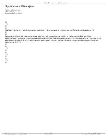 Dom Pomocy Społecznej w Bełchatowie Spotkanie z Mikołajem Autor: Administrator 24.01.2012. Zmieniony 24.01.2012. Mikołajki – dzień 6 grudnia każdemu z nas zapewne kojarzy się ze Świętym Mikołajem. Tego dnia odwiedził nas prawdziwy Mikołaj. Jak przystało na tradycję były upominki i wspólne kolędowanie, któremu towarzyszył występ dzieci ze Szkoły Podstawowej nr 3 i młodzieży z Zespołu Szkół Ponadgimnazjalnych nr 3. Spotkanie z Mikołajem zostało zorganizowane przez Stowarzyszenie Ziemia Bełchatowska. http://www.dps.powiat-belchatowski.pl Kreator PDF Utworzono 8 March, 2017, 10:17