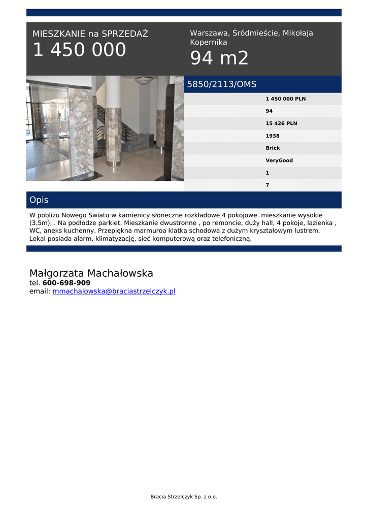 MIESZKANIE na SPRZEDAŻ 1 450 000 Warszawa, Śródmieście, Mikołaja Kopernika 94 m2 5850/2113/OMS 1 450 000 PLN 94 15 426 PLN 1938 Brick VeryGood 1 7 Opis W pobliżu Nowego Swiatu w kamienicy słoneczne rozkładowe 4 pokojowe. mieszkanie wysokie (3.5m), . Na podłodze parkiet. Mieszkanie dwustronne , po remoncie, duży hall, 4 pokoje, lazienka , WC, aneks kuchenny. Przepiękna marmuroa klatka schodowa z dużym kryształowym lustrem. Lokal posiada alarm, klimatyzację, sieć komputerową oraz telefoniczną. Małgorzata Machałowska tel. 600-698-909 email: [email protected] Bracia Strzelczyk Sp. z o.o. Powered by TCPDF (www.tcpdf.org)