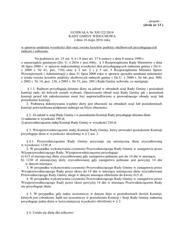 - projekt – (druk nr 13 ) UCHWAŁA Nr XII/122/2016 RADY GMINY WIDUCHOWA z dnia 16 maja 2016 roku w sprawie ustalenia wysokości diet oraz zwrotu kosztów podróży służbowych przysługujących radnym i sołtysom. Na podstawie art. 25 ust. 4, 6 i 8 oraz art. 37 b ustawy z dnia 8 marca 1990 r. o samorządzie gminnym (Dz. U. z 2016 r. poz.446), § 3 Rozporządzenia Rady Ministrów z dnia 26 lipca 2000 r. w sprawie maksymalnej wysokości diet przysługujących radnemu gminy ( Dz.U. z 2000 r. Nr 61, poz. 710) oraz § 2 ust. 2 i § 5 ust. 3 Rozporządzenia Ministra Spraw Wewnętrznych i Administracji z dnia 31 lipca 2000 roku w sprawie sposobu ustalania należności z tytułu zwrotu kosztów podróży służbowych radnych gminy ( Dz.U. z 2000 r. Nr 66, poz. 800, z 2002 r. Nr 14, poz. 138, z 2003 r. Nr 33, poz. 280 ) Rada Gminy uchwala, co następuje: § 1.1. Radnym przysługują dzienne diety za udział w obradach sesji Rady Gminy i posiedzeń komisji rady, do których zostali wybrani. Opuszczenie obrad sesji Rady Gminy jak i posiedzeń komisji przed ich zakończeniem musi być usprawiedliwione u prowadzącego obrady sesji lub posiedzenie komisji. 2. Podstawą dokonywania wypłaty diety jest obecność na obradach sesji lub posiedzeniach komisji potwierdzona podpisem radnego na liście obecności. § 2. Za udział w sesji Rady Gminy i w posiedzeniu Komisji Rady przysługuje dzienna dieta: 1) radnemu w wysokości 190 zł; 2) przewodniczącemu stałej Komisji Rady Gminy w wysokości 210 zł. § 3. Wiceprzewodniczącemu stałej Komisji Rady Gminy, który prowadzi posiedzenie Komisji przysługuje dieta w wysokości określonej w § 2 ust. 2. § 4.1. Przewodniczącemu Rady Gminy przyznaje się miesięczną dietę zryczałtowaną w wysokości 1230 zł. 2. W przypadku wykonywania czynności Przewodniczącego Rady Gminy w zastępstwie przez Wiceprzewodniczącego Rady, Wiceprzewodniczącemu przysługuje: a) 615 zł miesięcznej diety zryczałtowanej gdy zastępstwo pełnione jest do 14 dni w miesiącu, b) 1230 zł miesięcznej diety zryczałtowanej gdy zastępstwo pełnione jest powyżej 14 dni w danym miesiącu. 3. W przypadku wykonywania czynności Przewodniczącego Rady Gminy w zastępstwie przez Wiceprzewodniczącego Rady przez okres do 14 dni w miesiącu miesięczna dieta zryczałtowana Przewodniczącego Rady Gminy ulega w danym miesiącu obniżeniu do kwoty 615 zł. 4. W przypadku wykonywania czynności Przewodniczącego Rady Gminy w zastępstwie przez Wiceprzewodniczącego Rady przez okres powyżej 14 dni w miesiącu Przewodniczącemu Rady nie przysługuje dieta. § 5. W przypadku, gdy radny uczestniczy w danym dniu w posiedzeniach dwóch Komisji, których jest członkiem, bądź też uczestniczy w posiedzeniu Komisji i Sesji Rady Gminy radnemu przysługuje jedna dieta w korzystniejszej wysokości określonej w § 2. § 6. Ustala się dietę dla sołtysów: 1) za uczestnictwo w posiedzeniu Rady Gminy dietę dzienną w wysokości 100 zł. Podstawą wypłaty diety jest obecność na posiedzeniu Rady potwierdzona podpisem sołtysa na liście obecności; 2) za pełnienie funkcji sołtysa (poza reprezentowaniem sołectwa na posiedzeniach Rady) miesięczną dietę zryczałtowaną w wysokości 50 zł. § 7. Radnemu pełniącemu jednocześnie funkcję sołtysa przysługuje wyłącznie dieta należna z tytułu pełnienia mandatu radnego. § 8. Radnemu przysługuje zwrot kosztów podróży na zasadach określonych w Rozporządzeniu Ministra Spraw Wewnętrznych i Administracji z dnia 31 lipca 2000 roku w sprawie sposobu ustalania należności z tytułu podróży służbowych radnych gminy ( Dz.U. z 2000 r. Nr 66, poz. 800 z późn. zm.). § 9. W przypadku przejazdów w podróży służbowej pojazdem samochodowym nie będącym własnością Gminy radnemu przysługuje zwrot kosztów przejazdów wg maksymalnych stawek określonych w przepisach dotyczących warunków ustalania oraz sposobu dokonywania zwrotu kosztów używania do celów służbowych samochodów osobowych, motocykli i motorowerów niebędących własnością pracodawcy. § 10. Czynności związane z wystawieniem polecenia wyjazdu służbowego dla przewodniczącego Rady wykonuje wiceprzewodniczący Rady starszy wiekiem. § 11. Ustala się następujące zasady zwrotu kosztów podróży dla sołtysów : 1) podróżą służbową jest podróż podjęta przez sołtysa w celu wykonywania zadania mającego bezpośredni związek z pełnioną przez niego funkcją, poza miejscowością, w której znajduje się siedziba sołectwa; 2) termin i miejsce wykonywania zadania oraz miejscowość rozpoczęcia i zakończenia podróży służbowej określa Wójt Gminy w poleceniu wyjazdu służbowego; 3) z tytułu podróży służbowej przysługuje zwrot kosztów : a) przejazdów z miejscowości określonej przez Wójta Gminy w poleceniu wyjazdu służbowego do miejsca stanowiącego cel podróży i z powrotem, z uwzględnieniem § 11 pkt 4 i 5, b) noclegów, w wysokości stwierdzonej rachunkiem, c) dojazdów środkami komunikacji miejscowej, d) innych udokumentowanych i zaakceptowanych przez Wójta Gminy wydatków, 4) środek transportu właściwy do odbycia podróży służbowej określa Wójt Gminy w poleceniu wyjazdu służbowego; 5) na wniosek sołtysa Wójt może wyrazić zgodę na przejazd w podróży służbowej pojazdem samochodowym niebędącym własnością Gminy. W takim przypadku sołtysowi przysługuje zwrot kosztów przejazdu według stawek, o których mowa w § 9 niniejszej uchwały. § 12. Traci moc Uchwała Nr IV/22/2015 Rady Gminy Widuchowa z dnia 19 lutego 2015 r. w sprawie ustalenia wysokości diet oraz zwrotu kosztów podróży służbowych przysługujących radnym i sołtysom. § 13. Uchwała wchodzi w życie z dniem podjęcia. Uzasadnienie do Uchwały Nr XII/122/2016 Rady Gminy Widuchowa z dnia 16 maja 2016 r. Stosownie do przepisów ustawy o samorządzie gminnym radnemu przysługuje dieta oraz zwrot kosztów podróży służbowych na zas