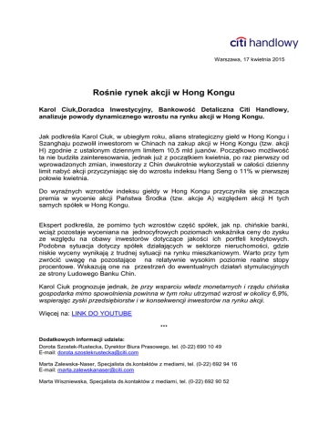 Warszawa, 17 kwietnia 2015 Rośnie rynek akcji w Hong Kongu Karol Ciuk,Doradca Inwestycyjny, Bankowość Detaliczna Citi Handlowy, analizuje powody dynamicznego wzrostu na rynku akcji w Hong Kongu. Jak podkreśla Karol Ciuk, w ubiegłym roku, alians strategiczny giełd w Hong Kongu i Szanghaju pozwolił inwestorom w Chinach na zakup akcji w Hong Kongu (tzw. akcji H) zgodnie z ustalonym dziennym limitem 10,5 mld juanów. Początkowo możliwość ta nie budziła zainteresowania, jednak już z początkiem kwietnia, po raz pierwszy od wprowadzonych zmian, inwestorzy z Chin dwukrotnie wykorzystali w całości dzienny limit nabyć akcji przyczyniając się do wzrostu indeksu Hang Seng o 11% w pierwszej połowie kwietnia. Do wyraźnych wzrostów indeksu giełdy w Hong Kongu przyczyniła się znacząca premia w wycenie akcji Państwa Środka (tzw. akcje A) względem akcji H tych samych spółek w Hong Kongu. Ekspert podkreśla, że pomimo tych wzrostów część spółek, jak np. chińskie banki, wciąż pozostaje wyceniana na jednocyfrowych poziomach wskaźnika ceny do zysku ze względu na obawy inwestorów dotyczące jakości ich portfeli kredytowych. Podobna sytuacja dotyczy spółek działających w sektorze nieruchomości, gdzie niskie wyceny wynikają z trudnej sytuacji na rynku mieszkaniowym. Warto przy tym zwrócić uwagę na pozostające na relatywnie wysokim poziomie realne stopy procentowe. Wskazują one na przestrzeń do ewentualnych działań stymulacyjnych ze strony Ludowego Banku Chin. Karol Ciuk prognozuje jednak, że przy wsparciu władz monetarnych i rządu chińska gospodarka mimo spowolnienia powinna w tym roku utrzymać wzrost w okolicy 6,9%, wspierając zyski przedsiębiorstw i w konsekwencji inwestorów na rynku akcji. Więcej na: LINK DO YOUTUBE *** Dodatkowych informacji udziela: Dorota Szostek-Rustecka, Dyrektor Biura Prasowego, tel. (0-22) 690 10 49 E-mail: [email protected] Marta Zalewska-Naser, Specjalista ds.kontaktów z mediami, tel. (0-22) 692 94 16 E-mail: [email protected] Marta Wiszniewska, Specjalista ds.kontaktów z mediami, tel. (0-22) 692 90 52 E-mail: [email protected] Bank Handlowy w Warszawie SA to jedna z największych instytucji finansowych w Polsce, oferująca pod marką Citi Handlowy bogaty i nowoczesny asortyment produktów i usług bankowości korporacyjnej, inwestycyjnej i detalicznej. Bank Handlowy obsługuje 7,4 tys. klientów korporacyjnych i ok. 760 tys. klientów indywidualnych poprzez nowoczesne kanały dystrybucji oraz sieć 60 oddziałów. W skład grupy kapitałowej Banku wchodzą takie podmioty jak: Dom Maklerski Banku Handlowego i Handlowy Leasing. Przynależność do Citigroup, największej na świecie instytucji finansowej, zapewnia klientom Banku Handlowego dostęp do usług finansowych w ponad 100 krajach. Citi (NYSE:C) to wiodąca globalna instytucja finansowa, mająca około 200 milionów klientów w ponad 140 krajach. Poprzez swoje dwie odrębne jednostki operacyjne: Citicorp i Citi Holdings, Citi obsługuje klientów indywidualnych, korporacyjnych, rządowych i instytucjonalnych zapewniając im bogaty wachlarz produktów i usług finansowych w zakresie bankowości detalicznej, bankowości korporacyjnej i inwestycyjnej, usług maklerskich i zarządzania aktywami. Dodatkowe informacje można uzyskać na stronie internetowej www.citigroup.com lub www.citi.com.