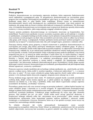 Rozdział 79 Praca grupowa Podejście skoncentrowane na rozwiązaniu zapewnia strukturę, która usprawnia funkcjonowanie nawet najbardziej wymagających grup. W perspektywie skoncentrowanej na rozwiązaniu praca grupowa jest szczególnie interesującym przypadkiem, gdyż łączy ze sobą osoby, które z wyjątkiem problemu mogą mieć ze sobą bardzo mało wspólnego. Klienci często są zainteresowani doświadczeniami innych osób borykających się z podobnymi kwestiami, więc może pojawić się tendencja, aby grupa stała się forum wymiany doświadczeń związanych z problemem. Nic dziwnego więc, że terapeuta skoncentrowany na rozwiązaniu musi wypracować skuteczne sposoby skierowania rozmowy w stronę rezultatów, jakie mają nadzieję osiągnąć członkowie grupy. Typowe pytania podejścia skoncentrowanego na rozwiązaniu stosowane są bezpośrednio, bez modyfikacji. Na pierwszym spotkaniu wszyscy uczestnicy są pytani, jakie są ich nadzieje w związku ze spotkaniami, a następnie każdego po kolei zachęca się do opisania swojej preferowanej przyszłości oraz ocenienia swoich postępów na skali. Gdy uczestników jest niewielu, może to odbyć się na forum całej grupy, jeśli więcej, w podgrupach. Kolejne spotkania można poświęcić analizie postępów („co zmieniło się na lepsze?”), konstruowaniu skal, lub, jeśli nastąpił regres, pytaniom o radzenie sobie. Znaczącą różnicą między pracą grupową a innymi rozmowami w podejściu skoncentrowanym na rozwiązaniu jest uwaga, jaką należy poświęcić interakcjom między członkami grupy. W pracy z jednostkami i rodzinami, każda osoba odpowiada na pytania terapeuty: to odpowiedzi zawierają treść terapeutyczną i zakłada się, że po zakończeniu spotkania członkowie rodziny będą przepracowywać, na swój sposób, co każdy z nich powiedział. Grupy wykonują tę pracę podczas spotkania, więc treścią terapeutyczną jest to, co mówią do siebie nawzajem. Często mówi się, że ciężar dzielony z innymi jest o połowę lżejszy. W podejściu skoncentrowanym na rozwiązaniu można powiedzieć, że sukces dzielony z innymi ulega potrojeniu i to zadaniem prowadzącego grupę skoncentrowaną na rozwiązaniu jest skierować rozmowę w stronę nadziei i osiągnięć, nie umniejszając swobody wypowiedzi i nie lekceważąc trudności [doświadczanych przez uczestników]. Kiedy grupa zacznie dostrzegać wartość rozmowy skoncentrowanej na rezultatach, prawdopodobnie tak jak terapeuta będą skłonni ograniczać „rozmowę o problemie”. Pomocne są pewne rytuały (podobnie jak na każdego rodzaju spotkaniu), np. „niech każdy, po kolei, opowie o jednej rzeczy, którą zrobił w zeszłym tygodniu, z której jest zadowolony” (…) „i jeszcze dwa razy, to samo”. Po tym czasie członkowie grupy będą zapewne chcieli zadać sobie nawzajem pytania i o ile dyskusja będzie dotyczyła osiągnięć, terapeuta może odsunąć się w cień. Pewną strukturę mogą zapewnić także skale. W niektórych grupach każdy uczestnik przedstawia osobistą skalę, dzięki czemu można zapytać go, w jakim punkcie się znajduje i co pozwala mu umieścić się właśnie tu, a nie niżej. I podobnie, kilka rund takich wypowiedzi zachęci zapewne uczestników do bardziej „swobodnej” rozmowy. Prowadzący grupę musi cały czas zwracać uwagę na poważne trudności, z jakimi będzie borykać się wielu członków grupy i zauważać to w swoich uwagach. W zapoczątkowaniu konstruktywnego dialogu wydatnie może pomóc ustrukturalizowana runda wypowiedzi „o niepowodzeniach”, tworząc możliwość wyrażenia problemu. Członkowie grupy spodziewają się wręcz tego jako elementu procesu. Gdy problem jest już „na stole”, każda osoba może zacząć opisywać skuteczne (i bezpieczne) strategie radzenia sobie lub „utrzymania się na powierzchni”, jakie stosuje; różne konstruktywne zachowania, które kontynuuje pomimo wpływu problemu i pierwsze oznaki świadczące o wychodzeniu z kryzysu. Rozmowa, która się w ten sposób wywiąże, może toczyć się czasami bez zauważalnego udziału terapeuty. To właśnie obecność tak wielu potencjalnych koterapeutów może uczynić pracę grupową szczególnie efektywną. Kiedy klienci są nadmiernie samokrytyczni lub nie potrafią znaleźć odpowiedzi, zazwyczaj inni uczestnicy są gotowi udzielić im zachęty i rady. Nie wszyscy chętnie to przyjmują i czasami konieczne jest nauczenie członków grupy, aby zadawali pytania zamiast formułować stwierdzenia. Warto także zachęcać uczestników spotkań, aby udzielali sobie nawzajem pochwał.