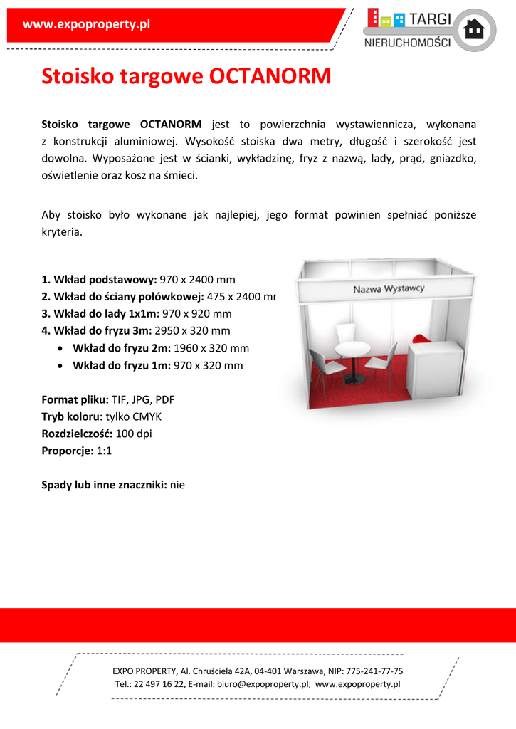 www.expoproperty.pl Stoisko targowe OCTANORM Stoisko targowe OCTANORM jest to powierzchnia wystawiennicza, wykonana z konstrukcji aluminiowej. Wysokość stoiska dwa metry, długość i szerokość jest dowolna. Wyposażone jest w ścianki, wykładzinę, fryz z nazwą, lady, prąd, gniazdko, oświetlenie oraz kosz na śmieci. Aby stoisko było wykonane jak najlepiej, jego format powinien spełniać poniższe kryteria. 1. Wkład podstawowy: 970 x 2400 mm 2. Wkład do ściany połówkowej: 475 x 2400 mm 3. Wkład do lady 1x1m: 970 x 920 mm 4. Wkład do fryzu 3m: 2950 x 320 mm Wkład do fryzu 2m: 1960 x 320 mm Wkład do fryzu 1m: 970 x 320 mm Format pliku: TIF, JPG, PDF Tryb koloru: tylko CMYK Rozdzielczość: 100 dpi Proporcje: 1:1 Spady lub inne znaczniki: nie EXPO PROPERTY, Al. Chruściela 42A, 04-401 Warszawa, NIP: 775-241-77-75 Tel.: 22 497 16 22, E-mail: [email protected], www.expoproperty.pl