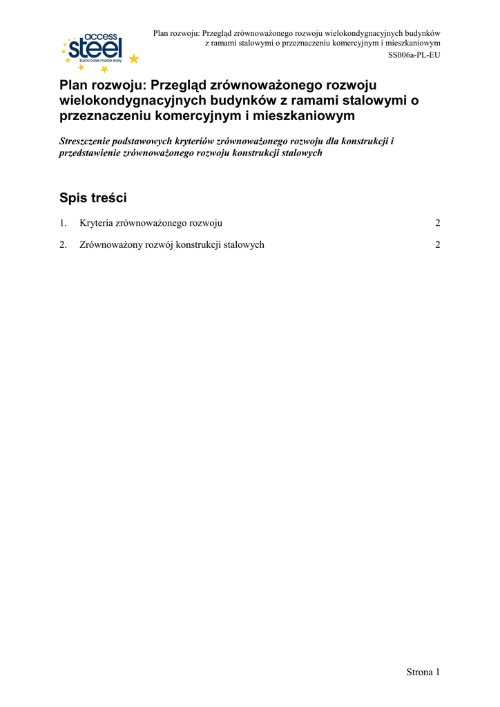Plan rozwoju: Przegląd zrównowaŜonego rozwoju wielokondygnacyjnych budynków z ramami stalowymi o przeznaczeniu komercyjnym i mieszkaniowym SS006a-PL-EU Plan rozwoju: Przegląd zrównowaŜonego rozwoju wielokondygnacyjnych budynków z ramami stalowymi o przeznaczeniu komercyjnym i mieszkaniowym Streszczenie podstawowych kryteriów zrównowaŜonego rozwoju dla konstrukcji i przedstawienie zrównowaŜonego rozwoju konstrukcji stalowych Spis treści 1. Kryteria zrównowaŜonego rozwoju 2 2. ZrównowaŜony rozwój konstrukcji stalowych 2 Strona 1 Plan rozwoju: Przegląd zrównowaŜonego rozwoju wielokondygnacyjnych budynków z ramami stalowymi o przeznaczeniu komercyjnym i mieszkaniowym SS006a-PL-EU 1. Kryteria zrównowaŜonego rozwoju Budynki wszystkich typów są odpowiedzialne za ponad 40% całkowitej emisji CO2 i dalsze 10% w produkcji i transporcie materiałów budowlanych. Europejskie rządy wyraziły zamiar zmniejszenia emisji CO2 średnio o 5% w ciągu najbliŜszych 5 lat i jednym z instrumentów są krajowe przepisy budowlane obejmujące warunki, właściwości termiczne, itd. Zwykle wykonywane są oszacowania środowiskowe i następujące kryteria są szeroko stosowane do ustalenia oceny środowiskowej: ZuŜycie energii. Transport. Zanieczyszczenie. Materiały (i odpady). Gospodarka zasobami wodnymi. Ekologia i uŜytkowanie gruntów. Zdrowie i dobrobyt. Transport ludzi (np. z domu do pracy i z pracy do domu) odpowiada za 22% całkowitej emisji CO2. Przemysł budowlany jest jednym z największych uŜytkowników zasobów i twórców odpadów i w przybliŜeniu 10% materiałów budowlanych jest odpadem i są wyrzucane na wysypiska. Dlatego waŜne jest skuteczne stosowanie materiałów budowlanych by zmniejszyć odpady, zarówno na etapie produkcji materiałów jak i przy ich stosowaniu na budowie. WaŜna jest równieŜ zachęta do recyklingu i ponownego uŜycia komponentów. 2. ZrównowaŜony rozwój konstrukcji stalowych Stal jest materiałem, który słuŜy zrównowaŜonemu rozwojowi. Stal moŜna efektywnie wyprodukować, oraz świetnie nadaje się do recyklingu i do ponownego uŜycia po zakończeniu okresu eksploatacji. ToteŜ zachowuje cechy podane w poniŜszej tabeli: Table 2.1 Cechy konstrukcji stalowych w zrównowaŜonym rozwoju Cecha Komentarz dotyczący konstrukcji stalowych Efektywność Konstrukcje stalowe są prefabrykowane w efektywnych fabrycznych procesach z minimalnym uŜyciem zasobów Szybkość Konstrukcje stalowe są montowane błyskawicznie na miejscu budowy co zmniejsza zakłócenia lokalne Minimum odpadów Stal na konstrukcje nie jest marnotrawiona, a całość odpadów podlega recyklingowi Jakość Stal posiada wysoką jakość, co umoŜliwia uzyskanie wysokiej dokładności wymiarowej Transport Stal moŜe być dostarczana na plac budowy na określony czas montaŜu Okres uŜytkowania Stal ma długi okres Ŝycia konstrukcji bez pogarszania się bezpieczeństwa Zdrowie i dobrobyt Konstrukcje stalowe to bezpieczny proces i prowadzi do wysokiej jakości architektury Recykling Stal w całości podlega recyklingowi, obecnie 45% stali jest uzyskiwane do recyklingu Ponowne uŜycie Stalowe elementy mogą być rozebrane i uŜyte ponownie. Strona 2 Plan rozwoju: Przegląd zrównowaŜonego rozwoju wielokondygnacyjnych budynków z ramami stalowymi o przeznaczeniu komercyjnym i mieszkaniowym SS006a-PL-EU Protokół jakości TYTUŁ ZASOBU Plan rozwoju: Przegląd zrównowaŜonego rozwoju wielokondygnacyjnych budynków z ramami stalowymi o przeznaczeniu komercyjnym i mieszkaniowym Odniesienie DOKUMENT ORYGINALNY Imię i nazwisko Instytucja Data Stworzony przez R.M. Lawson SCI Jan 05 Zawartość techniczna sprawdzona przez G.W. Owens SCI May 05 Zawartość redakcyjna sprawdzona przez D.C. Iles SCI May 05 1. WIELKA BRYTANIA G.W. Owens SCI 26/5/05 2. Francja A. Bureau CTICM 26/5/05 3. Szwecja A. Olsson SBI 26/5/05 4. Niemcy C. Mueller RWTH 11/5/05 5. Hiszpania J. Chica Labein 20/5/05 6. Luksemburg M. Haller PARE 26/5/05 G.W. Owens SCI 26/4/06 Zawartość techniczna zaaprobowana przez: Zasób zatwierdzony przez Koordynatora Technicznego TŁUMACZENIE DOKUMENTU Tłumaczenie wykonał i sprawdził: Z. Kiełbasa, PRz Tłumaczenie zatwierdzone przez: Strona 3 Plan rozwoju: Przegląd zrównowaŜonego rozwoju wielokondygnacyjnych budynków z ramami stalowymi o przeznaczeniu komercyjnym i mieszkaniowym SS006a-PL-EU Informacje ramowe Tytuł* Plan rozwoju: Przegląd zrównowaŜonego rozwoju wielokondygnacyjnych budynków z ramami stalowymi o przeznaczeniu komercyjnym i mieszkaniowym Seria Opis* Streszczenie podstawowych kryteriów zrównowaŜonego rozwoju dla konstrukcji i przedstawienie zrównowaŜonego rozwoju konstrukcji stalowych Poziom dostępu* Umiejętności specjalistyczne Practitioner Identyfikator* Nazwa pliku D:\ ZBIGNIEW KIEŁBASA\TŁUMACZENIE ACCES STEEL\CZĘŚĆ 2\006\SS006a-EN-PL.doc Format Kategoria* Microsoft Office Word; 4 Pages; 125kb; Typ zasobu Plan rozwoju Punkt widzenia InŜynier Temat* Obszar stosowania Budynki wielokondygnacyjne; Daty Data utworzenia 27/05/2005 Data ostatniej modyfikacji Data sprawdzenia WaŜny od WaŜny do 27/05/2005 15/05/2005 01/06/2005 Język(i)* Kontakt Polski Autor Sprawdził Mark Lawson, Steel Construction Institute Graham Owens, Steel Construction Institute Zatwierdził Redaktor Ostatnia modyfikacja Graham Owens, Steel Construction Institute David Iles, Steel Construction Institute Graham Owens, Steel Construction Institute Słowa kluczowe* Budynki komercyjne, projektowanie architektoniczne, projektowanie koncepcyjne, projekt wstępny, zrównowaŜony rozwój Zobacz teŜ Odniesienie do Eurokodu Przykład(y) obliczeniowy Komentarz Dyskusja Inne Sprawozdanie Przydatność krajowa Europe Instrukcje szczególne Strona 4