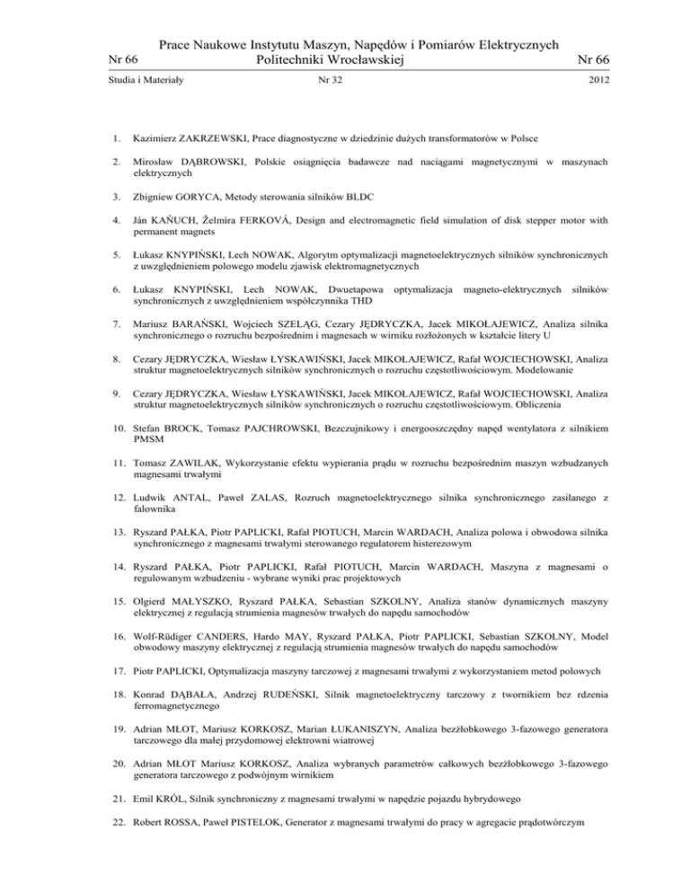 Nr 66 Prace Naukowe Instytutu Maszyn, Napędów i Pomiarów Elektrycznych Politechniki Wrocławskiej Studia i Materiały Nr 66 Nr 32 2012 1. Kazimierz ZAKRZEWSKI, Prace diagnostyczne w dziedzinie dużych transformatorów w Polsce 2. Mirosław DĄBROWSKI, Polskie osiągnięcia badawcze nad naciągami magnetycznymi w maszynach elektrycznych 3. Zbigniew GORYCA, Metody sterowania silników BLDC 4. Ján KAŇUCH, Želmíra FERKOVÁ, Design and electromagnetic field simulation of disk stepper motor with permanent magnets 5. Łukasz KNYPIŃSKI, Lech NOWAK, Algorytm optymalizacji magnetoelektrycznych silników synchronicznych z uwzględnieniem polowego modelu zjawisk elektromagnetycznych 6. Łukasz KNYPIŃSKI, Lech NOWAK, Dwuetapowa synchronicznych z uwzględnieniem współczynnika THD 7. Mariusz BARAŃSKI, Wojciech SZELĄG, Cezary JĘDRYCZKA, Jacek MIKOŁAJEWICZ, Analiza silnika synchronicznego o rozruchu bezpośrednim i magnesach w wirniku rozłożonych w kształcie litery U 8. Cezary JĘDRYCZKA, Wiesław ŁYSKAWIŃSKI, Jacek MIKOŁAJEWICZ, Rafał WOJCIECHOWSKI, Analiza struktur magnetoelektrycznych silników synchronicznych o rozruchu częstotliwościowym. Modelowanie 9. Cezary JĘDRYCZKA, Wiesław ŁYSKAWIŃSKI, Jacek MIKOŁAJEWICZ, Rafał WOJCIECHOWSKI, Analiza struktur magnetoelektrycznych silników synchronicznych o rozruchu częstotliwościowym. Obliczenia optymalizacja magneto-elektrycznych silników 10. Stefan BROCK, Tomasz PAJCHROWSKI, Bezczujnikowy i energooszczędny napęd wentylatora z silnikiem PMSM 11. Tomasz ZAWILAK, Wykorzystanie efektu wypierania prądu w rozruchu bezpośrednim maszyn wzbudzanych magnesami trwałymi 12. Ludwik ANTAL, Paweł ZALAS, Rozruch magnetoelektrycznego silnika synchronicznego zasilanego z falownika 13. Ryszard PAŁKA, Piotr PAPLICKI, Rafał PIOTUCH, Marcin WARDACH, Analiza polowa i obwodowa silnika synchronicznego z magnesami trwałymi sterowanego regulatorem histerezowym 14. Ryszard PAŁKA, Piotr PAPLICKI, Rafał PIOTUCH, Marcin WARDACH, Maszyna z magnesami o regulowanym wzbudzeniu - wybrane wyniki prac projektowych 15. Olgierd MAŁYSZKO, Ryszard PAŁKA, Sebastian SZKOLNY, Analiza stanów dynamicznych maszyny elektrycznej z regulacją strumienia magnesów trwałych do napędu samochodów 16. Wolf-Rüdiger CANDERS, Hardo MAY, Ryszard PAŁKA, Piotr PAPLICKI, Sebastian SZKOLNY, Model obwodowy maszyny elektrycznej z regulacją strumienia magnesów trwałych do napędu samochodów 17. Piotr PAPLICKI, Optymalizacja maszyny tarczowej z magnesami trwałymi z wykorzystaniem metod polowych 18. Konrad DĄBAŁA, Andrzej RUDEŃSKI, Silnik magnetoelektryczny tarczowy z twornikiem bez rdzenia ferromagnetycznego 19. Adrian MŁOT, Mariusz KORKOSZ, Marian ŁUKANISZYN, Analiza bezżłobkowego 3-fazowego generatora tarczowego dla małej przydomowej elektrowni wiatrowej 20. Adrian MŁOT Mariusz KORKOSZ, Analiza wybranych parametrów całkowych bezżłobkowego 3-fazowego generatora tarczowego z podwójnym wirnikiem 21. Emil KRÓL, Silnik synchroniczny z magnesami trwałymi w napędzie pojazdu hybrydowego 22. Robert ROSSA, Paweł PISTELOK, Generator z magnesami trwałymi do pracy w agregacie prądotwórczym Nr 66 Prace Naukowe Instytutu Maszyn, Napędów i Pomiarów Elektrycznych Politechniki Wrocławskiej Studia i Materiały Nr 66 Nr 32 2012 23. Robert ROSSA, Tomasz WOLNIK, Obliczenia charakterystyk obciążenia prądnic synchronicznych z magnesami trwałymi – porównanie wyników szybkiej metody polowo-obwodowej z wynikami analizy MES dla stanów przejściowych 24. Tomasz WOLNIK, Tadeusz GLINKA, Weryfikacja metod obliczeniowych silników tarczowych z magnesami trwałymi 25. Piotr BOGUSZ, Mariusz KORKOSZ, Adam MAZURKIEWICZ, Jan PROKOP, Modelowanie maszyny SRM jako układu o zmiennych indukcyjnościach przy użyciu programu PSpice 26. Piotr BOGUSZ, Mariusz KORKOSZ, Jan PROKOP, Silnik reluktancyjny przełączalny przeznaczony do napędu małego mobilnego pojazdu elektrycznego 27. Piotr BOGUSZ, Mariusz KORKOSZ, Jan PROKOP, Piotr WYGONIK, Badania laboratoryjne napędu hybrydowego bezzałogowego aparatu latającego 28. Piotr BOGUSZ, Mariusz KORKOSZ, Jan PROKOP, Piotr WYGONIK, Badania silnika BLDC przeznaczonego do hybrydowego napędu bezzałogowego aparatu latającego 29. Piotr BOGUSZ, Mariusz KORKOSZ, Jan PROKOP, Badania symulacyjne silników reluktancyjnych przełączalnych przeznaczonych do napędu wysokoobrotowego 30. Tomasz WĘGIEL, Model generatora synchronicznego z magnesami trwałymi współpracującego z przekształtnikowym układem generacyjnym 31. Wiesław JAŻDŻYNSKI, Martin BAJEK, A comparison of operation properties of a high-efficiency squirrelcage induction motor and LSPMSM 32. Zbigniew GORYCA, Mariusz MALINOWSKI, Artur PAKOSZ, Wpływ kompensacji indukcyjności uzwojenia na napięcie wyjściowe wolnoobrotowej prądnicy do elektrowni wiatrowej 33. Marek CIURYS, Manswet BAŃKA, Ignacy DUDZIKOWSKI, Prądnica trójfazowa małej mocy wzbudzana magnesami trwałymi 34. Marek CIURYS, Ignacy DUDZIKOWSKI, Paweł KMIEĆ, Analiza wpływu sposobu namagnesowania magnesów na przebiegi czasowe wielkości elektrycznych i mechanicznych w silniku bezszczotkowym 35. Maciej GWOŹDZIEWICZ, Jan ZAWILAK, Influence of the permanent magnets arrangement on the singlephase line start permanent magnet synchronous motor performances 36. Filip KUTT, Grzegorz KOSTRO, Michał MICHNA, Mieczysław RONKOWSKI, Study of prototype multi-pole non-salient field winding for high speed brushless synchronous generator 37. Jerzy PODHAJECKI, Sławomir SZYMANIEC, Wpływ warunków brzegowych na formę odkształceń drgań własnych i wymuszonych stojana silnika BLDC. Analiza numeryczna 38. Jerzy PODHAJECKI, Sławomir SZYMANIEC, Wpływ ekscentryczności statycznej wirnika i niejednakowego namagnesowania magnesów na postać deformacji stojana w silniku BLDC 39. Andrzej SIKORA, Adam ZIELONKA, Stanowisko do badania silnika BLDC z możliwością zadania prędkości i momentu obciążenia 40. Zdzisław KRZEMIEŃ