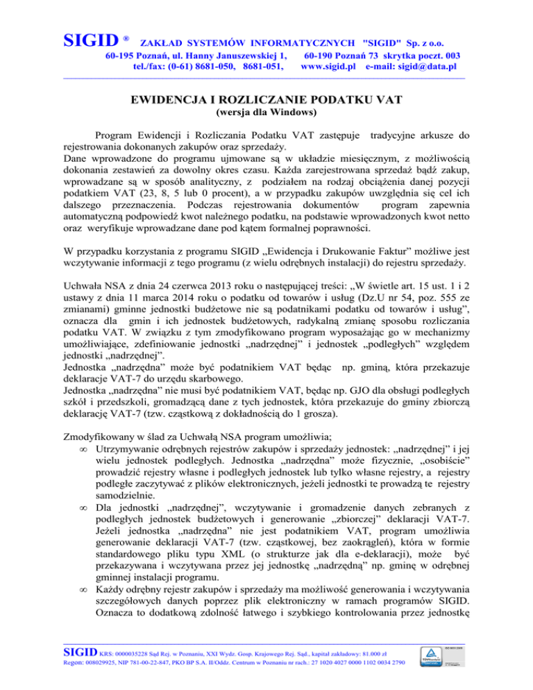 SIGID ® ZAKŁAD SYSTEMÓW INFORMATYCZNYCH "SIGID" Sp. z o.o. 60-195 Poznań, ul. Hanny Januszewskiej 1, 60-190 Poznań 73 skrytka poczt. 003 tel./fax: (0-61) 8681-050, 8681-051, www.sigid.pl e-mail: [email protected] _____________________________________________________________________________________________________ EWIDENCJA I ROZLICZANIE PODATKU VAT (wersja dla Windows) Program Ewidencji i Rozliczania Podatku VAT zastępuje tradycyjne arkusze do rejestrowania dokonanych zakupów oraz sprzedaży. Dane wprowadzone do programu ujmowane są w układzie miesięcznym, z możliwością dokonania zestawień za dowolny okres czasu. Każda zarejestrowana sprzedaż bądź zakup, wprowadzane są w sposób analityczny, z podziałem na rodzaj obciążenia danej pozycji podatkiem VAT (23, 8, 5 lub 0 procent), a w przypadku zakupów uwzględnia się cel ich dalszego przeznaczenia. Podczas rejestrowania dokumentów program zapewnia automatyczną podpowiedź kwot należnego podatku, na podstawie wprowadzonych kwot netto oraz weryfikuje wprowadzane dane pod kątem formalnej poprawności. W przypadku korzystania z programu SIGID „Ewidencja i Drukowanie Faktur” możliwe jest wczytywanie informacji z tego programu (z wielu odrębnych instalacji) do rejestru sprzedaży. Uchwała NSA z dnia 24 czerwca 2013 roku o następującej treści: „W świetle art. 15 ust. 1 i 2 ustawy z dnia 11 marca 2014 roku o podatku od towarów i usług (Dz.U nr 54, poz. 555 ze zmianami) gminne jednostki budżetowe nie są podatnikami podatku od towarów i usług”, oznacza dla gmin i ich jednostek budżetowych, radykalną zmianę sposobu rozliczania podatku VAT. W związku z tym zmodyfikowano program wyposażając go w mechanizmy umożliwiające, zdefiniowanie jednostki „nadrzędnej” i jednostek „podległych” względem jednostki „nadrzędnej”. Jednostka „nadrzędna” może być podatnikiem VAT będąc np. gminą, która przekazuje deklaracje VAT-7 do urzędu skarbowego. Jednostka „nadrzędna” nie musi być podatnikiem VAT, będąc np. GJO dla obsługi podległych szkół i przedszkoli, gromadzącą dane z tych jednostek, która przekazuje do gminy zbiorczą deklarację VAT-7 (tzw. cząstkową z dokładnością do 1 grosza). Zmodyfikowany w ślad za Uchwałą NSA program umożliwia; • Utrzymywanie odrębnych rejestrów zakupów i sprzedaży jednostek: „nadrzędnej” i jej wielu jednostek podległych. Jednostka „nadrzędna” może fizycznie, „osobiście” prowadzić rejestry własne i podległych jednostek lub tylko własne rejestry, a rejestry podległe zaczytywać z plików elektronicznych, jeżeli jednostki te prowadzą te rejestry samodzielnie. • Dla jednostki „nadrzędnej”, wczytywanie i gromadzenie danych zebranych z podległych jednostek budżetowych i generowanie „zbiorczej” deklaracji VAT-7. Jeżeli jednostka „nadrzędna” nie jest podatnikiem VAT, program umożliwia generowanie deklaracji VAT-7 (tzw. cząstkowej, bez zaokrągleń), która w formie standardowego pliku typu XML (o strukturze jak dla e-deklaracji), może być przekazywana i wczytywana przez jej jednostkę „nadrzędną” np. gminę w odrębnej gminnej instalacji programu. • Każdy odrębny rejestr zakupów i sprzedaży ma możliwość generowania i wczytywania szczegółowych danych poprzez plik elektroniczny w ramach programów SIGID. Oznacza to dodatkową zdolność łatwego i szybkiego kontrolowania przez jednostkę _____________________________________________________________________________________________________ SIGID KRS: 0000035228 Sąd Rej. w Poznaniu, XXI Wydz. Gosp. Krajowego Rej. Sąd., kapitał zakładowy: 81.000 zł Regon: 008029925, NIP 781-00-22-847, PKO BP S.A. II/Oddz. Centrum w Poznaniu nr rach.: 27 1020 4027 0000 1102 0034 2790 „nadrzędną” zapisów powstających w jednostkach podległych, o ile pracują na programach SIGID. Opisane powyżej rozwiązanie dotyczy sytuacji, gdy zarówno jednostka „nadrzędna”, jak i jednostka „podrzędna”, korzystają z programu „Ewidencji zakupów i sprzedaży VAT” firmy SIGID. W sytuacji, gdy jednostka podległa korzysta z programu innej firmy i program ten umożliwia wygenerowanie deklaracji VAT-7 (bez zaokrągleń), w formie pliku XML, (wg standardu jak dla e-deklaracji), jest możliwe zaimportowanie takiego pliku przez nasz program obsługujący jednostkę „nadrzędną”. W sytuacji, gdy jednostka podległa nie posiada programu, będzie możliwe przekazanie danych (rejestrów) w formie „papierowej” i wprowadzenie ich w formie sumarycznej lub szczegółowej do zbiorczego rejestru VAT SIGID. Zatem podsumowując - program umożliwia: • pełną ewidencję zakupów i sprzedaży prowadzoną w układzie miesięcznym lub kwartalnym, • odrębne rejestry dla jednostek: „nadrzędnej” i wielu podległych, • wczytywanie do rejestru sprzedaży, danych (faktur i uznań) z programu „Ewidencja i Drukowanie Faktur” SIGID , z jednej lub z wielu odrębnych instalacji, • transfer danych z jednostek podległych do instalacji centralnej (deklaracja VAT-7 cząstkowa, rejestry zakupów i sprzedaży • wydruk zestawień z poszczególnych rejestrów za dowolny miesiąc oraz za dowolny dłuższy okres, dla jednej lub zbiorczo dla wielu jednostek, • rozliczenie podatku VAT naliczonego z wykorzystaniem współczynnika struktury sprzedaży oraz tzw. "prewspółczynnika", z możliwością podziału na klasyfikacje budżetowe • wyznaczanie wynikowej struktury sprzedaży, automatyczne rozliczanie rocznych korekt związanych ze strukturą sprzedaży oraz tzw. "prewspółczynnikiem", • przygotowanie i wydruk deklaracji VAT-7, VAT-7D lub VAT-7K, • przygotowanie i wydruk zbiorczej deklaracji VAT-7 (obejmującej również jednostki podległe). • generowanie Jednolitego Pliku Kontrolnego dla jednostki nadrzędnej, dla jednostek podległych lub zbiorczego obejmującego jednostkę nadrzędną i jednostki podległe łącznie, wraz ze szczeg
