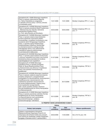 SPRAWOZDANIE GIP Z DZIAŁALNOŚCI PIP W 2008 r. Zarządzenie Nr 1/2008 Głównego Inspektora Pracy w sprawie ustanowienia Nagrody im. Haliny Krahelskiej za osiągnięcia w zakresie ochrony pracy i ochrony zdrowia w środowisku pracy 10.01.2008 10.01.2008 Biuletyn Urzędowy PIP nr 1, poz. 4 Zarządzenie Nr 13/2008 Głównego Inspektora Pracy w sprawie powołania Rady Programowo – Metodycznej przy Ośrodku Szkolenia Państwowej Inspekcji Pracy im. Prof. Jana Rosnera we Wrocławiu 28.05.2008 28.05.2008 Biuletyn Urzędowy PIP nr 2, poz. 17 Zarządzenie Nr 15/2008 Głównego Inspektora Pracy w sprawie zasad przeprowadzania kontroli zgodności wykonania obiektu budowlanego z projektem budowlanym oraz wyrażania opinii Okręgowego Inspektora Pracy w sprawie zgody Państwowego Wojewódzkiego Inspektora Sanitarnego na obniżenie poziomu podłogi poniżej otaczającego terenu oraz zastosowania oświetlenia wyłącznie elektrycznego w pomieszczeniu stałej pracy 06.06.2008 06.06.2008 Biuletyn Urzędowy PIP Nr 2, poz. 18 Zarządzenie Nr 23/2008 Głównego Inspektora Pracy w sprawie zasad badania okoliczności i przyczyn wypadków przy pracy oraz kontroli stosowania przez pracodawców środków zapobiegających tym wypadkom 01.07.2008 01.07.2008 Biuletyn Urzędowy PIP Nr 3 poz. 24 Zarządzenie Nr 37/2008 Głównego Inspektora Pracy w sprawie powołania Rady do Spraw Bezpieczeństwa Pracy w Budownictwie przy Głównym Inspektorze Pracy oraz sposobu finansowania jej działalności 18.09.2008 18.09.2008 Biuletyn Urzędowy PIP Nr 3 poz. 38 Zarządzenie Nr 40/2008 Głównego Inspektora Pracy w sprawie ustalenia zasad ponoszenia kosztów związanych z przygotowaniem kandydatów na rzeczoznawców, podnoszeniem kwalifikacji przez rzeczoznawców oraz nadawania uprawnień rzeczoznawcom do spraw bezpieczeństwa i higieny pracy oraz wypłacania wynagrodzenia, diet i zwrotu kosztów podróży członkom Komisji Kwalifikacyjnej do Oceny Kandydatów na Rzeczoznawców 30.10.2008 30.10.2008 Biuletyn Urzędowy PIP Nr 3 poz. 41 Zarządzenie Nr 41/2008 Głównego Inspektora Pracy w sprawie powołania członków Komisji Kwalifikacyjnej do Oceny Kandydatów na Rzeczoznawców oraz wyznaczenia jej przewodniczącego, zastępcy przewodniczącego i sekretarza 30.10.2008 30.10.2008 Biuletyn Urzędowy PIP Nr 3 poz. 42 B. PRZEPISY NOWO USTANOWIONE W 2008 R. Ustawy Rodzaj i tytuł przepisu Ustawa o wypowiedzeniu Konwencji Międzynarodowej Organizacji Pracy Nr 45 dotyczącej zatrudniania kobiet przy pracach pod ziemią we wszelkiego rodzaju kopalniach, przyjętej w Genewie dnia 21 czerwca1935 r. 234 Data uchwalenia Data obowiązywania 28.03.2008 14.05.2008 Miejsce opublikowania Dz.U. Nr 72, poz. 418 ZAŁĄCZNIKI Ustawa o uczestnictwie pracowników w spółce powstałej w wyniku transgranicznego połączenia się spółek 25.04.2008 20.06.2008 Dz.U. Nr 86, poz. 525 Ustawa o ratyfikacji Konwencji nr 181 Międzynarodowej Organizacji Pracy dotyczącej prywatnych biur pośrednictwa pracy, przyjętej w Genewie w dniu 19 czerwca 1997 r. 11.04.2008 14.06.2008 Dz.U. Nr 93, poz. 581 Ustawa o odpadach wydobywczych 10.07.2008 15.08.2008 01.05.2012 Dz.U. Nr 138, poz. 865 Rozporządzenia Data uchwalenia Data obowiązywania Rozporządzenie Ministra Gospodarki uchylające rozporządzenie w sprawie bezpieczeństwa i higieny pracy w przemyśle włókien sztucznych wiskozowych 11.02.2008 11.03.2008 Dz.U. Nr 30, poz. 177 Rozporządzenie Ministra Pracy i Polityki Społecznej w sprawie wzoru i sposobu przekazywania przez wojewodę zbiorczych informacji półrocznych dotyczących wydanych decyzji oraz stanu zatrudnienia w zakładach pracy chronionej i zakładach aktywności zawodowej 12.02.2008 11.03.2008 Dz.U. Nr 30, poz. 180 Rozporządzenie Rady Ministrów w sprawie działań podejmowanych w związku z zatrzymaniem wyrobów, co do których istnieją uzasadnione okoliczności wskazujące, że nie spełniają one zasadniczych lub innych wymagań 12.02.2008 21.03.2008 Dz.U. Nr 38, poz. 215 Rozporządzenie Prezesa Rady Ministrów w sprawie wykazu schorzeń i chorób powstałych w związku ze szczególnymi właściwościami lub warunkami służby w Centralnym Biurze Antykorupcyjnym 18.03.2008 12.04.2008 Dz.U. Nr 53, poz. 315 Rozporządzenie Ministra Obrony Narodowej uchylające rozporządzenie w sprawie warunków technicznych dozoru technicznego, jakim powinny odpowiadać wojskowe podziemne zbiorniki do magazynowania paliw płynnych 13.03.2008 12.04.2008 Dz.U. Nr 53, poz. 322 Rozporządzenie Ministra Pracy i Polityki Społecznej w sprawie trybu i sposobu przeprowadzania kontroli przez organy upoważnione do kontroli na podstawie ustawy o rehabilitacji zawodowej i społecznej oraz zatrudnianiu osób niepełnosprawnych 14.03.2008 12.04.2008 Dz.U. Nr 53, poz. 323 Rozporządzenie Ministra Gospodarki w sprawie sposobu ewidencjonowania przez pracodawców okresów zatrudnienia na stanowiskach, na których okresy pracy górniczej zalicza się w wymiarze półtorakrotnym przy ustalaniu prawa do górniczej emerytury, oraz na niektórych innych stanowiskach pracy górniczej 31.03.2008 29.04.2008 Dz.U. Nr 72, poz. 423 Rozporządzenie Ministra Obrony Narodowej uchylające rozporządzenie w sprawie sposobu tworzenia i gromadzenia środków zakładowego funduszu świadczeń socjalnych pracowników cywilnych wojska oraz wysokości odpisu na ten fundusz 21.04.2008 29.04.2008 Dz.U. Nr 73, poz. 433 Rodzaj i tytuł przepisu Miejsce opublikowania 235 SPRAWOZDANIE GIP Z DZIAŁALNOŚCI PIP W 2008 r. 236 Rozporządzenie Ministra Pracy i Polityki Społecznej w sprawie warunków wynagradzania za pracę i przyznawania innych świadczeń związanych z pracą dla niektórych pracowników cywilnych więziennictwa 22.04.2008 01.01.2008 Dz.U. Nr 73, poz. 434 Rozporządzenie Ministra Pracy i Polityki Społecznej w sprawie ustalenia wysokości wynagrodzenia za pracę i przyznawania innych świadczeń związanych z pracą dla pracowników Polskiego Komitetu Normalizacyjnego 23.04.2008 01.01
