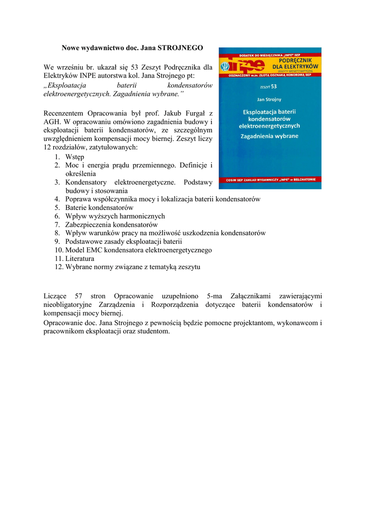 Nowe wydawnictwo doc. Jana STROJNEGO We wrześniu br. ukazał się 53 Zeszyt Podręcznika dla Elektryków INPE autorstwa kol. Jana Strojnego pt: „Eksploatacja baterii kondensatorów elektroenergetycznych. Zagadnienia wybrane.” Recenzentem Opracowania był prof. Jakub Furgał z AGH. W opracowaniu omówiono zagadnienia budowy i eksploatacji baterii kondensatorów, ze szczególnym uwzględnieniem kompensacji mocy biernej. Zeszyt liczy 12 rozdziałów, zatytułowanych: 1. Wstęp 2. Moc i energia prądu przemiennego. Definicje i określenia 3. Kondensatory elektroenergetyczne. Podstawy budowy i stosowania 4. Poprawa współczynnika mocy i lokalizacja baterii kondensatorów 5. Baterie kondensatorów 6. Wpływ wyższych harmonicznych 7. Zabezpieczenia kondensatorów 8. Wpływ warunków pracy na możliwość uszkodzenia kondensatorów 9. Podstawowe zasady eksploatacji baterii 10. Model EMC kondensatora elektroenergetycznego 11. Literatura 12. Wybrane normy związane z tematyką zeszytu Liczące 57 stron Opracowanie uzupełniono 5-ma Załącznikami zawierającymi nieobligatoryjne Zarządzenia i Rozporządzenia dotyczące baterii kondensatorów i kompensacji mocy biernej. Opracowanie doc. Jana Strojnego z pewnością będzie pomocne projektantom, wykonawcom i pracownikom eksploatacji oraz studentom.