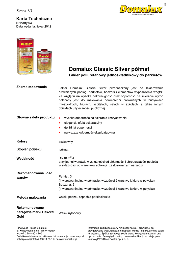 Strona 1/3 Karta Techniczna Nr Karty 03 Data wydania: lipiec 2012 Domalux Classic Silver półmat Lakier poliuretanowy jednoskładnikowy do parkietów Zakres stosowania Lakier Domalux Classic Silver przeznaczony jest do lakierowania drewnianych podłóg, parkietów, boazerii i elementów wyposażenia wnętrz. Ze względu na wysoką dekoracyjność oraz odporność na ścieranie wyrób polecany jest do malowania powierzchni drewnianych w budynkach mieszkalnych, biurach, szpitalach, salach w szkołach, a także innych obiektach użyteczności publicznej. Główne zalety produktu wysoka odporność na ścieranie i zarysowania elegancki efekt dekoracyjny do 15 lat odporności najwyższa odporność eksploatacyjna Kolory bezbarwny Stopień połysku półmat Wydajność Do 10 m /l przy jednej warstwie w zależności od chłonności i chropowatości podłoża w zależności od warunków aplikacji i zastosowanych narzędzi Rekomendowana ilość warstw 2 Parkiet: 3 (1 warstwa finalna w półmacie, wcześniej 2 warstwy lakieru w połysku) Boazeria: 2 (1 warstwa finalna w półmacie, wcześniej 1 warstwa lakieru w połysku) Metoda malowania wałek, pędzel, szpachla parkieciarska Rekomendowane narzędzia marki Dekoral Gold Wałek nylonowy PPG Deco Polska Sp. z o.o. ul. Kwidzyńska 8; 51- 416 Wrocław tel. (071) 78 – 80 – 700 Dodatkowe informacje i aktualna dokumentacja dostępna pod nr bezpłatnej infolinii 800 11 33 11 i na www.domalux.pl Informacje znajdujące się w niniejszej Karcie Technicznej są przygotowane według naszej najlepszej wiedzy i są aktualne na dzień jej wydruku. Spółka zastrzega sobie prawo korygowania zmian bez uprzedzenia. Ze względu na to, iż warunki aplikacji pozostają poza kontrolą PPG Deco Polska Sp. z o. o. Strona 2/3 Limit zawartości LZO wg dyrektywy 2004/42/WE (kat. A/i/FR) 500g/l (2010). Produkt zawiera max. 500 g/l. Zawartość LZO Parametry techniczne Norma/Wytyczne Wartość Ilość warstw --------------------------- 1-2 połysk + 1 półmat Nanoszenie kolejnej warstwy po ok. [h] ---------------------------- po 12 Czas schnięcia powierzchniowego [h], najwyżej PN EN ISO 1517 3 4 Gęstość w 20±0,5C, [g/cm ] PN-EN ISO 2811-1 Rozlewność, stopień, co najmniej PN-C-81507 8 PN-C-81701 20÷35 PN-EN ISO 1518 1000 Czas wypływu mierzony kubkiem wypływowym z dnem, stożkowym o średnicy otworu wypływowego4 mm, [s] Odporność powłoki na zarysowanie, [g], co najmniej Współczynnik tarcia kinetycznego (statycznego) μ w stanie suchym, „połysk” zgodnie z DIN V 180322: 2001-04, co najmniej Przygotowanie podłoża DIN EN-ISO/IE 17025:2005 1,000 ÷1,020 0,4 ÷ 0,6 Powierzchnie drewniane przeznaczone do lakierowania powinny być czyste i suche bez pozostałości np. past woskowych i środków nabłyszczających. Stare powłoki lakierowe należy usunąć a powierzchnię dokładnie odpylić. W celu zabezpieczenia podłoża przed ciemnieniem należy zagruntować lakierem podkładowym wiążącym Domalux Capon Extra. Tak przygotowane podłoże nadaje się do lakierowania lakierem Domalux Classic Silver połysk w ilości dwóch warstw (wskazówki dotyczące lakierowania lakierem Domalux Classic Silver połysk można znaleźć w KT tego produktu). Po wyschnięciu drugiej warstwy lakieru Domalux Classic Silver połysk należy wykonać szlif międzywarstwowy papierem ściernym o granulacji 120 – 150 w celu usunięcia ewentualnych zanieczyszczeń. Kolejnym etapem prac jest przygotowanie pomieszczenia do wykonania aplikacji lakieru w wersji półmat, czyli dokładne sprzątanie oraz zabezpieczenia pomieszczenia przed możliwością powstania „przeciągów”, które przyczyniają się do pojawiania się zanieczyszczeń, „chrupek” widocznych po wyschnięciu na powłoce lakieru. W tym celu w pomieszczeniu, w którym przeprowadzane są prace lakiernicze należy pozamykać okna, drzwi, itp. Jeżeli pomieszczenie nie posiada drzwi wejściowych należy zabezpieczyć wejście poprzez zaklejenie folią malarską. PPG Deco Polska Sp. z o.o. ul. Kwidzyńska 8; 51- 416 Wrocław tel. (071) 78 – 80 – 700 Dodatkowe informacje i aktualna dokumentacja dostępna pod nr bezpłatnej infolinii 800 11 33 11 i na www.domalux.pl Informacje znajdujące się w niniejszej Karcie Technicznej są przygotowane według naszej najlepszej wiedzy i są aktualne na dzień jej wydruku. Spółka zastrzega sobie prawo korygowania zmian bez uprzedzenia. Ze względu na to, iż warunki aplikacji pozostają poza kontrolą PPG Deco Polska Sp. z o. o. Strona 3/3 Lakierowanie Przed użyciem lakier należy wymieszać poprzez kilkakrotne silne wytrząsanie w zamkniętym opakowaniu. W razie potrzeby dopuszcza się dodatek rozpuszczalnika w ilości max 2% obj. Rozcieńczalnik należy dodawać bezpośrednio przed aplikacją. Do lakierowania najkorzystniej stosować wałki lakiernicze nylonowe, odporne na działanie rozpuszczalników. W przypadku stosowania lakieru w wersji półmatowej dwie pierwsze warstwy zaleca się wykonać lakierem Domalux Classic Silver połysk. Aplikacja Lakieru Domalux Classic Silver w wersji półmat Ilość lakieru na mokro 2 Produkt [ml/m ] Capon do 100 Domalux Classic Silver połysk min. 100 Domalux Classic Silver połysk min. 100 Domalux Classic Silver półmat 130 - 150 Warunki aplikacji Temperatura powietrza powinna wynosić od 15 °C do 25 °C. Wilgotność lakierowanego drewna powinna być nie większa niż 9 %. Względna wilgotność powietrza od 40 % do 65 %. Informacje dodatkowe Domalux Classic Silver półmat nie może być stosowany w salach gimnastycznych. Naturalną tendencją lakierów półmatowych poliuretanowych jest wypływanie lub osadzanie się wosku na ściankach opakowania, co nie wpływa, na jakość i trwałość finalnej powłoki. Niedostateczne wietrzenie pomieszczeń w czasie lakierowania i przez 2-3 dni po zakończeniu prac może spowodować powstanie przebarwień na ścianach i sufitach świeżych powłok farb emulsyjnych. Zaleca się ostatecz
