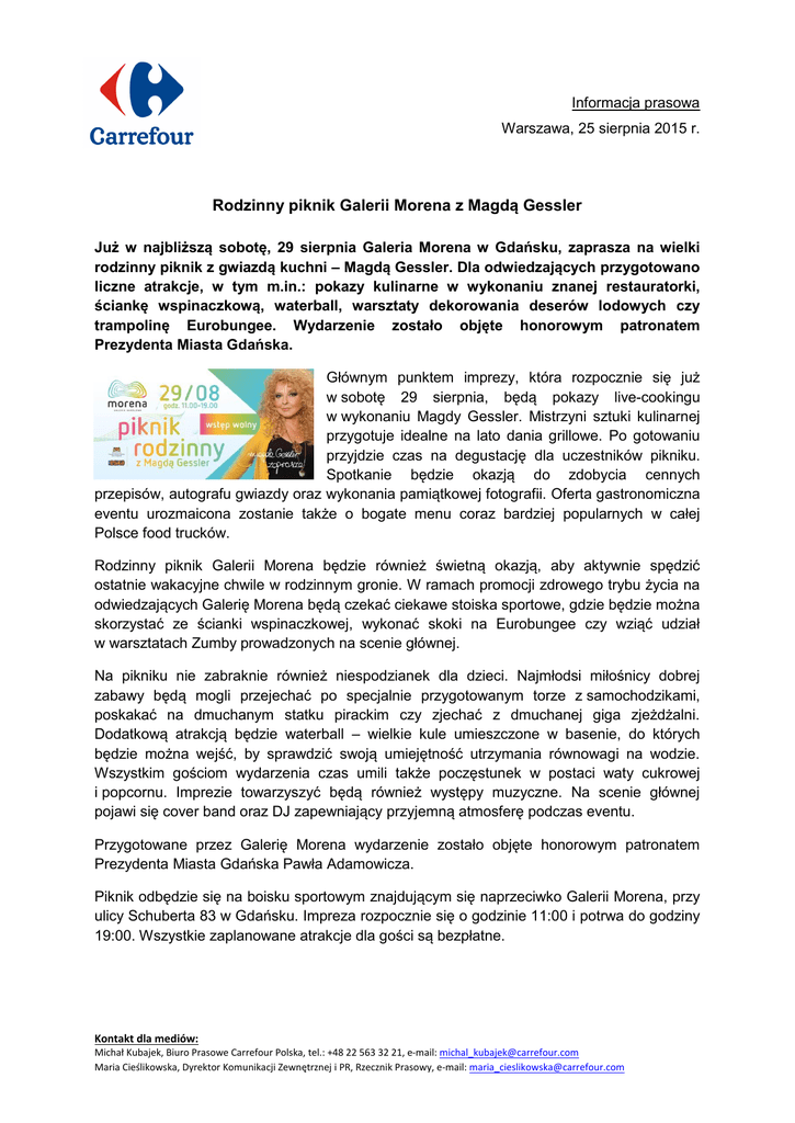 Informacja prasowa Warszawa, 25 sierpnia 2015 r. Rodzinny piknik Galerii Morena z Magdą Gessler Już w najbliższą sobotę, 29 sierpnia Galeria Morena w Gdańsku, zaprasza na wielki rodzinny piknik z gwiazdą kuchni – Magdą Gessler. Dla odwiedzających przygotowano liczne atrakcje, w tym m.in.: pokazy kulinarne w wykonaniu znanej restauratorki, ściankę wspinaczkową, waterball, warsztaty dekorowania deserów lodowych czy trampolinę Eurobungee. Wydarzenie zostało objęte honorowym patronatem Prezydenta Miasta Gdańska. Głównym punktem imprezy, która rozpocznie się już w sobotę 29 sierpnia, będą pokazy live-cookingu w wykonaniu Magdy Gessler. Mistrzyni sztuki kulinarnej przygotuje idealne na lato dania grillowe. Po gotowaniu przyjdzie czas na degustację dla uczestników pikniku. Spotkanie będzie okazją do zdobycia cennych przepisów, autografu gwiazdy oraz wykonania pamiątkowej fotografii. Oferta gastronomiczna eventu urozmaicona zostanie także o bogate menu coraz bardziej popularnych w całej Polsce food trucków. Rodzinny piknik Galerii Morena będzie również świetną okazją, aby aktywnie spędzić ostatnie wakacyjne chwile w rodzinnym gronie. W ramach promocji zdrowego trybu życia na odwiedzających Galerię Morena będą czekać ciekawe stoiska sportowe, gdzie będzie można skorzystać ze ścianki wspinaczkowej, wykonać skoki na Eurobungee czy wziąć udział w warsztatach Zumby prowadzonych na scenie głównej. Na pikniku nie zabraknie również niespodzianek dla dzieci. Najmłodsi miłośnicy dobrej zabawy będą mogli przejechać po specjalnie przygotowanym torze z samochodzikami, poskakać na dmuchanym statku pirackim czy zjechać z dmuchanej giga zjeżdżalni. Dodatkową atrakcją będzie waterball – wielkie kule umieszczone w basenie, do których będzie można wejść, by sprawdzić swoją umiejętność utrzymania równowagi na wodzie. Wszystkim gościom wydarzenia czas umili także poczęstunek w postaci waty cukrowej i popcornu. Imprezie towarzyszyć będą również występy muzyczne. Na scenie głównej pojawi się cover band oraz DJ zapewniający przyjemną atmosferę podczas eventu. Przygotowane przez Galerię Morena wydarzenie zostało objęte honorowym patronatem Prezydenta Miasta Gdańska Pawła Adamowicza. Piknik odbędzie się na boisku sportowym znajdującym się naprzeciwko Galerii Morena, przy ulicy Schuberta 83 w Gdańsku. Impreza rozpocznie się o godzinie 11:00 i potrwa do godziny 19:00. Wszystkie zaplanowane atrakcje dla gości są bezpłatne. Kontakt dla mediów: Michał Kubajek, Biuro Prasowe Carrefour Polska, tel.: +48 22 563 32 21, e-mail: [email protected] Maria Cieślikowska, Dyrektor Komunikacji Zewnętrznej i PR, Rzecznik Prasowy, e-mail: [email protected] __________________________________________________________________________ O Carrefour Carrefour Polska to multiformatowa sieć handlowa, pod której szyldem działa obecnie ponad 750 sklepów w takich formatach jak: hipermarkety, supermarkety oraz sklepy osiedlowe. Spółka jest również właścicielem i zarządcą sieci centrów handlowych o łącznej powierzchni ponad 230 000 GLA oraz kilkudziesięciu stacji paliw. Kontakt dla mediów: Michał Kubajek, Biuro Prasowe Carrefour Polska, tel.: +48 22 563 32 21, e-mail: [email protected] Maria Cieślikowska, Dyrektor Komunikacji Zewnętrznej i PR, Rzecznik Prasowy, e-mail: [email protected]