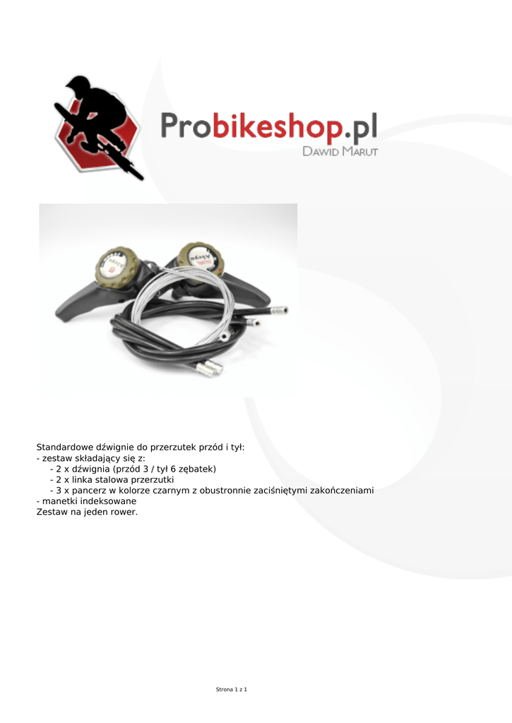 Standardowe dźwignie do przerzutek przód i tył: - zestaw składający się z: - 2 x dźwignia (przód 3 / tył 6 zębatek) - 2 x linka stalowa przerzutki - 3 x pancerz w kolorze czarnym z obustronnie zaciśniętymi zakończeniami - manetki indeksowane Zestaw na jeden rower. Strona 1 z 1