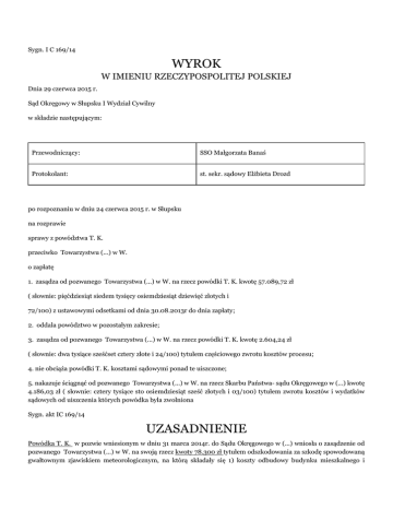 Sygn. I C 169/14 WYROK W IMIENIU RZECZYPOSPOLITEJ POLSKIEJ Dnia 29 czerwca 2015 r. Sąd Okręgowy w Słupsku I Wydział Cywilny w składzie następującym: Przewodniczący: SSO Małgorzata Banaś Protokolant: st. sekr. sądowy Elżbieta Drozd po rozpoznaniu w dniu 24 czerwca 2015 r. w Słupsku na rozprawie sprawy z powództwa T. K. przeciwko Towarzystwu (...) w W. o zapłatę 1. zasądza od pozwanego Towarzystwa (...) w W. na rzecz powódki T. K. kwotę 57.089,72 zł ( słownie: pięćdziesiąt siedem tysięcy osiemdziesiąt dziewięć złotych i 72/100) z ustawowymi odsetkami od dnia 30.08.2013r do dnia zapłaty; 2. oddala powództwo w pozostałym zakresie; 3. zasądza od pozwanego Towarzystwa (...) w W. na rzecz powódki T. K. kwotę 2.604,24 zł ( słownie: dwa tysiące sześćset cztery złote i 24/100) tytułem częściowego zwrotu kosztów procesu; 4. nie obciąża powódki T. K. kosztami sądowymi ponad te uiszczone; 5. nakazuje ściągnąć od pozwanego Towarzystwa (...) w W. na rzecz Skarbu Państwa- sądu Okręgowego w (...) kwotę 4.186,03 zł ( słownie: cztery tysiące sto osiemdziesiąt sześć złotych i 03/100) tytułem zwrotu kosztów i wydatków sądowych od uiszczenia których powódka była zwolniona Sygn. akt IC 169/14 UZASADNIENIE Powódka T. K. w pozwie wniesionym w dniu 31 marca 2014r. do Sądu Okręgowego w (...) wniosła o zasądzenie od pozwanego Towarzystwa (...) w W. na swoją rzecz kwoty 78.300 zł tytułem odszkodowania za szkodę spowodowaną gwałtownym zjawiskiem meteorologicznym, na którą składały się 1) koszty odbudowy budynku mieszkalnego i budynków gospodarczych, objęte obowiązkowym ubezpieczeniem budynków wchodzących w skład gospodarstwa od ognia i innych zdarzeń losowych - w wysokości 71.904 zł, oraz 2) koszt wykonania prywatnej ekspertyzy w kwocie 6.396 zł, z ustawowymi odsetkami od dnia 30 sierpnia 2013r. do dnia zapłaty. Ponadto powódka domagała się zasądzenie od pozwanego kosztów procesu w tym kosztów zastępstwa procesowego wg norm przepisanych. Pozwany Towarzystwo (...) w W. co do zasady nie kwestionując swojej odpowiedzialności wniósł o oddalenie powództwa w całości i zasądzenie na jego rzecz kosztów procesu w tym kosztów zastępstwa procesowego. W uzasadnieniu swojego stanowiska pozwany w stosunku do roszczenia zgłoszonego przez powódkę wywodził, iż w toku przeprowadzonego postępowania likwidacyjnego w oparciu o kosztorys sporządzony na zlecenie ubezpieczyciela i z uwzględnieniem zapisanego w polisie stopnia zużycia technicznego obiektów, wyliczona została wartość odszkodowania z tytułu szkody w budynku mieszkalnym i gospodarczych i ostatecznie wypłacono stosowne świadczenie w łącznej wysokości 51.268 zł. Sąd ustalił następujący stan faktyczny: W dniu 10 stycznia 2011r. w oparciu o złożony wniosek T. K. jako posiadacz gospodarstwa rolnego zawarła z Towarzystwem (...) w W. umowę ubezpieczenia budynków, wchodzących w skład gospodarstwa rolnego od ognia i innych zdarzeń losowych. Ubezpieczenie obejmowało okres od dnia 4 grudnia 2011 roku do dnia 3 grudnia 2012 roku i zostały nim objęte następujące budynki; 1) mieszkalny - suma ubezpieczenia 135.000 zł 2) obora - suma ubezpieczenia 13.000 zł 3) garaż - suma ubezpieczenia 9.000 zł 4) chlewnia - suma ubezpieczenia 15. 000 zł i 45.000 zł 5) stodoła - suma ubezpieczenia 8.000 zł bezsporne, nadto dowód: polisa nr (...) w aktach szkody W dniu 18 czerwca 2011r. na ternie gminy S. miało miejsce zjawisko meteorologiczne wystąpiła gwałtowna burza wraz z silną wichurą. Zaistniałe zdarzenie losowe spowodowało znaczne uszkodzenia budynków należących do powódki, zarówno budynku mieszkalnego jak budynków gospodarczych takich jak obora, stodoła i garaż. O zaistniałym zdarzeniu oraz rozmiarach szkody powódka niezwłocznie poinformowała ubezpieczyciela. bezsporne, nadto dowód: akta skody W toku postępowania likwidacyjnego ubezpieczyciel ustalił okoliczności szkody oraz uzasadnioną wysokość odszkodowania i decyzją z dnia 17 lipca 2012r. przyznał na rzecz powódki kwotę 48.513 zł. W dniu 21.06.2013 r. powódka, za pośrednictwem swojego pełnomocnika wystąpiła z odwołaniem od decyzji pozwanego i z roszczeniem o wypłatę dalszej kwoty 74.659,00 zł tytułem zwrotu kosztów koniecznych do usunięcia szkód. Swoje roszczenia powódka oparła na kosztorysie szacunkowym z określenia wartości zniszczeń do jakich doszło w budynkach powódki, sporządzonym przez Biuro (...). Kosztorys sporządzony na zlecenie powódki określał wartość szkód w majątku powódki na kwotę 123.172,00 zł. Ponadto powódka wezwała pozwanego o zwrot kosztów sporządzenia opinii w wysokości 6396 zł, która wyceniała wartość szkody W związku ze złożony, odwołaniem pozwany wypłacił dodatkową kwotę odszkodowania wysokości: 2.755 zł co ostatecznie dało kwotę 51.268,00 zł, na którą składają się: 1) kwota 37.584 zł tytułem odszkodowania za uszkodzenia w budynku mieszkalnym, gdzie ustalona wartość robót remontowo-budowlanych dla budynku mieszkalnego wynosi 63.325,00 zł, a odliczony stopień zużycia budynku to 45%, przy czym po odwołaniu się powódki pozwany przyjął, iż mając na uwadze sumę ubezpieczenia w wysokości 135.000,00 zł, przyjęty stopień zniszczeń w związku z przedmiotową szkodą budynku mieszkalnego to 27,84% 2) kwotę 5.119 zł tytułem odszkodowania za uszkodzenia w budynku gospodarczym obora, gdzie ustalona wartość robót remontowo-budowlanych dla tego budynku wynosi 51.192,00 zł, a odliczony stopień zużycia budynku to 90% 3) kwotę 7.401 zł tytułem odszkodowania za uszkodzenia w budynku gospodarczym stodoła, gdzie ustalona wartość robót remontowo-budowlanych dla tego budynku wynosi 74.008,00 zł, a odliczony stopień zużycia budynku to 90% 4) kwotę 1.164 zł tytułem odszkodowania za uszkodzenia w budynku garażu, gdzie ustalona wartość robót remontowobudowl